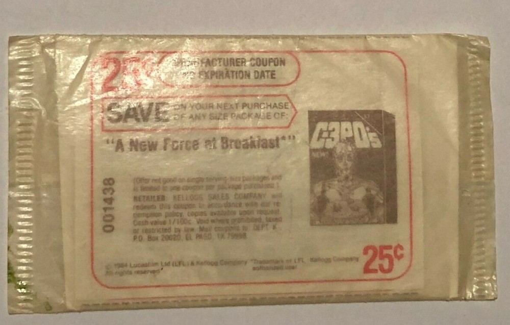 Rare Star Wars Cereal Coupon with C3PO in Original Packaging. ALSO Includes Masters of the Universe ORKO Sticker. 1984 in original sealed packaging that was inserted into Kellogg's cereal boxes. We have researched this item and learned that the coupon unfolds to show three coupons for various Kellogg's cereals. Of course, we can't be certain since the item is sealed. ALSO INCLUDED IN THIS SEALED PACKAGE is a sticker of Orko from the Masters of the Universe franchise. Extremely rare and near impossible to find double promotion for Star Wars and MOTU! Size: Packaging is approximately 4 1/4" x 2 1/4". Condition is original and unopened. See photos very carefully for condition. Please ask if you have any questions. Amazing addition to any Star Wars or MOTU collection! Shipping costs include insurance fees. Thank you for considering this item -- Super Sisters!