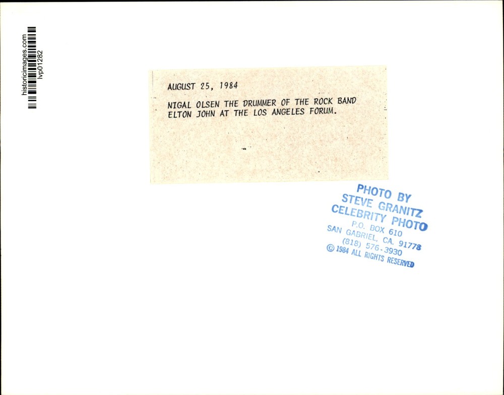 ebay template Note: Please study the images carefully to determine the condition of this vintage photograph, as it may not be in perfect condition. It may contain wrinkles, cracks, and possibly even tears due to its age and how it was handled before it got to us. A scanner may interpret colors and contrast differently than human eyes will, so it is possible that the actual photograph may be slightly darker or lighter in person. This vintage photograph is offered for sale as a collectible item and conveys no transfer of copyright. 1984 Press Photo Nigel Olsson, Drummer for Elton John, at Los Angeles Forum Nigel Olsson the drummer of the rock band Elton John at the Los Angeles Forum. Photo measures 9 x 7 inches. Photo Is dated 1984. PHOTO FRONT PHOTO BACK Historic Images Part Number: lvp01282 Sell Smarter with Kyozou. Inventory and Ecommerce Management