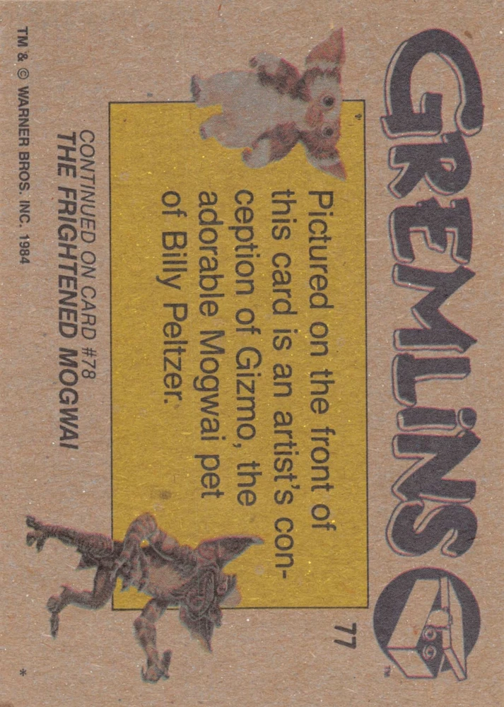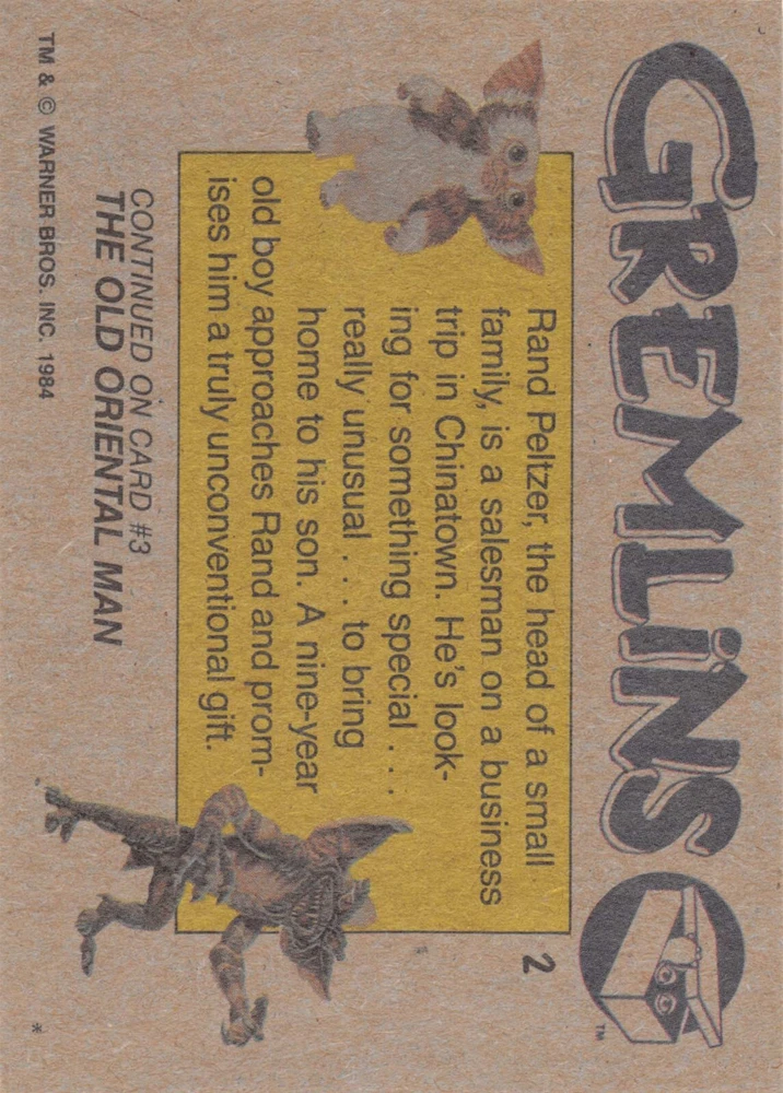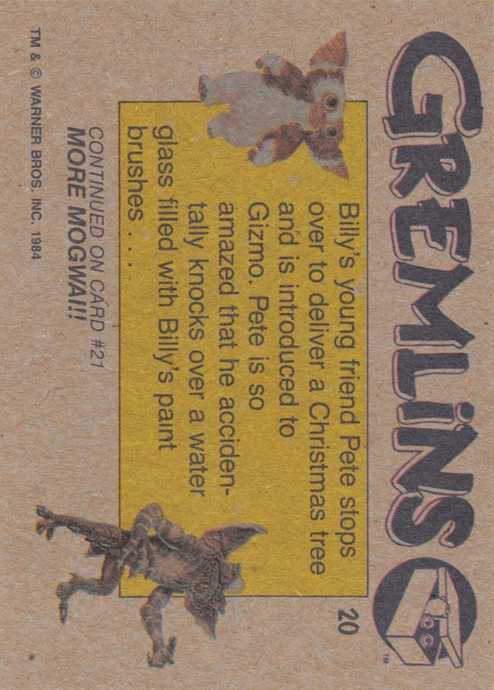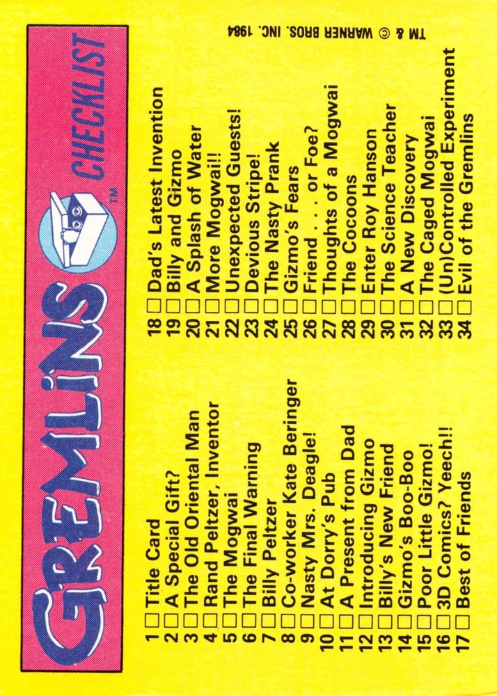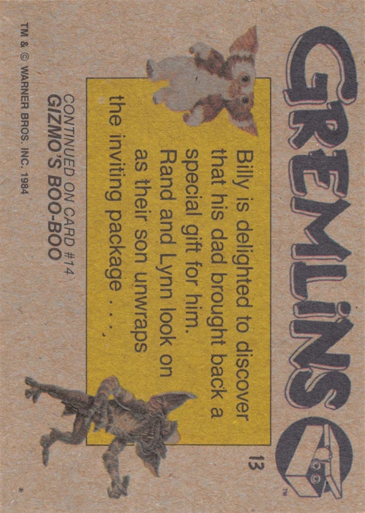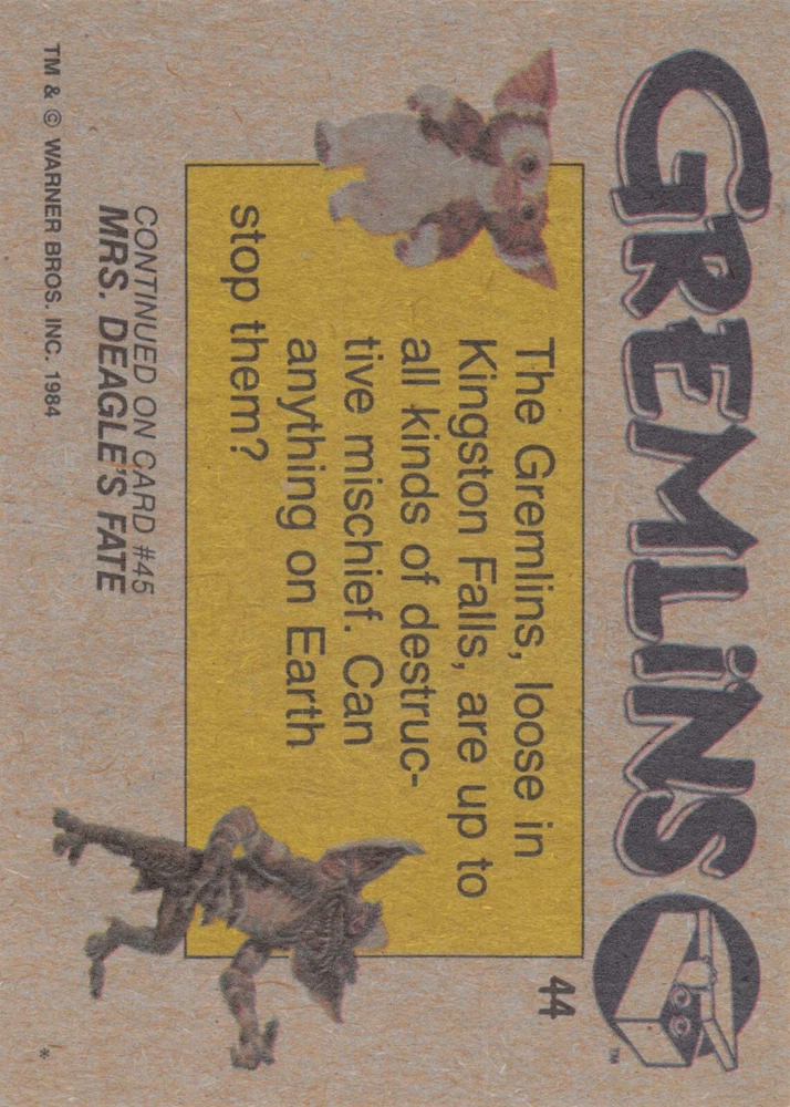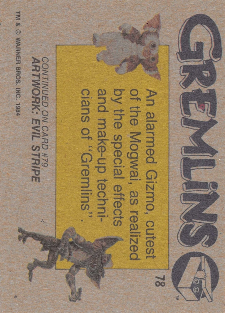 This listing is for your choice of any available 1984 Topps Gremlins card, sticker or wrapper from the drop-down menu above. Photos show front and backside of each card, be sure to scroll sideways to view front and backside photos! Any questions? Please ask before buying. International "USPS First Class Mail" will not include a tracking number for this item, if you would like a tracking number please choose the "eBay International Standard Shipping" option when you check out. As with all of my "pick-a-card" listings, I will be shipping with "eBay Standard Envelope". The rules of this envelope state that it cannot be too thick, so please expect your order to be packaged as follows: 1 to 6 cards will be slid into a single sleeve, the sleeve will then be slid inside of a semi-rigid Card-Saver. 7 to 12 cards will be slid into a double sleeve, 13 to 18 cards into a triple sleeve, 19 to 24 cards into a quadruple sleeve(up to six cards per sleeve). The double, triple and quadruple sleeve shipping will not have the Card-Saver. If you buy more than 1 card and want it packaged with more than 1 Card-Saver(or 1 sleeve per card), I kindly ask that you contact me before purchasing to be sure that this is possible to have it done with the stated shipping charge, or if additional shipping would be required. If you do not contact me, then you can expect to receive your order packaged as I have explained here. Please do not expect rigid top-loaders to be included, I don't normally keep a lot of them in stock, but if you message me prior to ordering I will be able to see if I have any that can be included with your order - additional shipping may be required. In order to get free combined shipping from this and any of my other "pick-a-card" listings, you must add all of your cards to the cart and check out when you are done shopping. If you do not use the cart you will be overpaying on shipping and I cannot refund you on over-payed shipping. So please use the cart and get your FREE COMBINED SHIPPING!