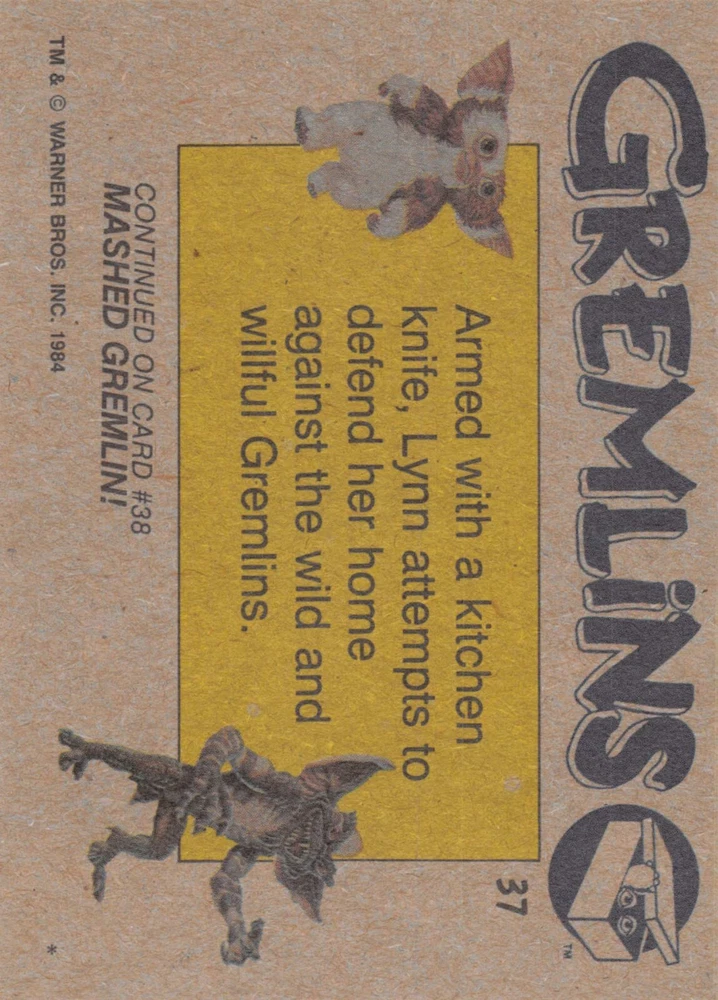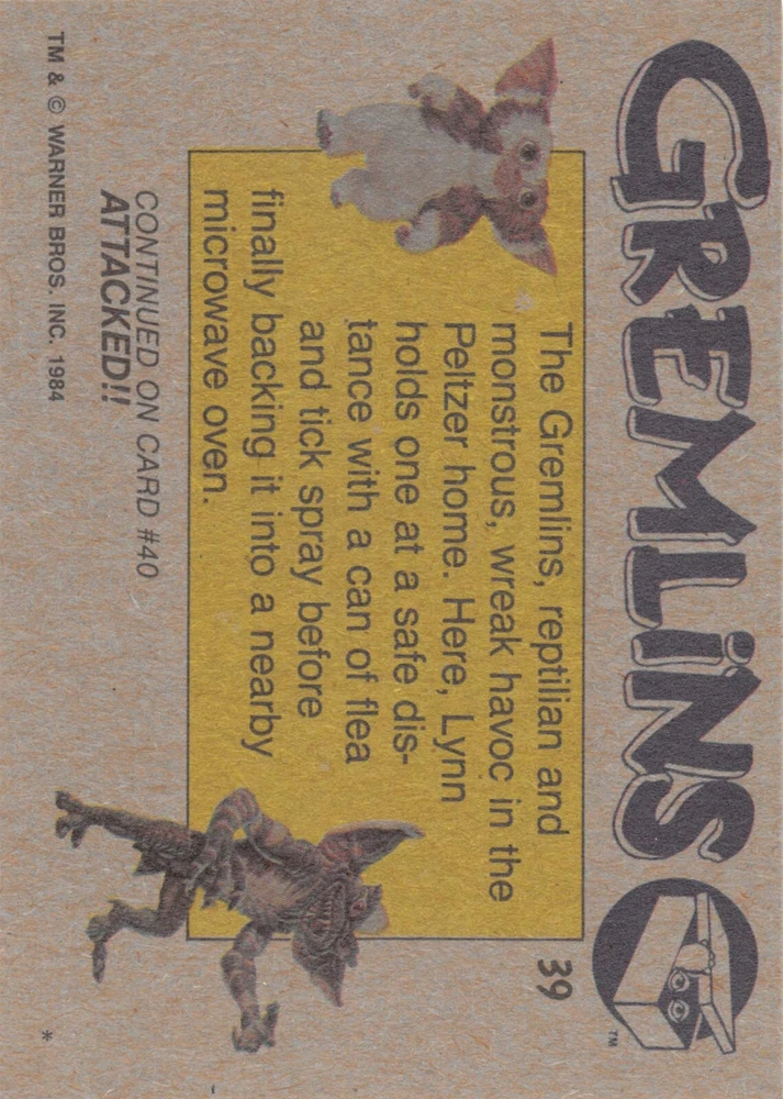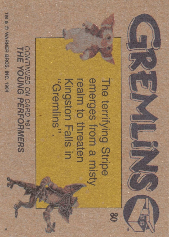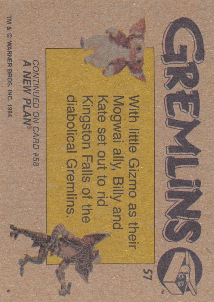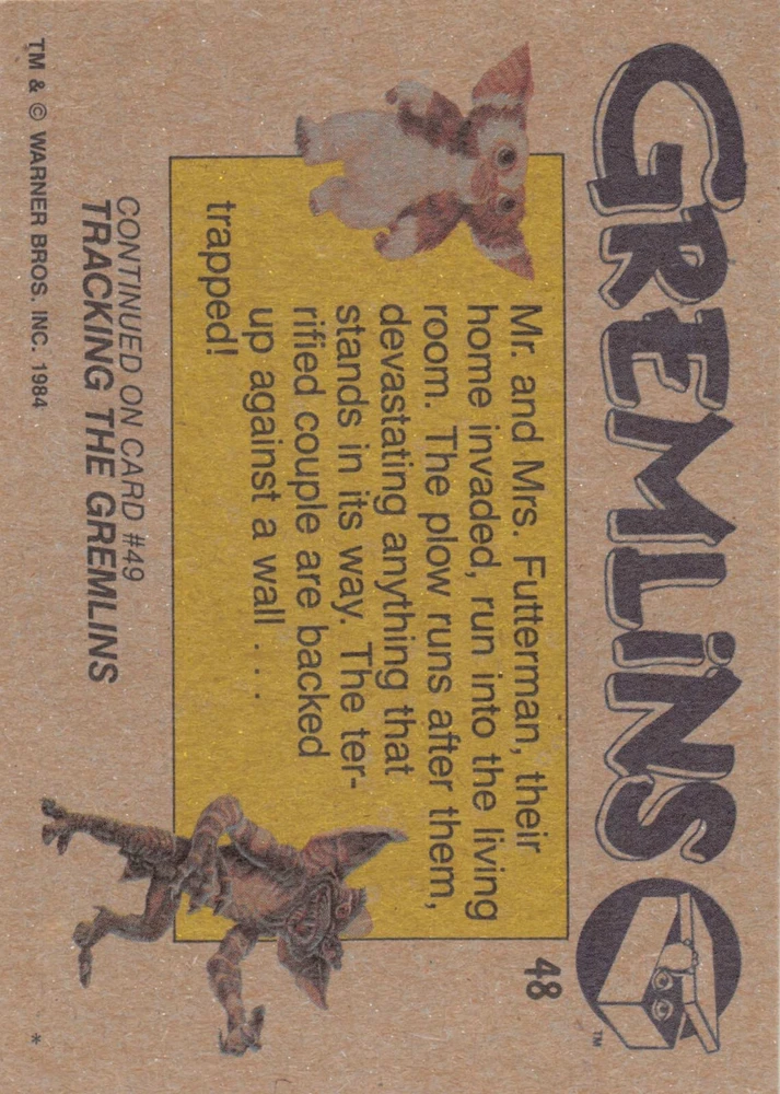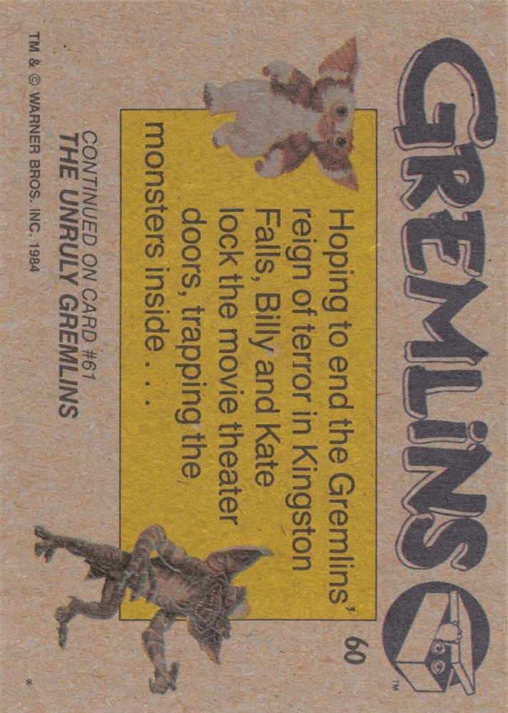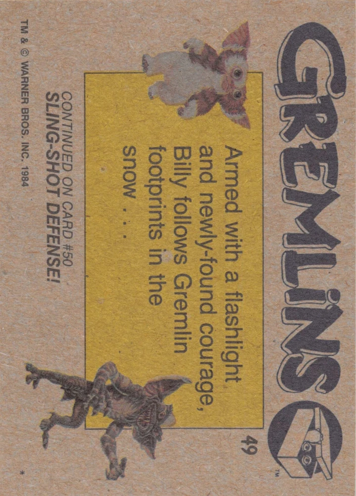 This listing is for your choice of any available 1984 Topps Gremlins card, sticker or wrapper from the drop-down menu above. Photos show front and backside of each card, be sure to scroll sideways to view front and backside photos! Any questions? Please ask before buying. International "USPS First Class Mail" will not include a tracking number for this item, if you would like a tracking number please choose the "eBay International Standard Shipping" option when you check out. As with all of my "pick-a-card" listings, I will be shipping with "eBay Standard Envelope". The rules of this envelope state that it cannot be too thick, so please expect your order to be packaged as follows: 1 to 6 cards will be slid into a single sleeve, the sleeve will then be slid inside of a semi-rigid Card-Saver. 7 to 12 cards will be slid into a double sleeve, 13 to 18 cards into a triple sleeve, 19 to 24 cards into a quadruple sleeve(up to six cards per sleeve). The double, triple and quadruple sleeve shipping will not have the Card-Saver. If you buy more than 1 card and want it packaged with more than 1 Card-Saver(or 1 sleeve per card), I kindly ask that you contact me before purchasing to be sure that this is possible to have it done with the stated shipping charge, or if additional shipping would be required. If you do not contact me, then you can expect to receive your order packaged as I have explained here. Please do not expect rigid top-loaders to be included, I don't normally keep a lot of them in stock, but if you message me prior to ordering I will be able to see if I have any that can be included with your order - additional shipping may be required. In order to get free combined shipping from this and any of my other "pick-a-card" listings, you must add all of your cards to the cart and check out when you are done shopping. If you do not use the cart you will be overpaying on shipping and I cannot refund you on over-payed shipping. So please use the cart and get your FREE COMBINED SHIPPING!