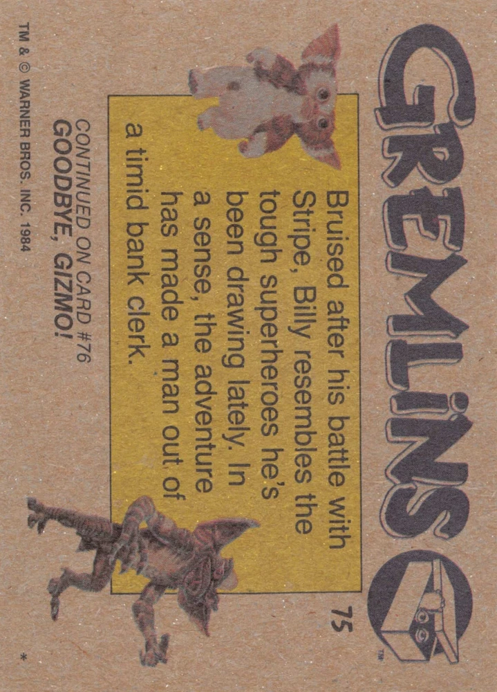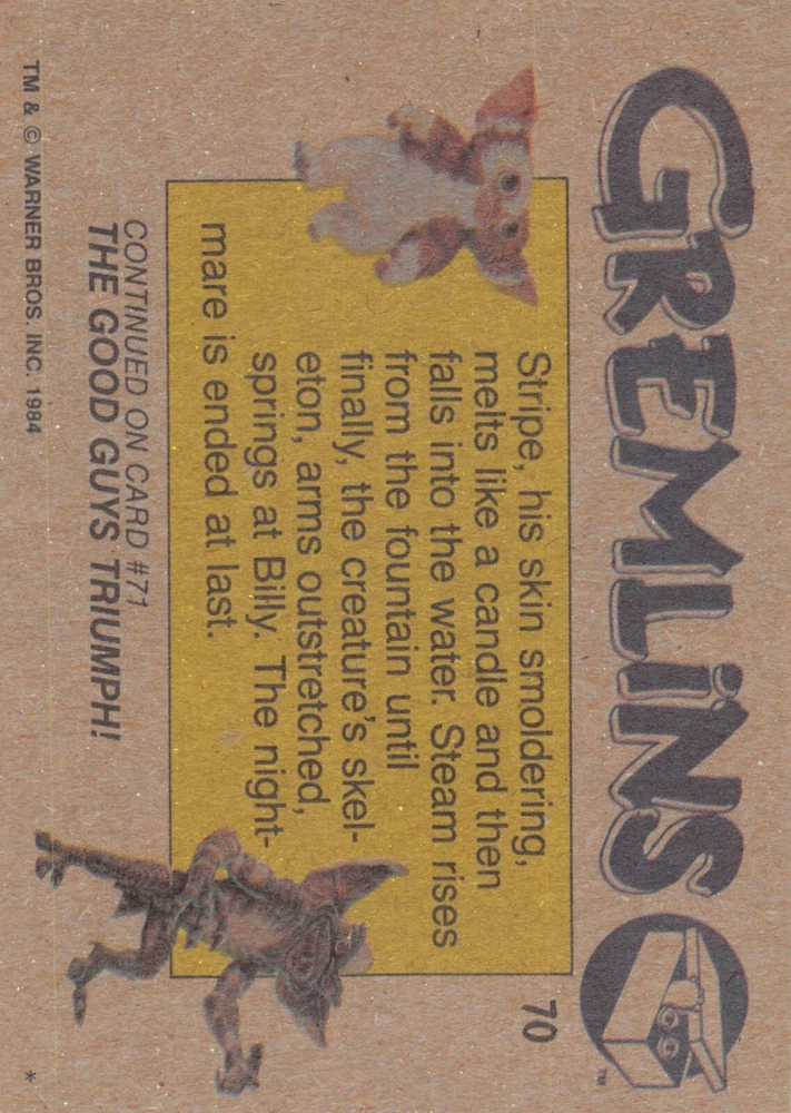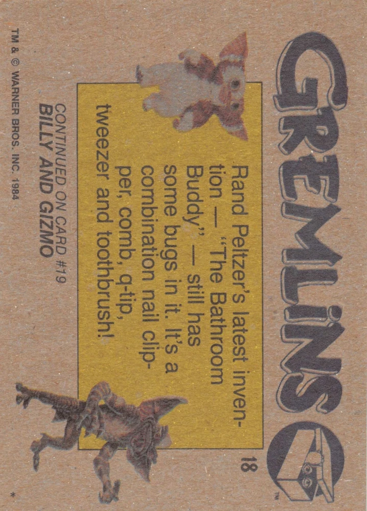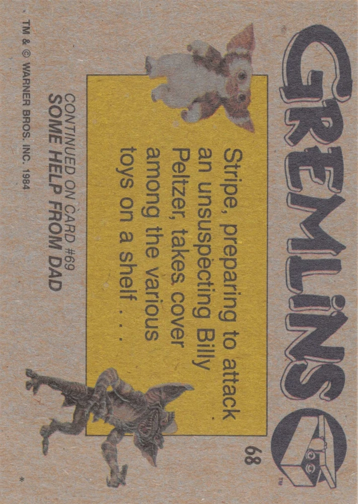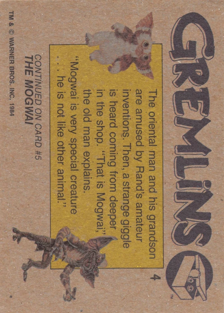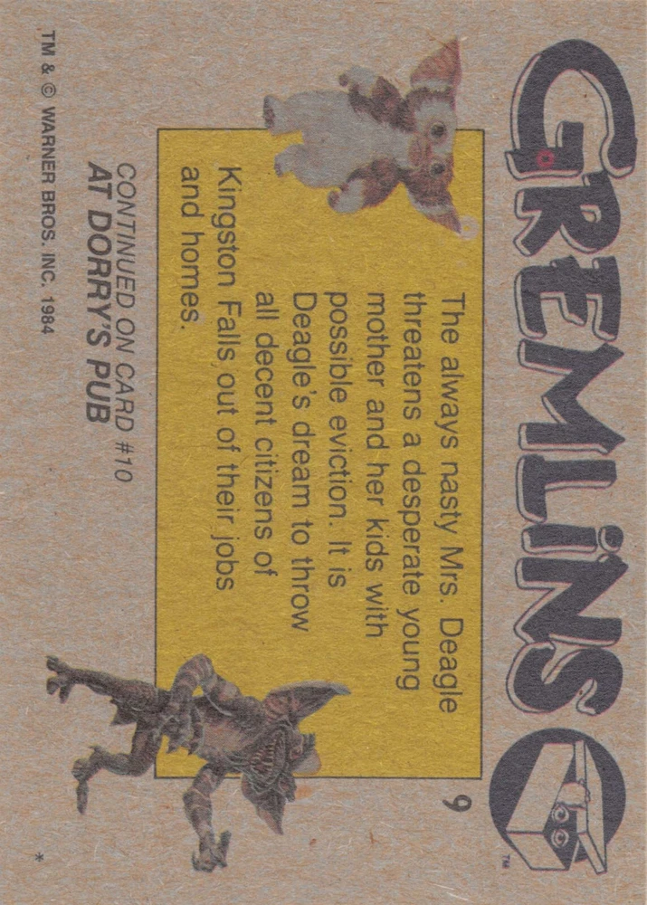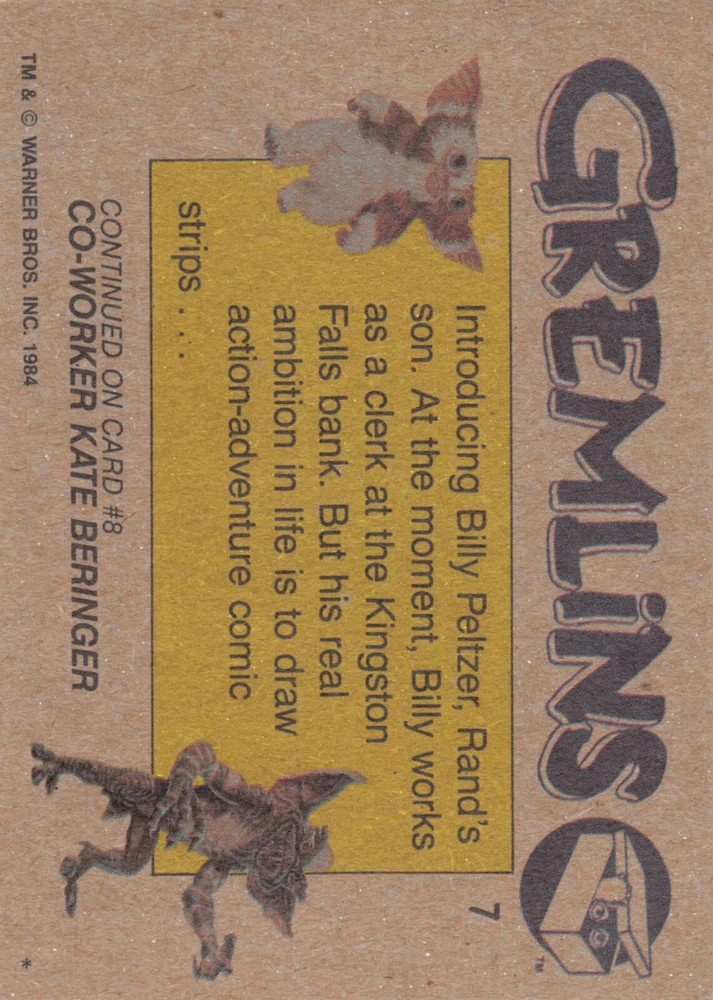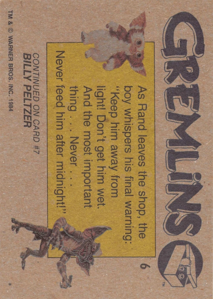 This listing is for your choice of any available 1984 Topps Gremlins card, sticker or wrapper from the drop-down menu above. Photos show front and backside of each card, be sure to scroll sideways to view front and backside photos! Any questions? Please ask before buying. International "USPS First Class Mail" will not include a tracking number for this item, if you would like a tracking number please choose the "eBay International Standard Shipping" option when you check out. As with all of my "pick-a-card" listings, I will be shipping with "eBay Standard Envelope". The rules of this envelope state that it cannot be too thick, so please expect your order to be packaged as follows: 1 to 6 cards will be slid into a single sleeve, the sleeve will then be slid inside of a semi-rigid Card-Saver. 7 to 12 cards will be slid into a double sleeve, 13 to 18 cards into a triple sleeve, 19 to 24 cards into a quadruple sleeve(up to six cards per sleeve). The double, triple and quadruple sleeve shipping will not have the Card-Saver. If you buy more than 1 card and want it packaged with more than 1 Card-Saver(or 1 sleeve per card), I kindly ask that you contact me before purchasing to be sure that this is possible to have it done with the stated shipping charge, or if additional shipping would be required. If you do not contact me, then you can expect to receive your order packaged as I have explained here. Please do not expect rigid top-loaders to be included, I don't normally keep a lot of them in stock, but if you message me prior to ordering I will be able to see if I have any that can be included with your order - additional shipping may be required. In order to get free combined shipping from this and any of my other "pick-a-card" listings, you must add all of your cards to the cart and check out when you are done shopping. If you do not use the cart you will be overpaying on shipping and I cannot refund you on over-payed shipping. So please use the cart and get your FREE COMBINED SHIPPING!