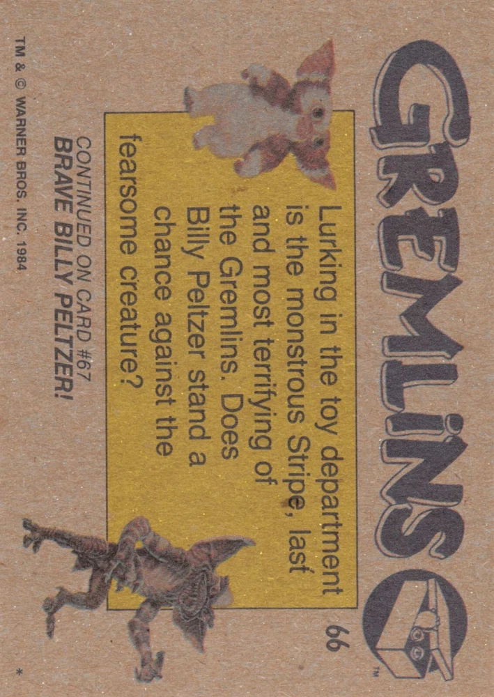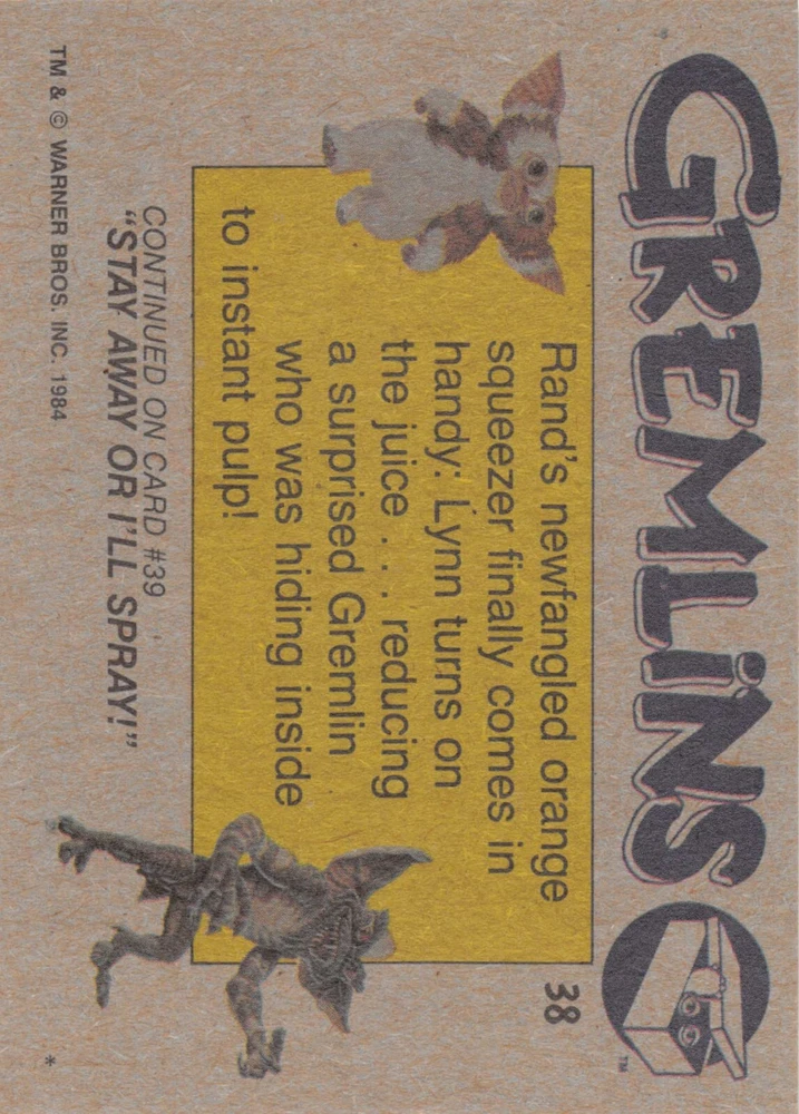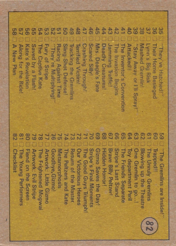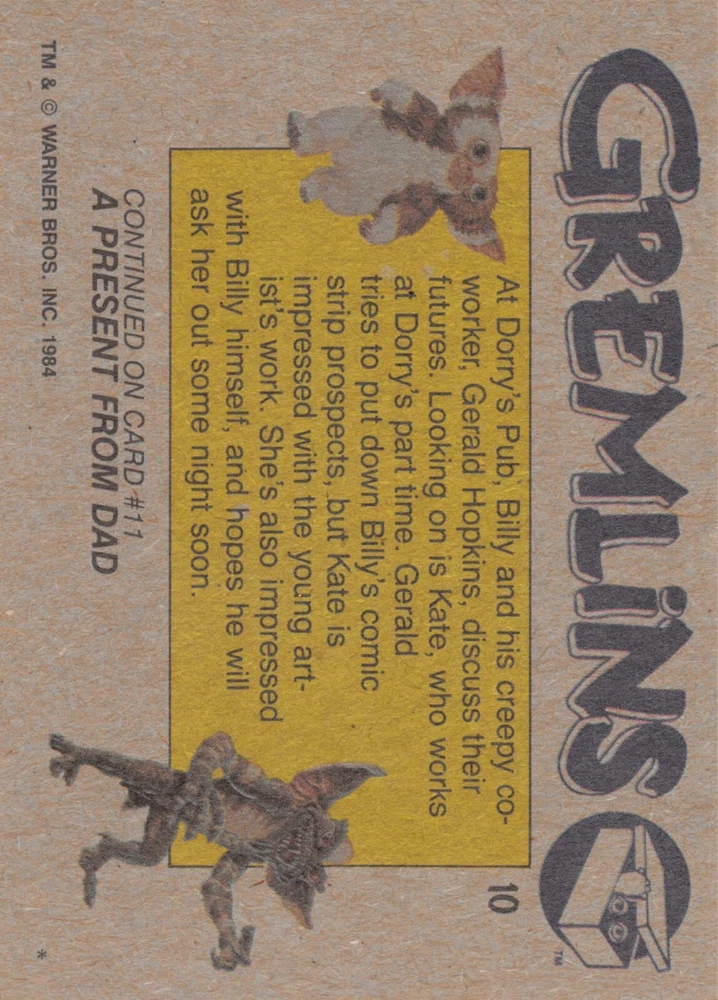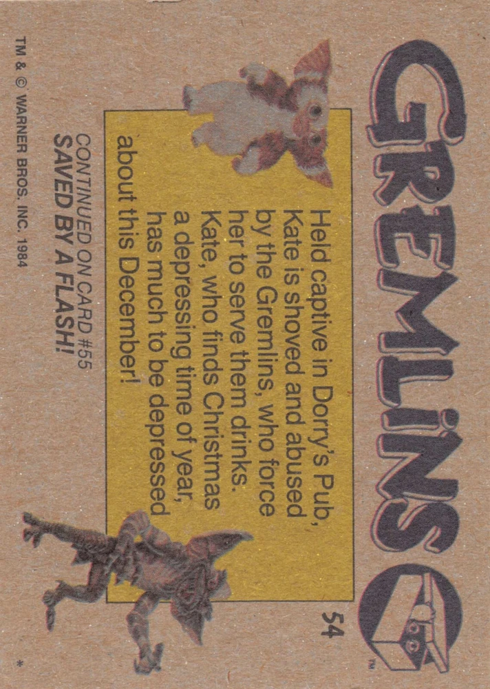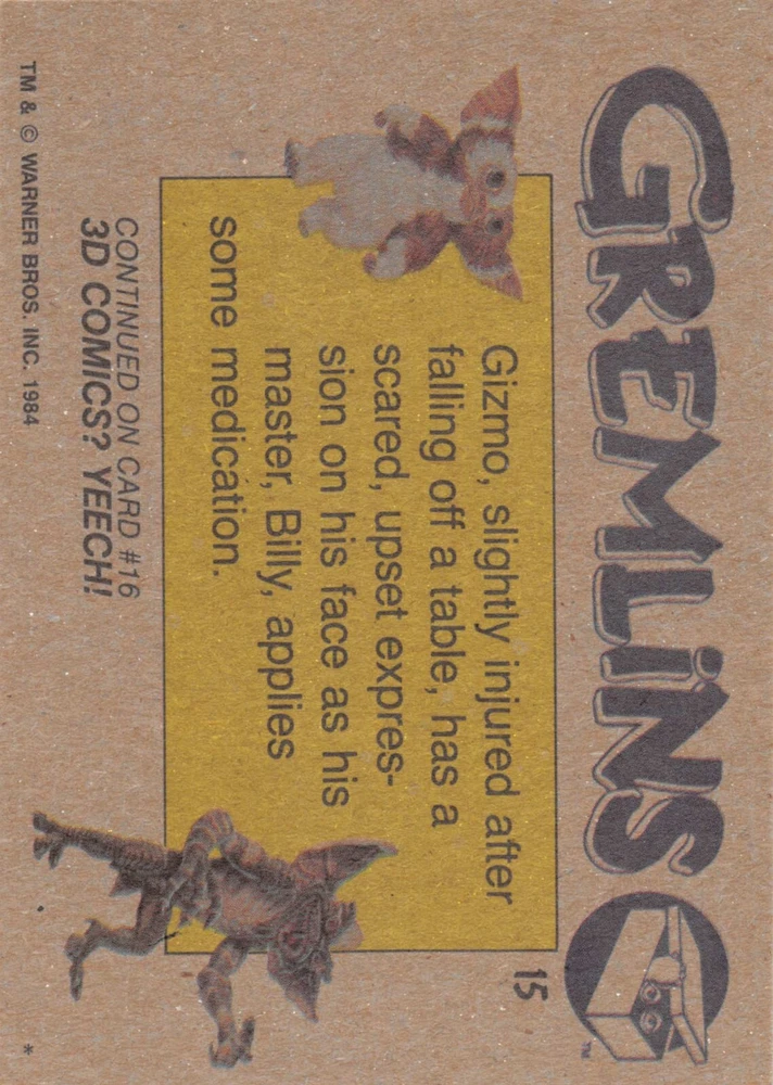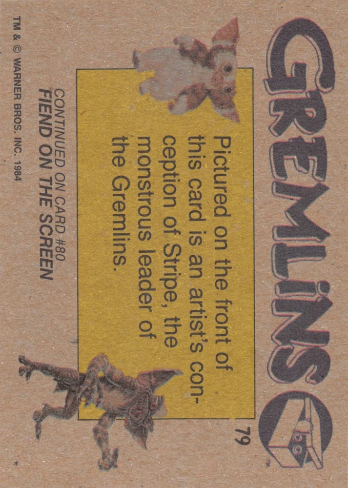This listing is for your choice of any available 1984 Topps Gremlins card, sticker or wrapper from the drop-down menu above. Photos show front and backside of each card, be sure to scroll sideways to view front and backside photos! Any questions? Please ask before buying. International "USPS First Class Mail" will not include a tracking number for this item, if you would like a tracking number please choose the "eBay International Standard Shipping" option when you check out. As with all of my "pick-a-card" listings, I will be shipping with "eBay Standard Envelope". The rules of this envelope state that it cannot be too thick, so please expect your order to be packaged as follows: 1 to 6 cards will be slid into a single sleeve, the sleeve will then be slid inside of a semi-rigid Card-Saver. 7 to 12 cards will be slid into a double sleeve, 13 to 18 cards into a triple sleeve, 19 to 24 cards into a quadruple sleeve(up to six cards per sleeve). The double, triple and quadruple sleeve shipping will not have the Card-Saver. If you buy more than 1 card and want it packaged with more than 1 Card-Saver(or 1 sleeve per card), I kindly ask that you contact me before purchasing to be sure that this is possible to have it done with the stated shipping charge, or if additional shipping would be required. If you do not contact me, then you can expect to receive your order packaged as I have explained here. Please do not expect rigid top-loaders to be included, I don't normally keep a lot of them in stock, but if you message me prior to ordering I will be able to see if I have any that can be included with your order - additional shipping may be required. In order to get free combined shipping from this and any of my other "pick-a-card" listings, you must add all of your cards to the cart and check out when you are done shopping. If you do not use the cart you will be overpaying on shipping and I cannot refund you on over-payed shipping. So please use the cart and get your FREE COMBINED SHIPPING!