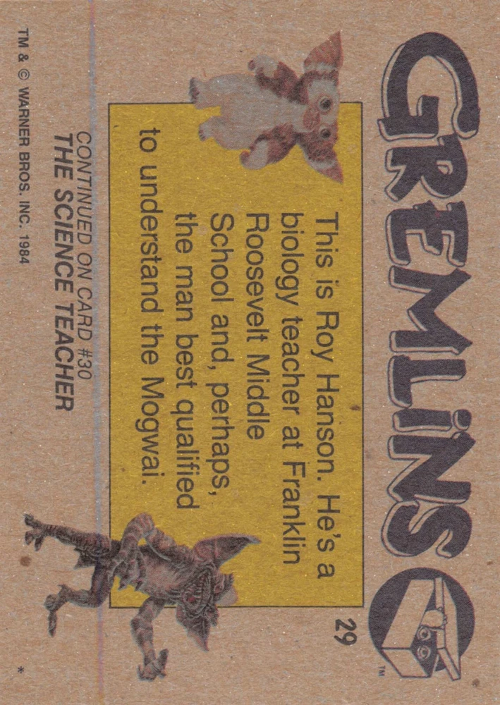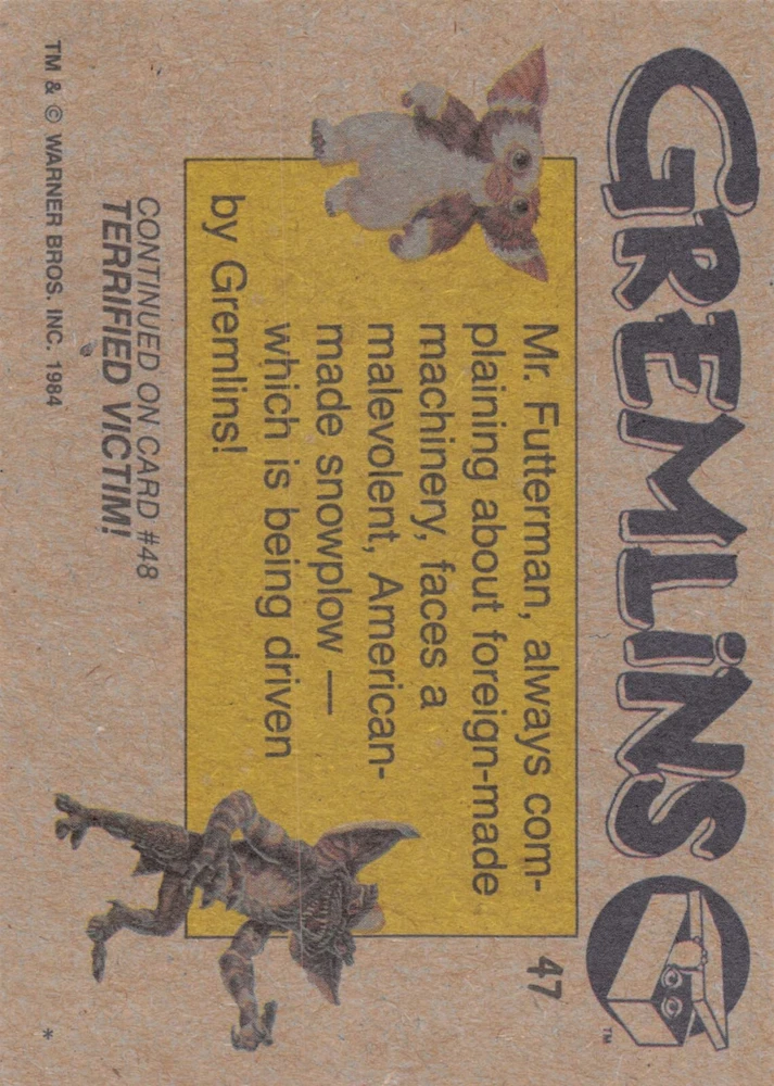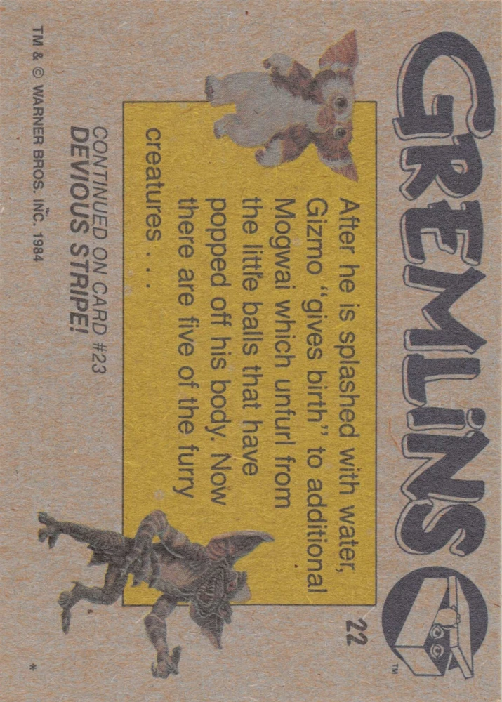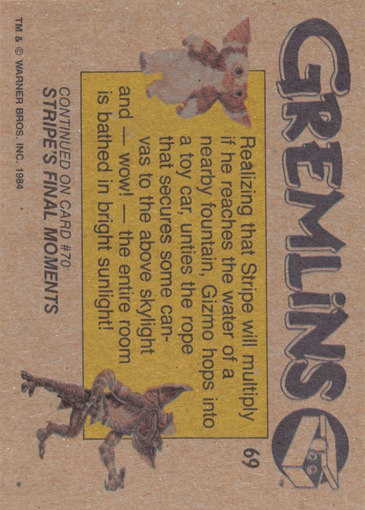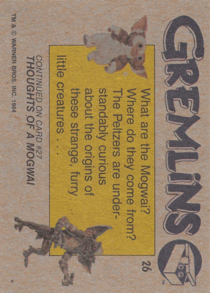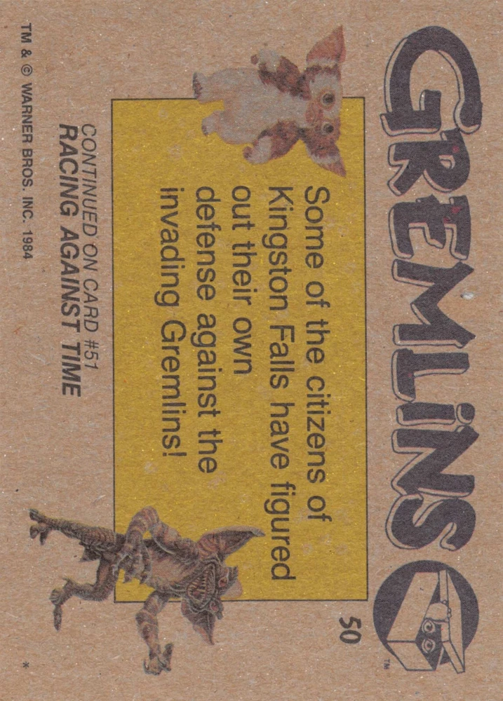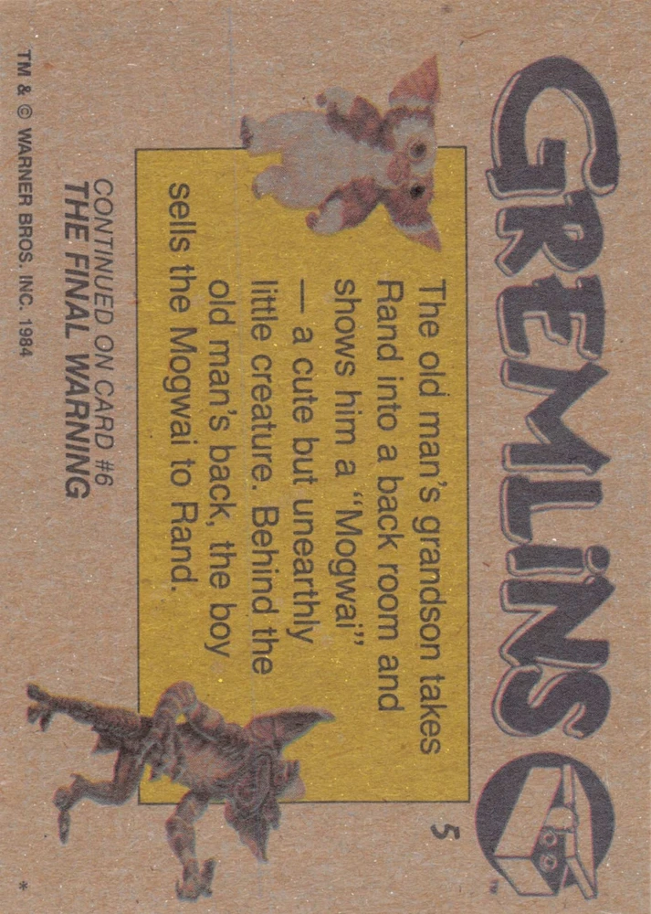 This listing is for your choice of any available 1984 Topps Gremlins card, sticker or wrapper from the drop-down menu above. Photos show front and backside of each card, be sure to scroll sideways to view front and backside photos! Any questions? Please ask before buying. International "USPS First Class Mail" will not include a tracking number for this item, if you would like a tracking number please choose the "eBay International Standard Shipping" option when you check out. As with all of my "pick-a-card" listings, I will be shipping with "eBay Standard Envelope". The rules of this envelope state that it cannot be too thick, so please expect your order to be packaged as follows: 1 to 6 cards will be slid into a single sleeve, the sleeve will then be slid inside of a semi-rigid Card-Saver. 7 to 12 cards will be slid into a double sleeve, 13 to 18 cards into a triple sleeve, 19 to 24 cards into a quadruple sleeve(up to six cards per sleeve). The double, triple and quadruple sleeve shipping will not have the Card-Saver. If you buy more than 1 card and want it packaged with more than 1 Card-Saver(or 1 sleeve per card), I kindly ask that you contact me before purchasing to be sure that this is possible to have it done with the stated shipping charge, or if additional shipping would be required. If you do not contact me, then you can expect to receive your order packaged as I have explained here. Please do not expect rigid top-loaders to be included, I don't normally keep a lot of them in stock, but if you message me prior to ordering I will be able to see if I have any that can be included with your order - additional shipping may be required. In order to get free combined shipping from this and any of my other "pick-a-card" listings, you must add all of your cards to the cart and check out when you are done shopping. If you do not use the cart you will be overpaying on shipping and I cannot refund you on over-payed shipping. So please use the cart and get your FREE COMBINED SHIPPING!