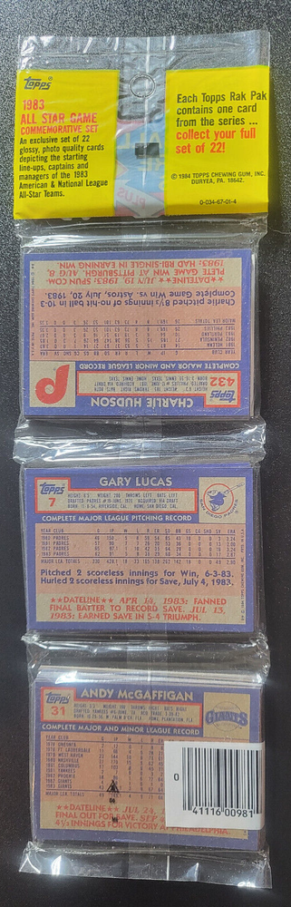 Full Sealed Box for sale!! All 24 packs randomly shipped. Set Checklist 1984 Topps Baseball Checklist Base Set Checklist 792 cards. SUBSET KEY: HL=Highlight, MGR=Manager, AS=All-Star. 1 Steve Carlton HL - Philadelphia Phillies HL 2 Rickey Henderson HL - Oakland Athletics HL 3 Dan Quisenberry HL - Kansas City Royals HL 4 Nolan Ryan / Steve Carlton / Gaylord Perry HL 5 Dave Righetti / Bob Forsch / Mike Warren HL 6 Johnny Bench / Gaylord Perry / Carl Yastrzemski HL 7 Gary Lucas - San Diego Padres 8 Don Mattingly - New York Yankees RC 9 Jim Gott - Toronto Blue Jays 10 Robin Yount - Milwaukee Brewers 11 Twins Leaders Team Checklist 12 Billy Sample - Texas Rangers 13 Scott Holman - New York Mets 14 Tom Brookens - Detroit Tigers 15 Burt Hooton - Los Angeles Dodgers 16 Omar Moreno - New York Yankees 17 John Denny - Philadelphia Phillies 18 Dale Berra - Pittsburgh Pirates 19 Ray Fontenot - New York Yankees RC 20 Greg Luzinski - Chicago White Sox 21 Joe Altobelli - Baltimore Orioles MGR 22 Bryan Clark - Seattle Mariners 23 Keith Moreland - Chicago Cubs 24 John Martin - Detroit Tigers 25 Glenn Hubbard - Atlanta Braves 26 Bud Black - Kansas City Royals 27 Daryl Sconiers - California Angels 28 Frank Viola - Minnesota Twins 29 Danny Heep - New York Mets 30 Wade Boggs - Boston Red Sox 31 Andy McGaffigan - San Francisco Giants 32 Bobby Ramos - Montreal Expos 33 Tom Burgmeier - Oakland Athletics 34 Eddie Milner - Cincinnati Reds 35 Don Sutton - Milwaukee Brewers 36 Denny Walling - Houston Astros 37 Rangers Leaders Team Checklist 38 Luis DeLeon - San Diego Padres 39 Garth Iorg - Toronto Blue Jays 40 Dusty Baker - Los Angeles Dodgers 41 Tony Bernazard - Seattle Mariners 42 Johnny Grubb - Detroit Tigers 43 Ron Reed - Philadelphia Phillies 44 Jim Morrison - Pittsburgh Pirates 45 Jerry Mumphrey - Houston Astros 46 Ray Smith - Minnesota Twins RC 47 Rudy Law - Chicago White Sox 48 Julio Franco - Cleveland Indians 49 John Stuper - St. Louis Cardinals 50 Chris Chambliss - Atlanta Braves 51 Jim Frey - Chicago Cubs MGR 52 Paul Splittorff - Kansas City Royals 53 Juan Beniquez - California Angels 54 Jesse Orosco - New York Mets 55 Dave Concepcion - Cincinnati Reds 56 Gary Allenson - Boston Red Sox 57 Dan Schatzeder - Montreal Expos 58 Max Venable - San Francisco Giants 59 Sammy Stewart - Baltimore Orioles 60 Paul Molitor - Milwaukee Brewers 61 Chris Codiroli - Oakland Athletics RC 62 Dave Hostetler - Texas Rangers 63 Ed Vande Berg - Seattle Mariners 64 Mike Scioscia - Los Angeles Dodgers 65 Kirk Gibson - Detroit Tigers 66 Astros Leaders Team Checklist 67 Gary Ward - Minnesota Twins 68 Luis Salazar - San Diego Padres 69 Rod Scurry - Pittsburgh Pirates 70 Gary Matthews - Philadelphia Phillies 71 Leo Hernandez - Baltimore Orioles RC 72 Mike Squires - Chicago White Sox 73 Jody Davis - Chicago Cubs 74 Jerry Martin - Kansas City Royals 75 Bob Forsch - St. Louis Cardinals 76 Alfredo Griffin - Toronto Blue Jays 77 Brett Butler - Atlanta Braves 78 Mike Torrez - New York Mets 79 Rob Wilfong - California Angels 80 Steve Rogers - Montreal Expos 81 Billy Martin - New York Yankees MGR 82 Doug Bird - Boston Red Sox 83 Richie Zisk - Seattle Mariners 84 Lenny Faedo - Minnesota Twins 85 Atlee Hammaker - San Francisco Giants 86 John Shelby - Baltimore Orioles RC 87 Frank Pastore - Cincinnati Reds 88 Rob Picciolo - Milwaukee Brewers 89 Mike Smithson - Texas Rangers RC 90 Pedro Guerrero - Los Angeles Dodgers 91 Dan Spillner - Cleveland Indians 92 Lloyd Moseby - Toronto Blue Jays 93 Bob Knepper - Houston Astros 94 Mario Ramirez - San Diego Padres RC 95 Aurelio Lopez - Detroit Tigers 96 Royals Leaders Team Checklist 97 LaMarr Hoyt - Chicago White Sox 98 Steve Nicosia - San Francisco Giants 99 Craig Lefferts - Chicago Cubs RC 100 Reggie Jackson - California Angels 101 Porfirio Altamirano - Philadelphia Phillies 102 Ken Oberkfell - St. Louis Cardinals 103 Dwayne Murphy - Oakland Athletics 104 Ken Dayley - Atlanta Braves 105 Tony Armas - Boston Red Sox 106 Tim Stoddard - Baltimore Orioles 107 Ned Yost - Milwaukee Brewers 108 Randy Moffitt - Toronto Blue Jays 109 Brad Wellman - San Francisco Giants RC 110 Ron Guidry - New York Yankees 111 Bill Virdon - Montreal Expos MGR 112 Tom Niedenfuer - Los Angeles Dodgers 113 Kelly Paris - Cincinnati Reds RC 114 Checklist (#1-132) 115 Andre Thornton - Cleveland Indians 116 George Bjorkman - Houston Astros RC 117 Tom Veryzer - Chicago Cubs 118 Charlie Hough - Texas Rangers 119 Johnny Wockenfuss - Detroit Tigers 120 Keith Hernandez - New York Mets 121 Pat Sheridan - Kansas City Royals RC 122 Cecilio Guante - Pittsburgh Pirates 123 Butch Wynegar - New York Yankees 124 Damaso Garcia - Toronto Blue Jays 125 Britt Burns - Chicago White Sox 126 Braves Leaders Team Checklist 127 Mike Madden - Houston Astros RC 128 Rick Manning - Milwaukee Brewers 129 Bill Laskey - San Francisco Giants 130 Ozzie Smith - St. Louis Cardinals 131 1983 Batting Leaders 132 1983 Home Run Leaders 133 1983 Runs Batted In Leaders 134 1983 Stolen Base Leaders 135 1983 Victory Leaders 136 1983 Strikeout Leaders 137 1983 Earned Run Average Leaders 138 1983 Leading Firemen 139 Bert Campaneris - New York Yankees 140 Storm Davis - Baltimore Orioles 141 Pat Corrales - Cleveland Indians MGR 142 Rich Gale - Cincinnati Reds 143 Jose Morales - Los Angeles Dodgers 144 Brian Harper - Pittsburgh Pirates RC 145 Gary Lavelle - San Francisco Giants 146 Ed Romero - Milwaukee Brewers 147 Dan Petry - Detroit Tigers 148 Joe Lefebvre - Philadelphia Phillies 149 Jon Matlack - Texas Rangers 150 Dale Murphy - Atlanta Braves 151 Steve Trout - Chicago Cubs 152 Glenn Brummer - St. Louis Cardinals 153 Dick Tidrow - Chicago White Sox 154 Dave Henderson - Seattle Mariners 155 Frank White - Kansas City Royals 156 Athletics Leaders Team Checklist 157 Gary Gaetti - Minnesota Twins 158 John Curtis - California Angels 159 Darryl Cias - Oakland Athletics RC 160 Mario Soto - Cincinnati Reds 161 Junior Ortiz - New York Mets RC 162 Bob Ojeda - Boston Red Sox 163 Lorenzo Gray - 