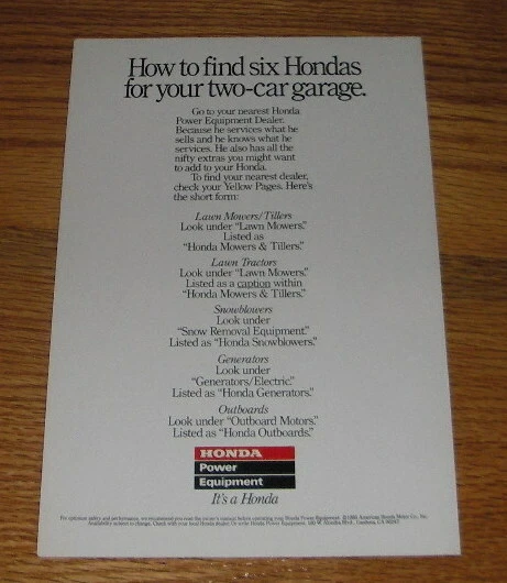 Item ID: multi103 This listing is for a vintage paper advertisement. This is a 1985 4-page ad (2 pages, front/back) for Honda Power equipment, featuring Lawn Tractors, Generators, Lawn Mowers, Tillers, Outboards and Snowblowers. The size of each page is approximately 6.5x10 inches. The caption for this ad is "How to fit six Hondas in a two-car garage" The ad is in good overall condition, with some light wear. This vintage ad would look great framed and displayed! Add it to your collection today!
