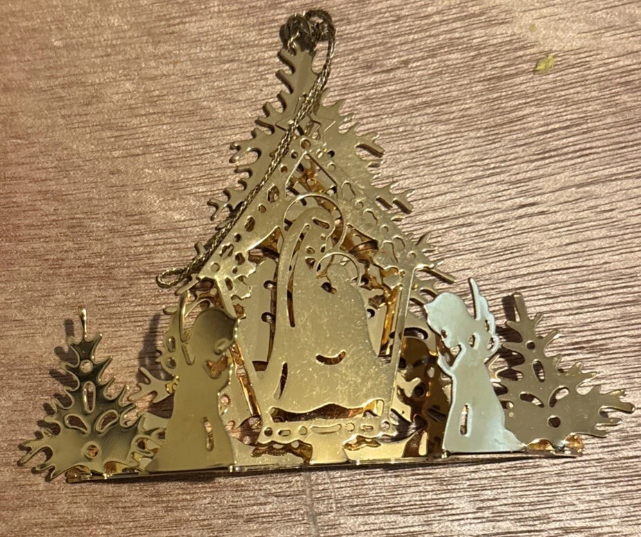 1985 Annual Danbury Mint Gold Plated Christmas Ornament Away in a Manger Angels
