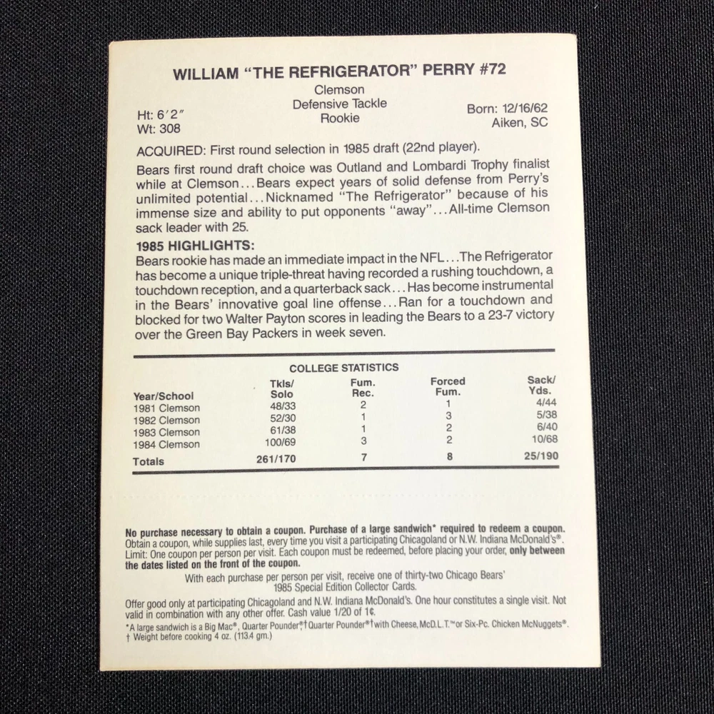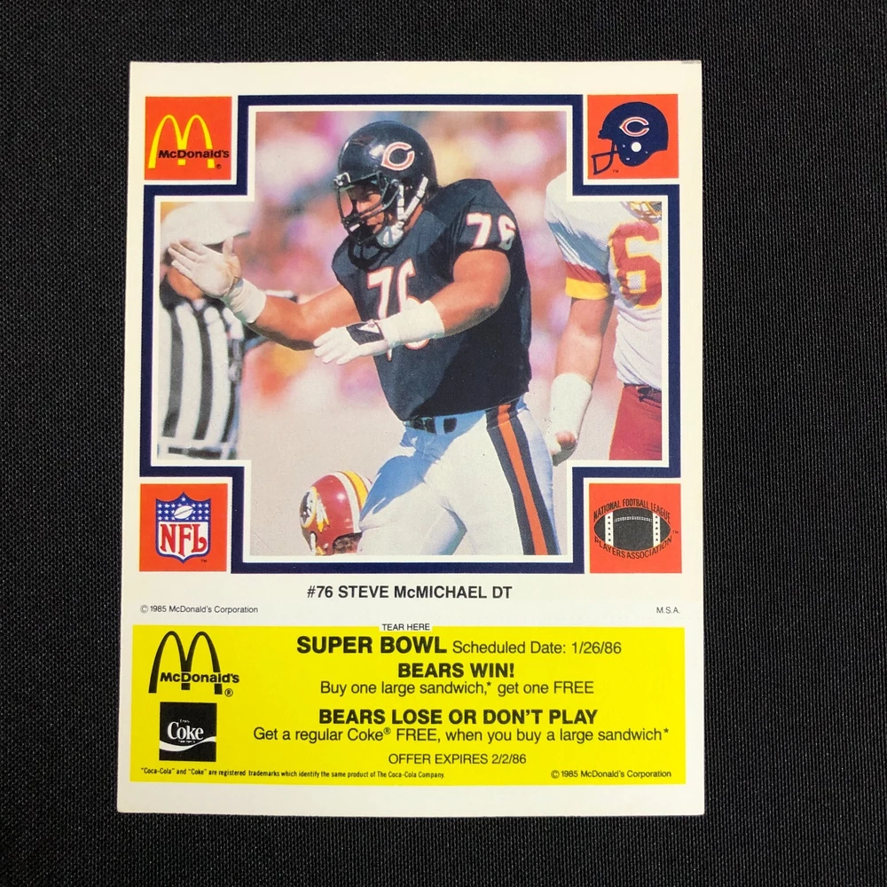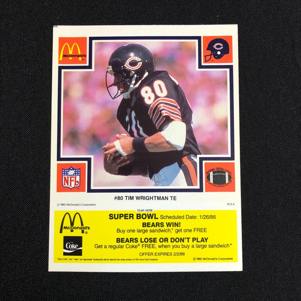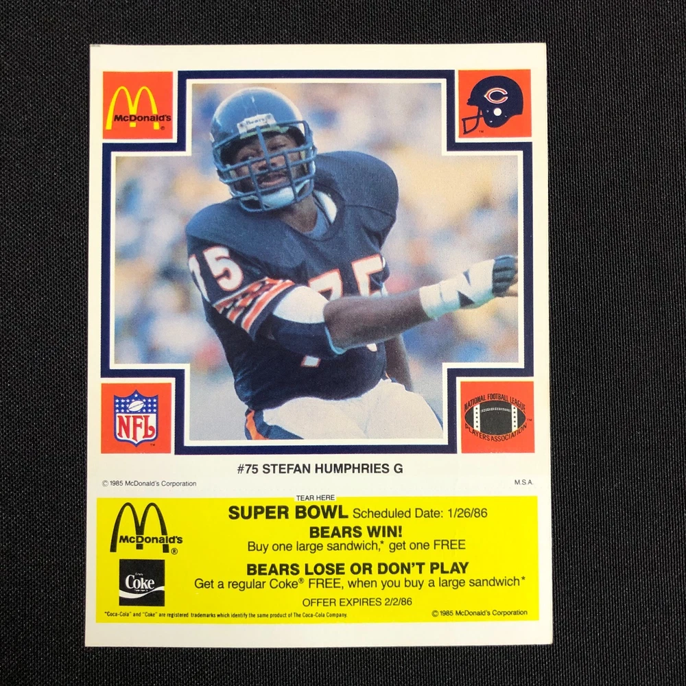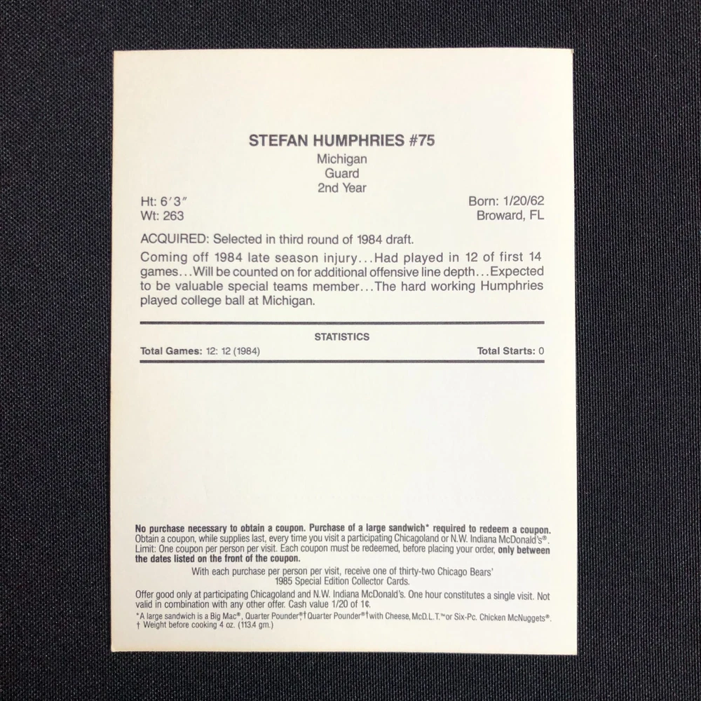 Lot of 5 includes: William "The Refridgerator" Perry: Def. Tackle Tim Wrightman: Tight End Keith Van Horne: Off. Tackle Steve McMichael: Def. Tackle Stefan Humphries: Guard Cards are in good vintage condition. Please see photos as they are intended as part of the description. Please feel free to message me with any questions. Shipping insurance is included in the shipping quote. Your item will be packed with care. Thank you for stopping by the shop and have a great day!