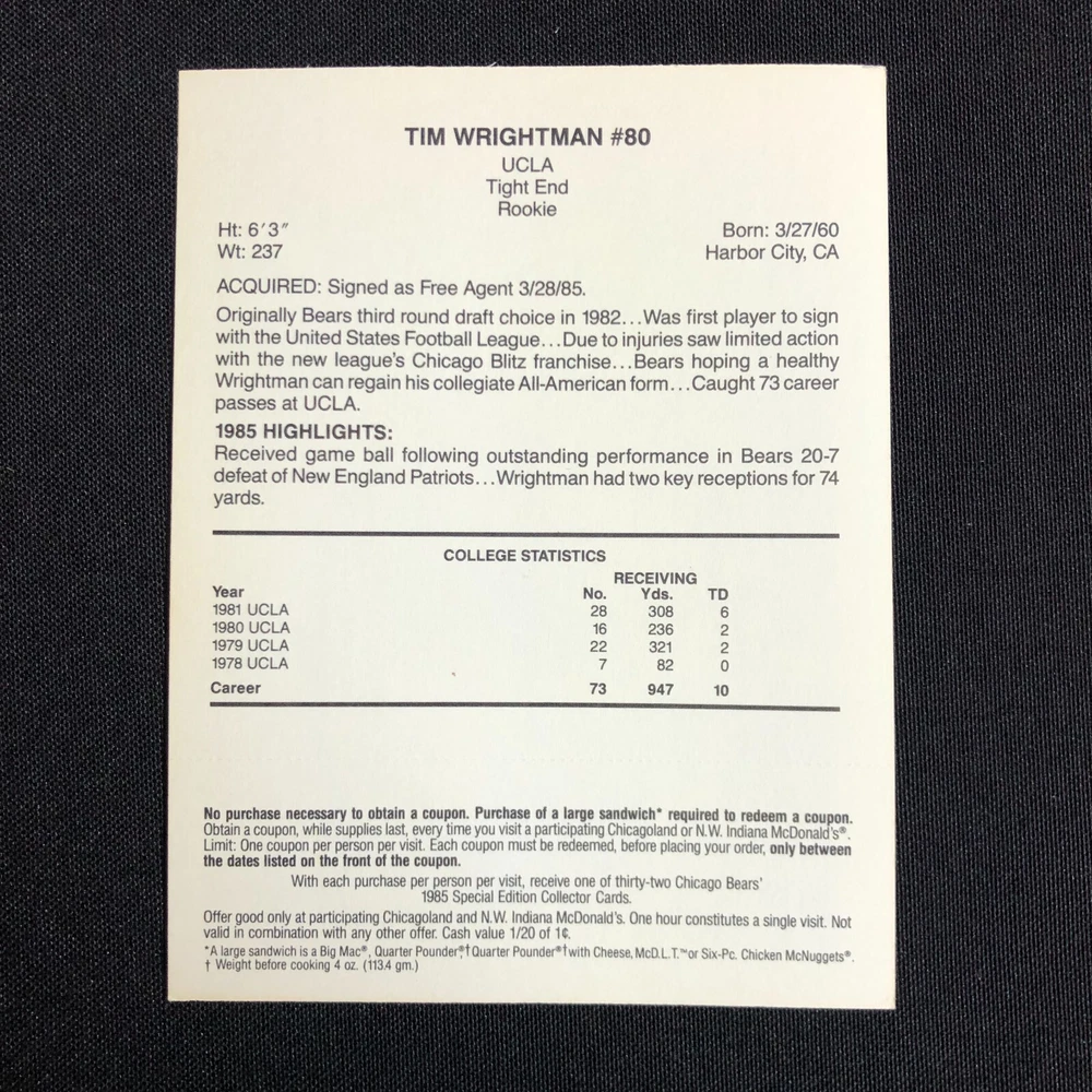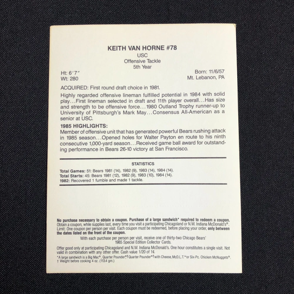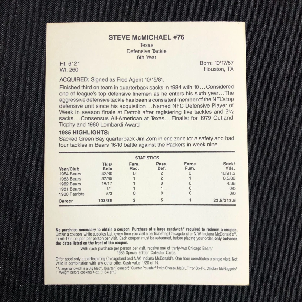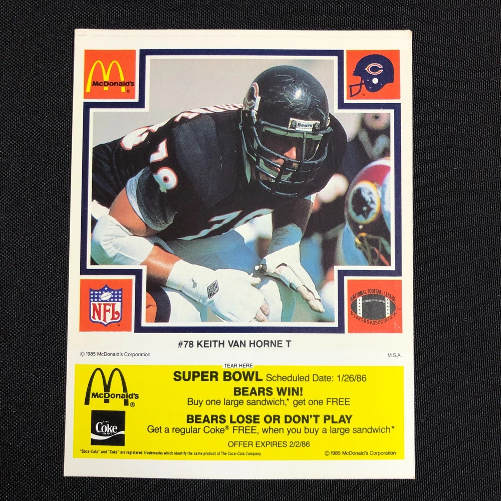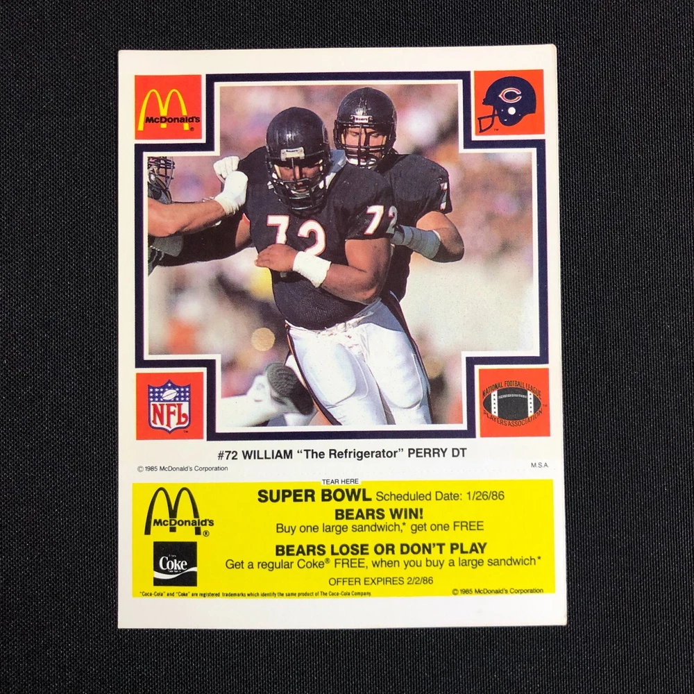 Lot of 5 includes: William "The Refridgerator" Perry: Def. Tackle Tim Wrightman: Tight End Keith Van Horne: Off. Tackle Steve McMichael: Def. Tackle Stefan Humphries: Guard Cards are in good vintage condition. Please see photos as they are intended as part of the description. Please feel free to message me with any questions. Shipping insurance is included in the shipping quote. Your item will be packed with care. Thank you for stopping by the shop and have a great day!