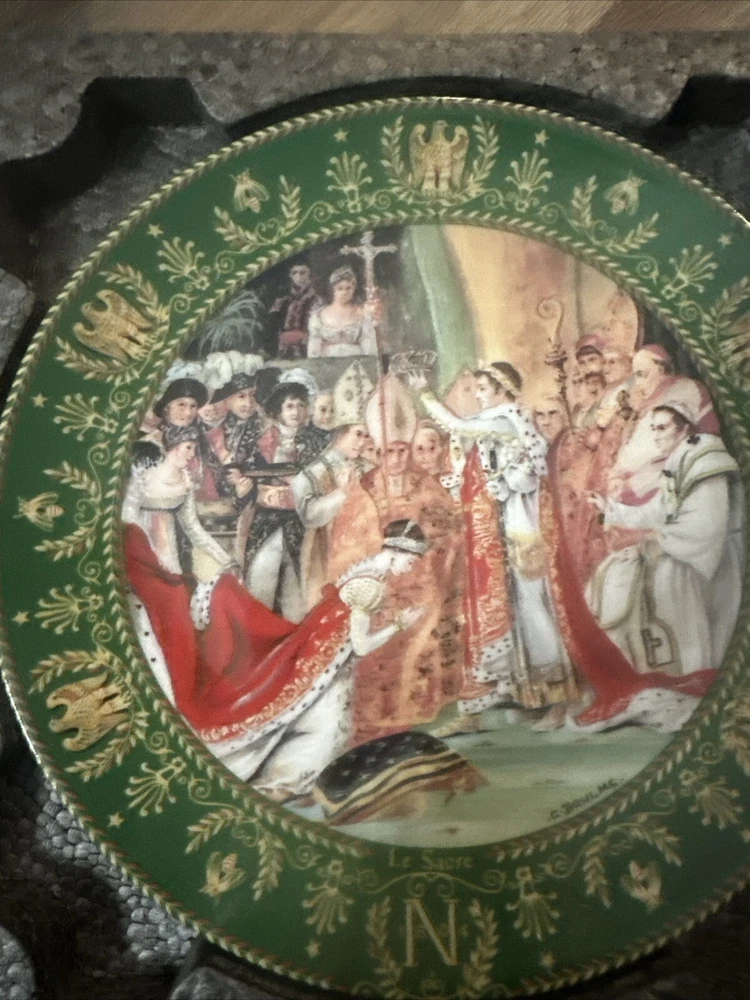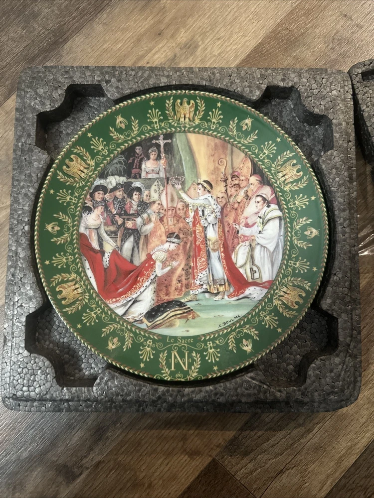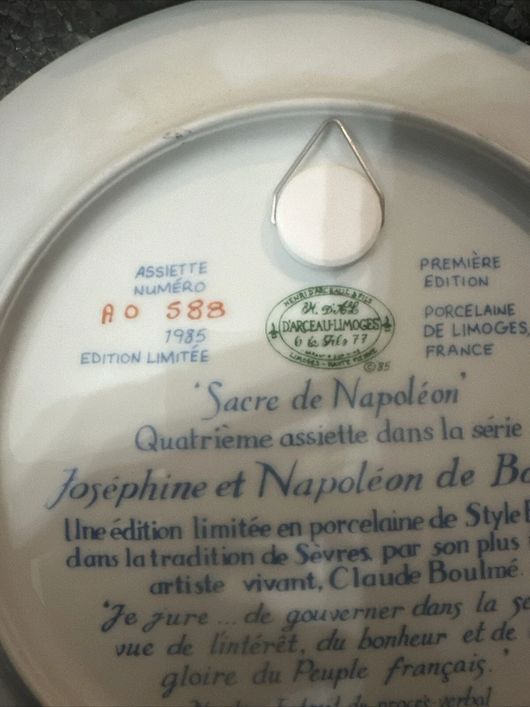 This exquisite collector plate from Limoges, France depicts the Sacre De Napoleon, or Napoleon's Coronation. The intricate porcelain design showcases the late 20th-century style of art pottery, with a multicolor palette that brings the scene to life. Measuring 8.5 inches in diameter, this vintage piece is a must-have for any collector of decorative items. The plate is produced using traditional pottery techniques and boasts a unique production style that reflects the French culture. This piece is perfect for any occasion and is sure to add a touch of elegance to your decor. Add this rare and beautiful collector plate to your collection today!