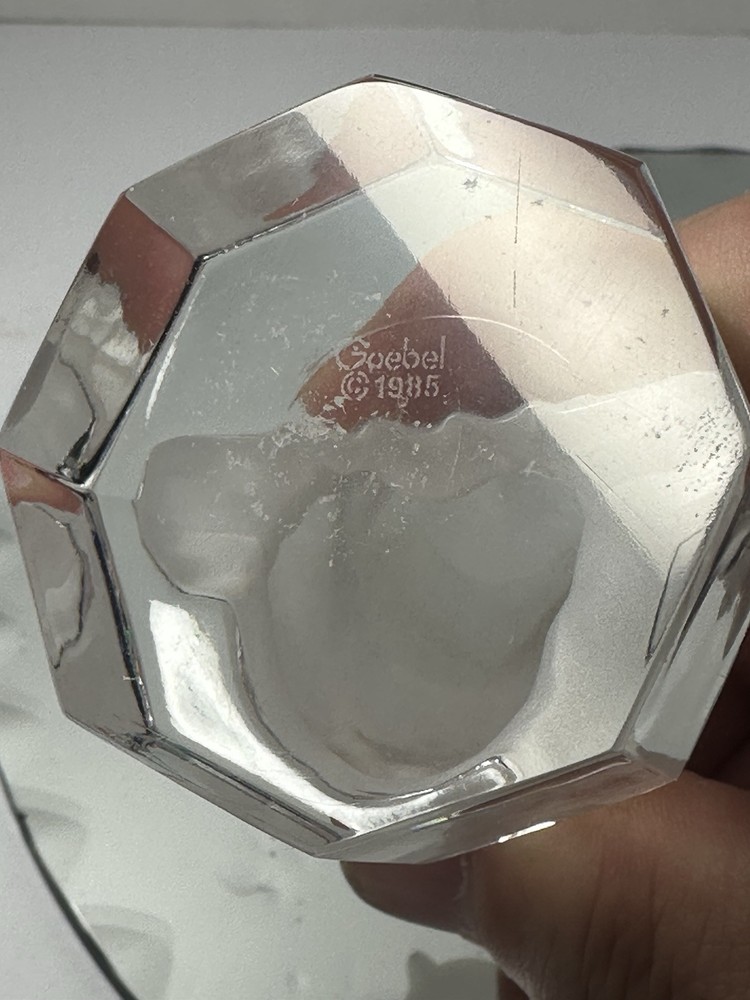 The Goebel 1985 Frosted Glass Owl on Clear Base is a vintage figurine crafted in Germany in the late 20th century. This handmade owl paperweight features a decorative 3D effect with etched patterns on the glass, giving it a glossy finish. Measuring 2.25 inches in length, 3 inches in height, and 0.5 inches in width, this owl figurine is a unique and charming addition to any collection, showcasing intricate details and a whimsical owl theme by the brand Goebel.