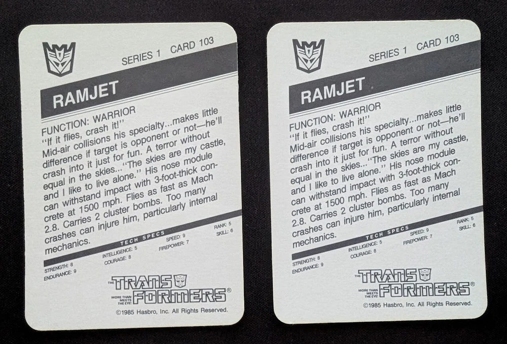 THIS AUCTION FEATURES TWO (2) RAMJETS, INCLUDING A "TILTED" FRONT CARD IMAGE VARIATION (VERY RARE) PACK FRESH ORIGINAL TRANSFORMERS CARDS IN NEAR MINT/MINT OR MINT CONDITION AHC Sports Perks! Singles Perks Discounted Combined Shipping: Discounted shipping rates apply to single card sales only (e.g., raw, graded, slabs). All single cards are shipped in card sleeves and toploaders for no additional cost when the final sale is $50 or less. Premium single cards are shipped in magnetic card cases ("mags") if shown in auction pictures (or when requested by the buyer) for no additional cost when the final sale price is $50 or more. Each additional single card shipped in a toploader can be shipped for just 50 cents per card . Each additional single card shipped in a magnetic card case can be shipped for just $3 per card (which covers the cost of the premium magnetic card case and the additional weight in shipping). All *$1 auction* products will sell to the highest bidder with no reserve . Lots Perks All *$1 auction* products will sell to the highest bidder with no reserve . Discounted Combined Shipping: Discounted shipping rates do not apply to card lots [five (5) or more cards sold in one (1) auction]. AHC Sports One of eBay's Premier Authentic Sports Trading Cards and Sports Merchandising Destinations! AHC Sports is the sports merchandising agent of Authentic History Collectibles (AHC). We are passionate about sports and the art of collecting. Our eBay store offers a meticulously curated selection of sports cards featuring a large selection of stars from baseball, basketball, football, soccer, and beyond. Whether you are a seasoned collector or just getting started, we are committed to providing you with high-quality products at a tremendous value with exceptional customer service! Why Choose AHC Sports ? Trusted Seller: AHC Sports is a trusted name in the sports card community, selling on eBay for over 25 years! Expertise & Passion: Our deep love for sports and collecting drives us to offer only the best to our customers. Competitive Pricing: Enjoy fair prices and special offers on a diverse range of collectible cards. Secure Transactions: Bid and buy with confidence knowing that you are dealing with a reputable seller committed to transparency and quality. Industry-Leading Feedback: Our customers are our best ambassadors. Our feedback ratings are among the very best on eBay. Our Inventory & Authenticity Wide Selection: Discover everything from vintage classics to modern releases, including limited edition and rare cards. Authenticity Guaranteed: Each card is thoroughly inspected and verified for authenticity. We handle and store our cards with the utmost care to preserve their condition and value. Detailed Listings: Every listing comes with high-resolution images and a clear description so you know exactly what you are getting. Card Condition Standards We understand that the condition of your collectible is crucial. That is why we adhere to industry-standard grading descriptions: Mint (M) / Near Mint (NM): Cards show no or almost imperceptible wear, preserving their pristine quality. Excellent (EX or EXC): Minor wear or flaws may be present, but the overall quality remains high. Very Good (VG): Noticeable wear or slight imperfections exist, reflecting careful use. Good (G) / Fair or Poor: Cards exhibit clear signs of wear, such as creases or minor damage. Please review our photos and condition notes in each listing carefully. Although we strive for accuracy, minor differences in appearance may occur due to lighting during photography. Shipping & Handling Discounted Combined Shipping: Discounted shipping rates apply to single card sales only (e.g., raw, graded, slabs). The total value of all cards shipped together cannot exceed $100. Fast & Secure Shipping: We ship all orders promptly, typically within 1-2 business days of payment confirmation. Standard Domestic Shipping: We ship all of our products throughout the United States and Canada. International shipping may be available on certain products. Careful Packaging: Each card is carefully packaged to prevent any damage during transit. If you encounter any issues with your delivery, please contact us immediately so we can resolve them promptly. Customer Satisfaction & Service Dedicated Support: Your satisfaction is our top priority. If you have any questions or need further information, please reach out via eBay messaging. Final Sales: All sales are final. Refunds cannot be given for "accidental purchases." Return Policy: We only accept returns within 14 days if the wrong item was shipped by the seller and received by the buyer. A full refund of the purchase price plus original shipping cost will be issued to the buyer within five (5) days of receiving the product and verifying the product condition, etc. Buyer and seller protection policies may also apply. We do not accept returns on graded products.