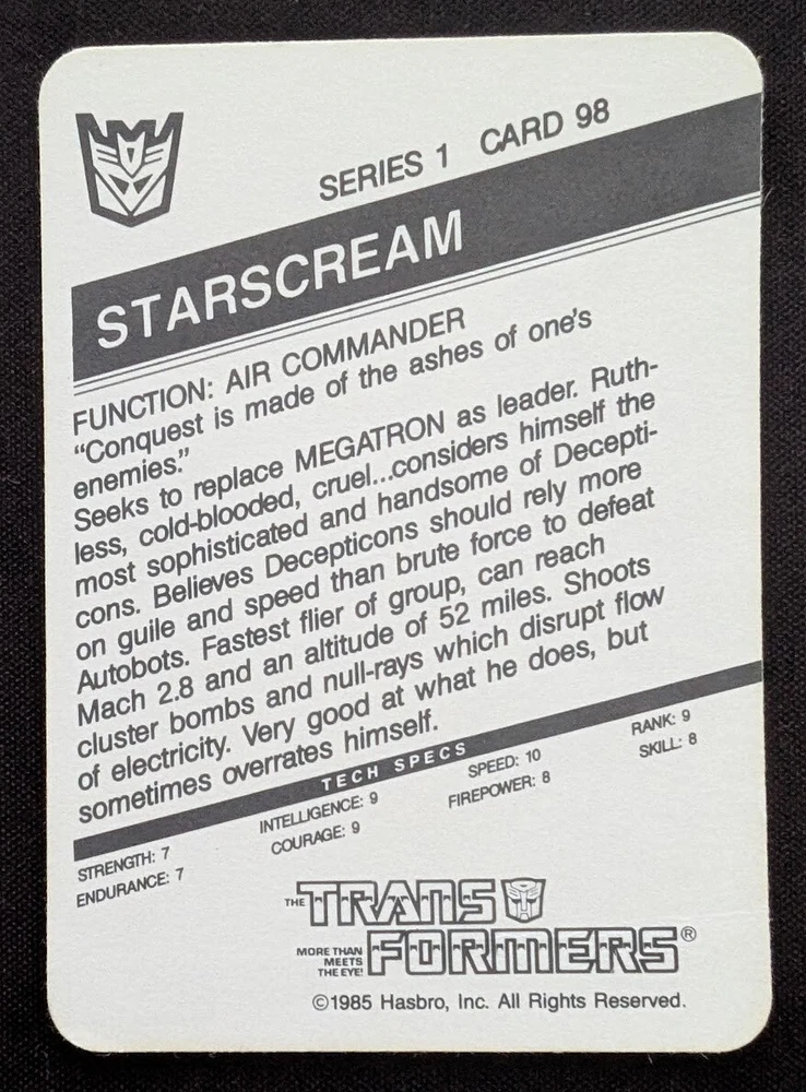 1985 HASBRO TRANSFORMERS SERIES 1 #98 STARSCREAM *ROOKIE* MINT+ *$1 AUCTION*