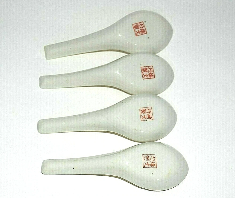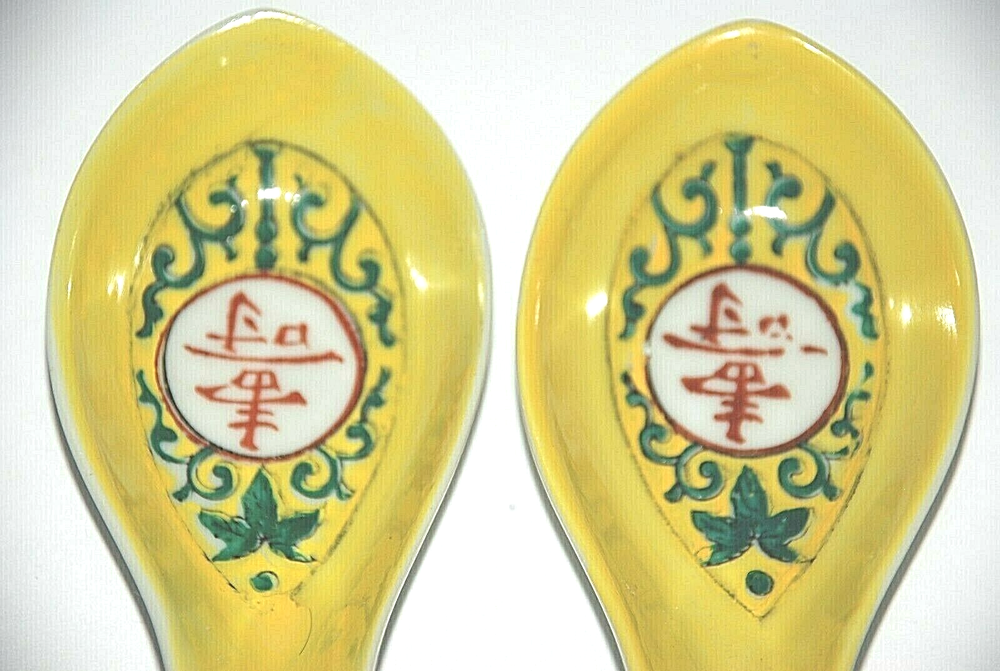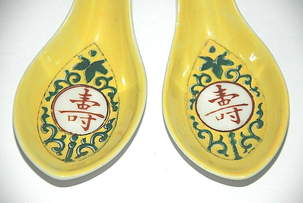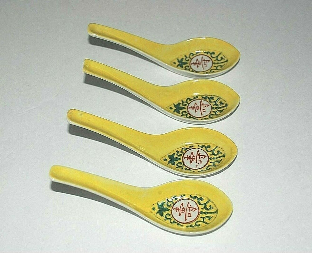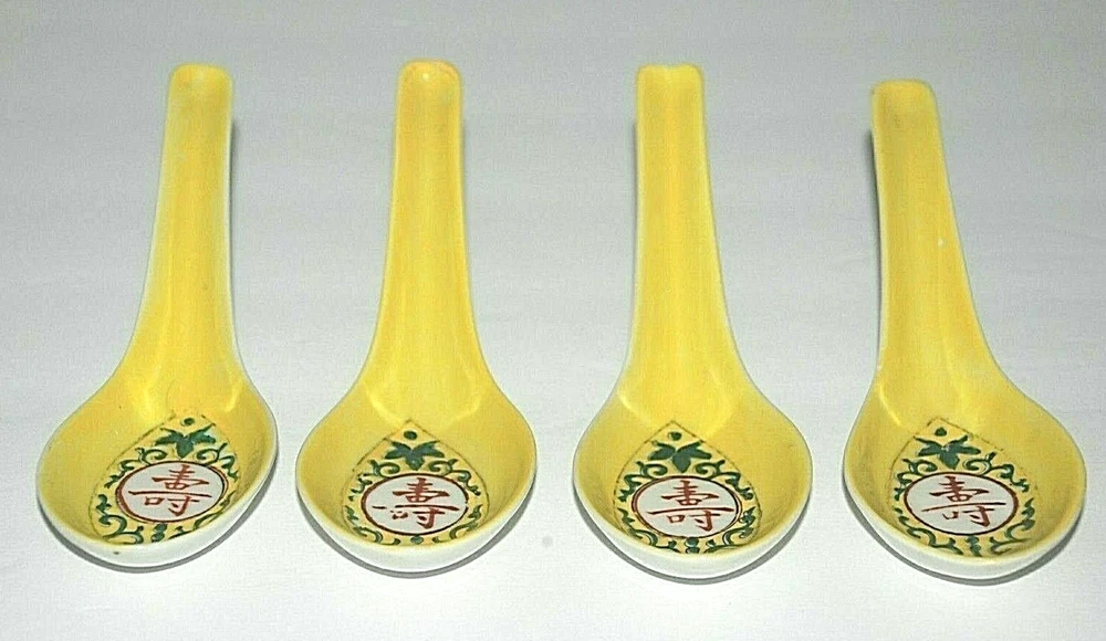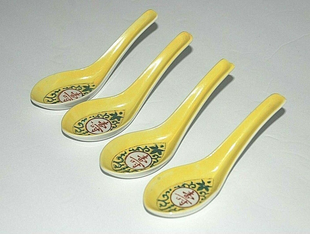 Vintage 1985 Japanese Chinese Soup Rice Spoons Asian Yellow Porcelain Egg Drop Set of 4 . They each measure 5.50" long. There are Chinese characters inside the spoon and the backside . Since I don't read asian characters I don't know what it says. All four spoons are in beautiful pre owned condition with no chips or cracks. They are very clean. They have not been used since the 1980's.