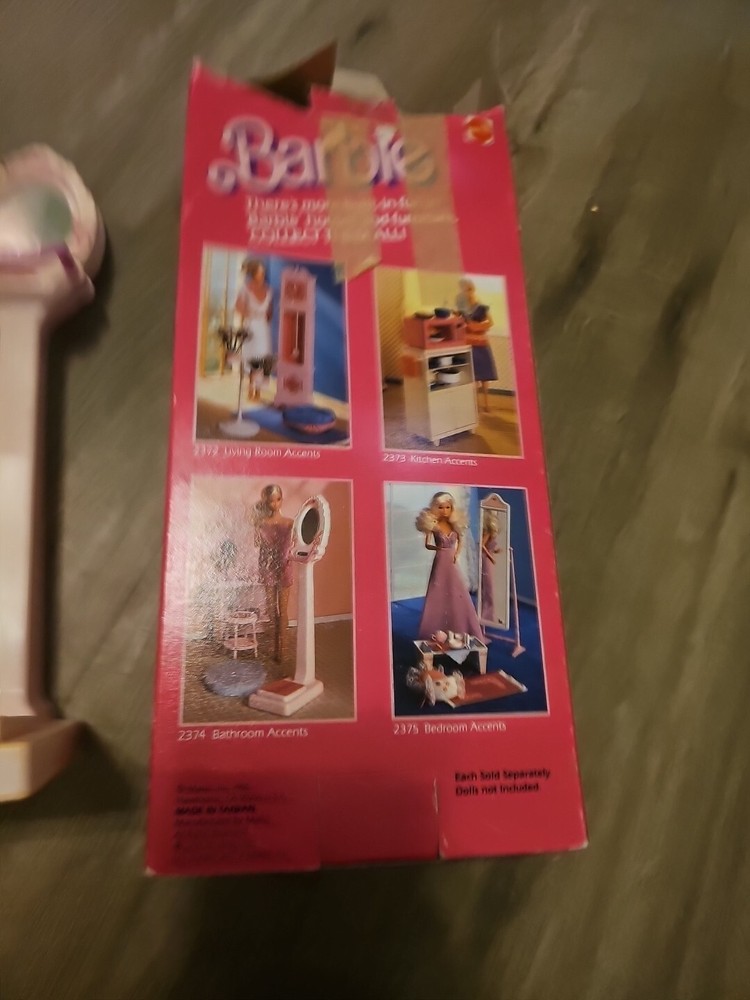 Country/Region of Manufacture: Hong Kong Number of Pieces: 1 Brand: Mattel MPN: 5988 Personalized: No Material: Plastic Room: Bathroom gtin13: 0074299059889 Type: Furniture Original/Licensed Reproduction: Original Handmade: No Doll Age Group: Youth Time Period Manufactured: 1980-1989 UPC: 0074299059889 Color: White Furniture Type: Bathroom Set Character: Barbie Antique: No Unit of Sale: Single Unit Set Includes: Bathroome Set Year Manufactured: 1987 Doll Type: Fashion Doll Compatible Doll Size: 12 in Vintage: Yes