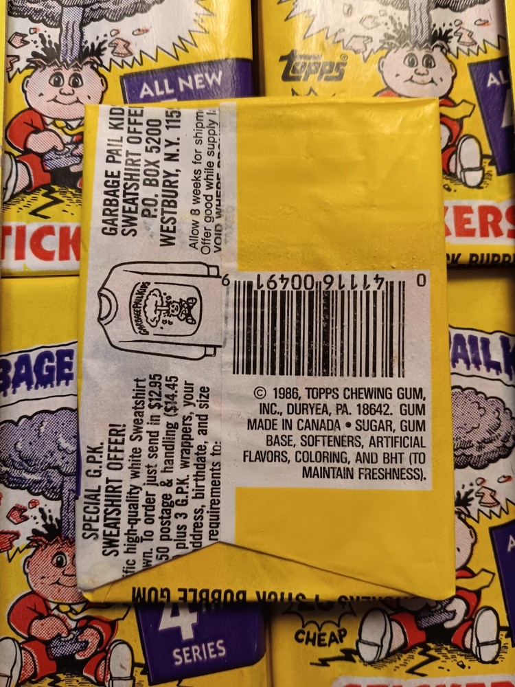 Set:Garbage Pail Kids - Series 4Manufacturer:ToppsCountry/Region of Manufacture:United StatesFranchise:Garbage Pail KidsType:Non-Sport Trading CardNumber of Packs:48Language:EnglishVintage:YesNumber of Cards:240Year Manufactured:1986Configuration:PackCharacter:Box