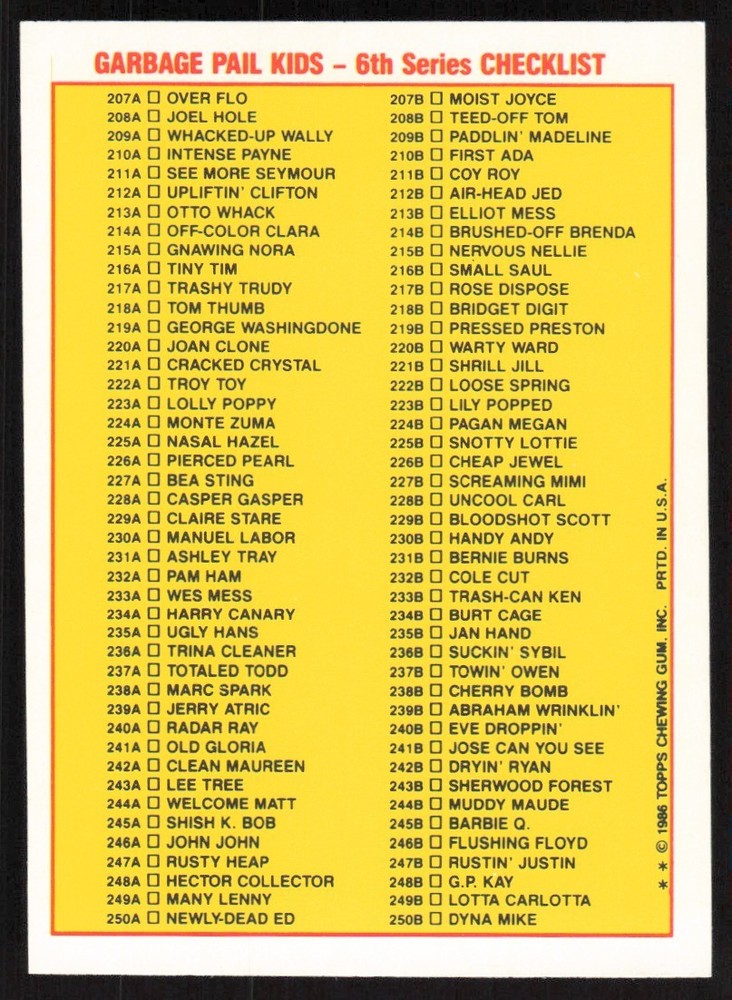 About Me Other Listings Feedback Add to Favorites Contact Me Cams Cards 1986 Garbage Pail Kids Topps Sticker Cards No stock photo / These are real scans or pictures Details Description: Sticker Cards Category: Heroes Year: 1986 Product: Garbage Pail Kids Set: Topps Dimensions: 3½" x 2½" SKU: SH B0001 R01 A (227) Listing By Kronocard trading cards software v2.8.3.2