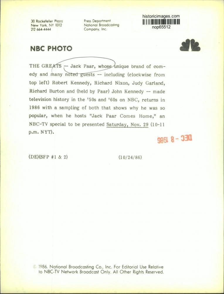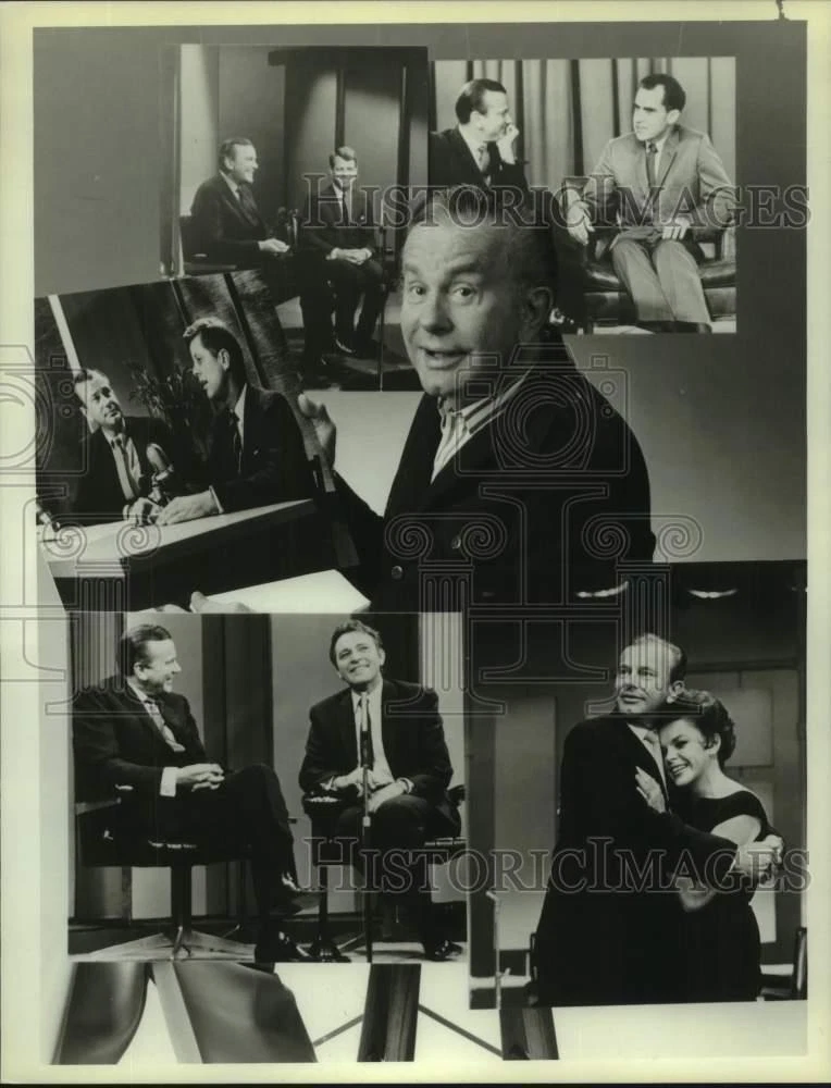 ebay template Note: Please study the images carefully to determine the condition of this vintage photograph, as it may not be in perfect condition. It may contain wrinkles, cracks, and possibly even tears due to its age and how it was handled before it got to us. A scanner may interpret colors and contrast differently than human eyes will, so it is possible that the actual photograph may be slightly darker or lighter in person. This vintage photograph is offered for sale as a collectible item and conveys no transfer of copyright. 1986 Press Photo Jack Paar in composite with guests on NBC-TV show - nop65512 This is an original press photo. Jack Paar, whose unique brand of comedy and many noted guests - including (clockwise from top left) Robert Kennedy, Richard Nixon, Judy Garland, Richard Burton and (held by Paar) John Kennedy - made television history in the '50s and '60s on NBC, returns in 1986 with a sampling of both that shows why he was so popular, when he hosts "Jack Paar Comes Home," an NBC-TV special to be presented on NBC.Photo measures 7 x 9.25inches. Photo is dated 10-24-1986. PHOTO FRONT PHOTO BACK Historic Images Part Number: nop65512 Sell Smarter with Kyozou. Inventory and Ecommerce Management