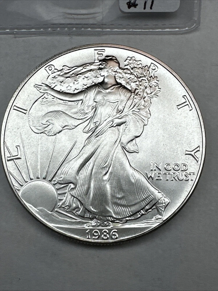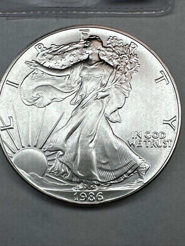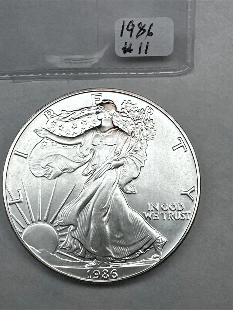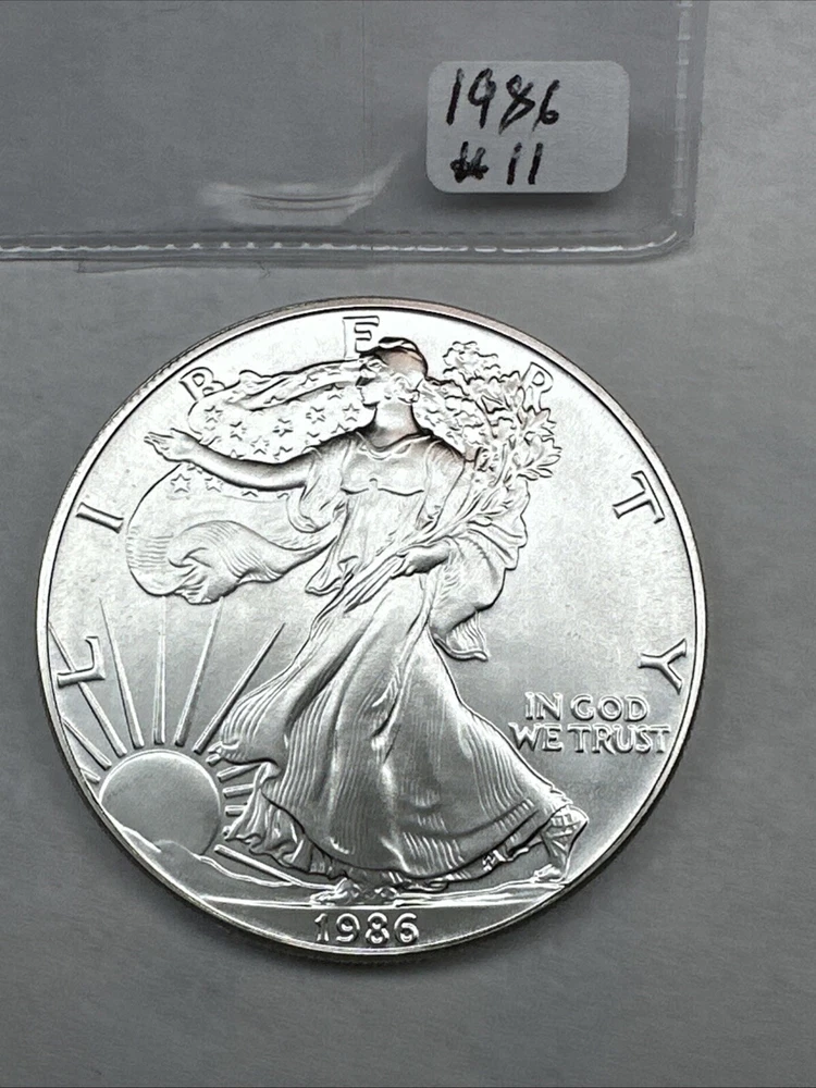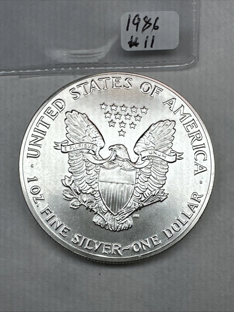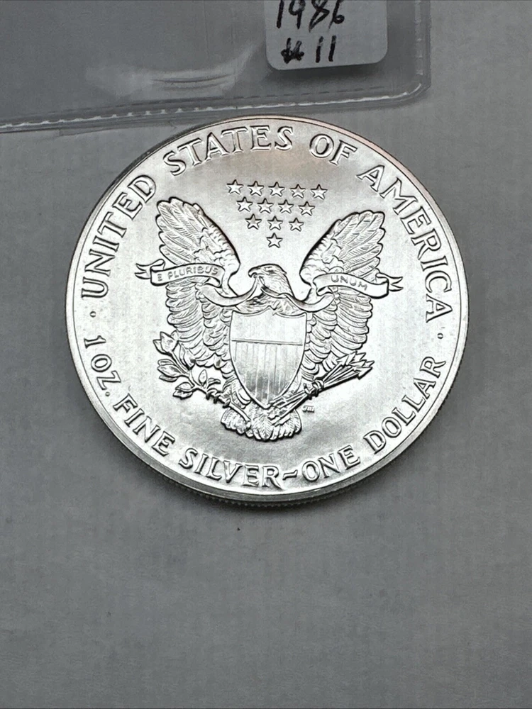 The product is a 1986 Uncirculated Silver American Eagle coin minted by the U.S. Mint. It contains 1 oz of 0.999 fine silver, making it a valuable bullion investment. This coin features the iconic American Eagle design and is a highly sought-after collectible item for coin enthusiasts and investors alike.