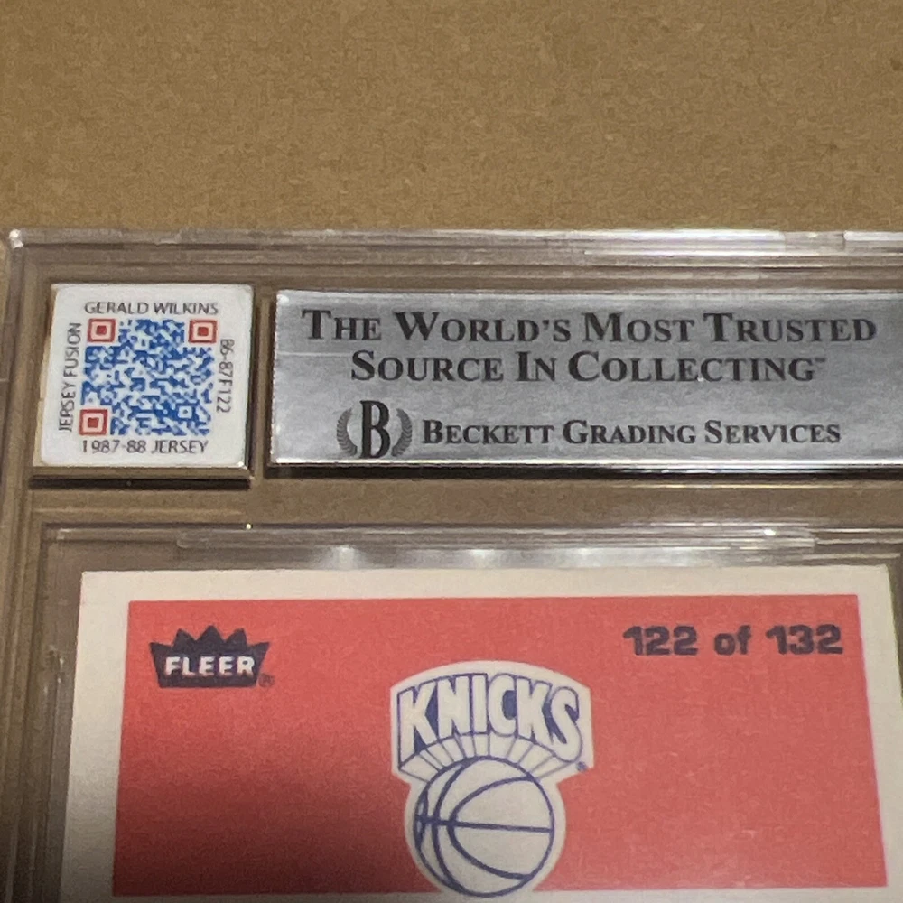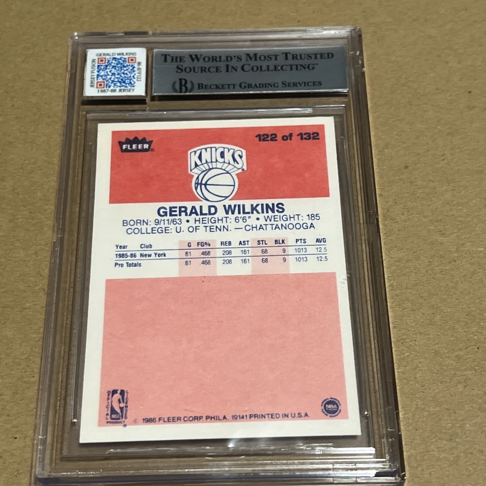 This is a rare and valuable 1986-87 Fleer Jersey Fusion sports trading card featuring Gerald Wilkins of the New York Knicks. The card is made of high-quality card stock, with a hard-signed autograph from the player himself. It is an original piece from the Fleer manufacturer, and a part of the 1986 base set. The card also includes a game patch and is graded BGS 8, making it a highly sought-after item for collectors. It is a vintage piece from the National Basketball Association (NBA) era and is a must-have for any basketball memorabilia enthusiast. This card is a parallel variety with a patch and is a rookie card, making it even more valuable.