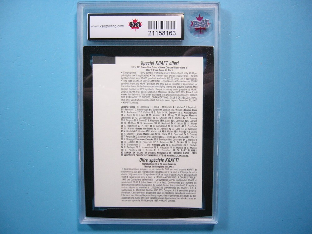 YOU ARE BIDDING ON A 1986/87 KRAFT DRAWINGS NHL HOCKEY CARD #NNO MARIO GOSSELIN, QUEBEC NORDIQUES. CARD IS GRADED 10 BY KSA IN GEM MINT CONDITION. SEE SCANS FOR FURTHER CONDITION. GREAT COLOUR & GLOSS--A VERY SHARP, CLEAN & ATTRACTIVE POPULAR CARD FROM THIS UNIQUE KRAFT DRAWINGS NHL HOCKEY SET!!! THANK YOU FOR LOOKING AND GOOD LUCK!!! -------------------------------------------------------------------------------------------------------------------------------- SHIPPING WITHIN CANADA IS $4.99. SHIPPING TO THE UNITED STATES IS $8.99 AND INCLUDES TRACKING & INSURANCE. SHIPPING INTERNATIONALLY (ANYWHERE ELSE) IS $25.00 AND INCLUDES TRACKING & INSURANCE. ITEM WILL BE CAREFULLY PACKAGED SO AS NOT TO GET DAMAGED DURING SHIPPING. IF YOU ARE IN CANADA AND WOULD LIKE SHIPPING WITH TRACKING & INSURANCE INCLUDED COST IS $12.99. PLEASE CONTACT US BEFORE PAYMENT IS MADE TO ADJUST THE INVOICE ACCORDINGLY. WE DO COMBINE SHIPPING ON MULTIPLE PURCHASES--ONLY $1.00 MORE FOR EACH ADDITIONAL SINGLE GRADED CARD OR ONLY 25 CENTS MORE FOR EACH ADDITIONAL SINGLE UNGRADED CARD. TAKE A LOOK AT OUR OTHER AUCTIONS AND SAVE ON SHIPPING!!!