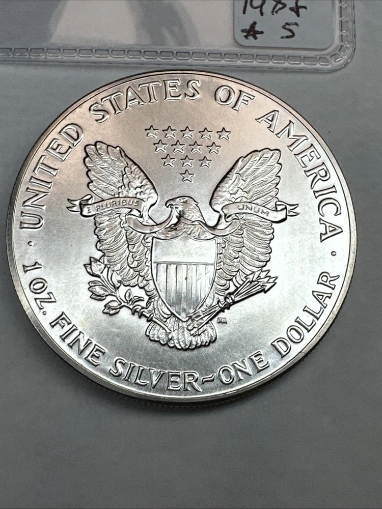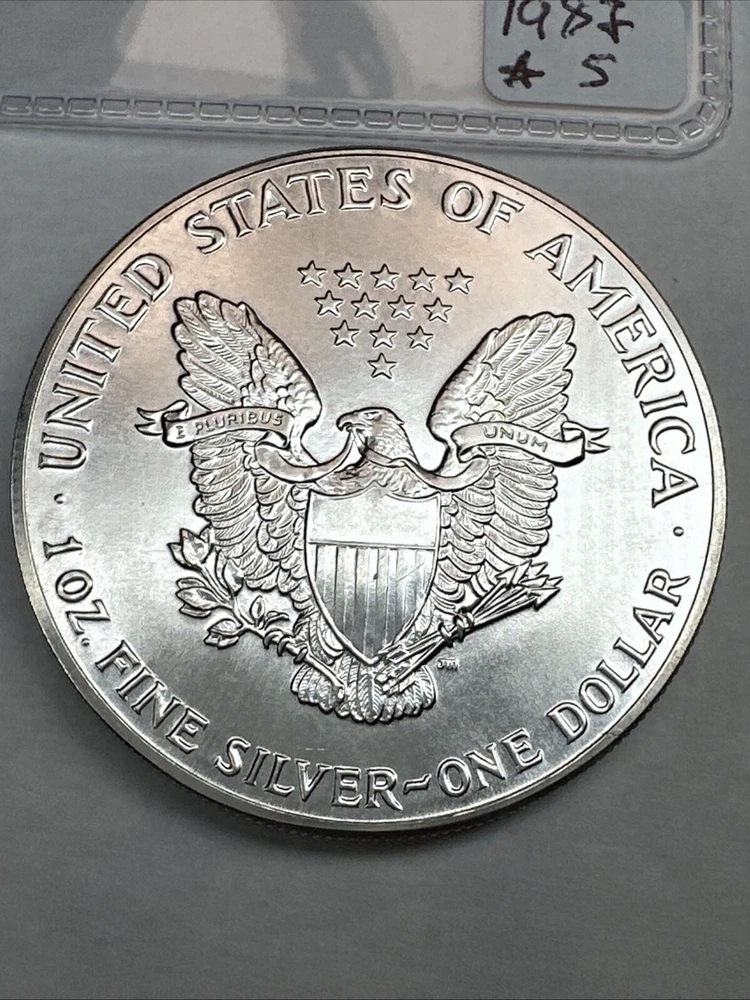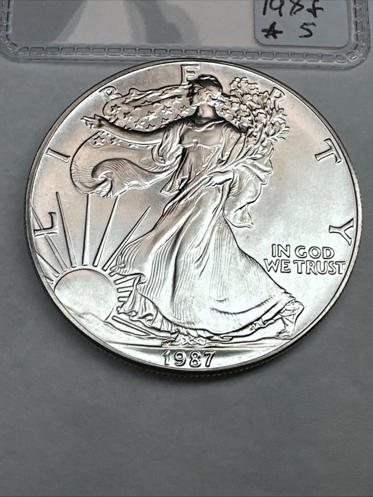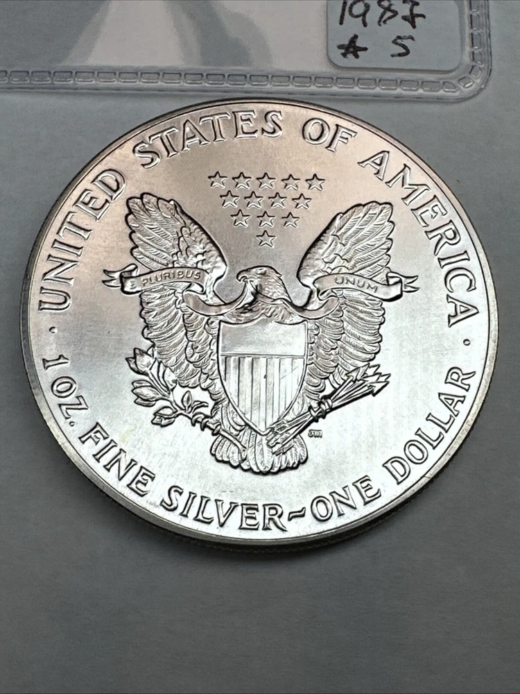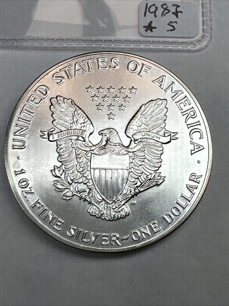 Composition: Silver Brand/Mint: U.S. Mint Strike Type: Business Coin: American Eagle Fineness: 0.999 Country/Region of Manufacture: United States Precious Metal Content per Unit: 1 oz Total Precious Metal Content: 1oz Certification: Uncertified Year: 1987 Brand: Silver Eagle Grade: Ungraded