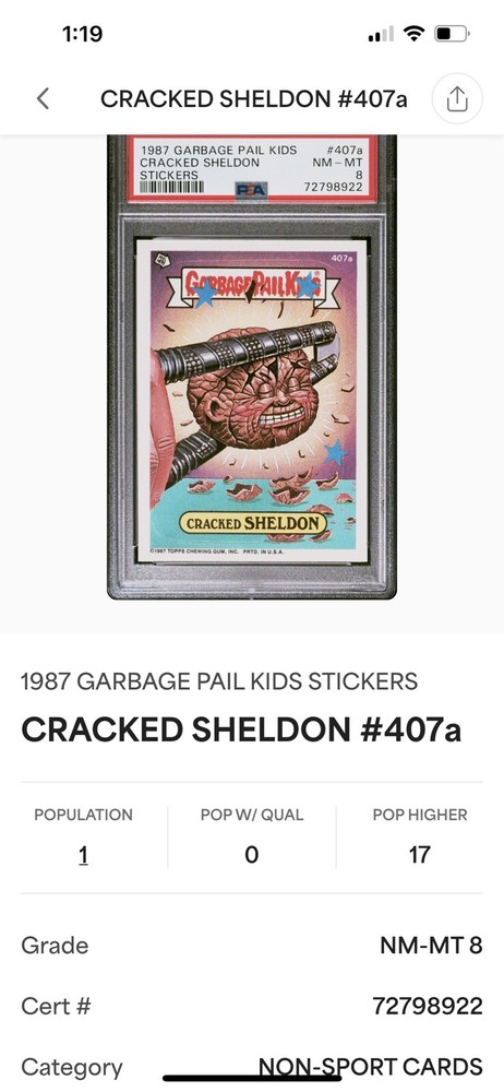 1987 GARBAGE PAIL KIDS STICKERS #407a CRACKED SHELDON PSA 8 - Pop 1, 17 Higher.