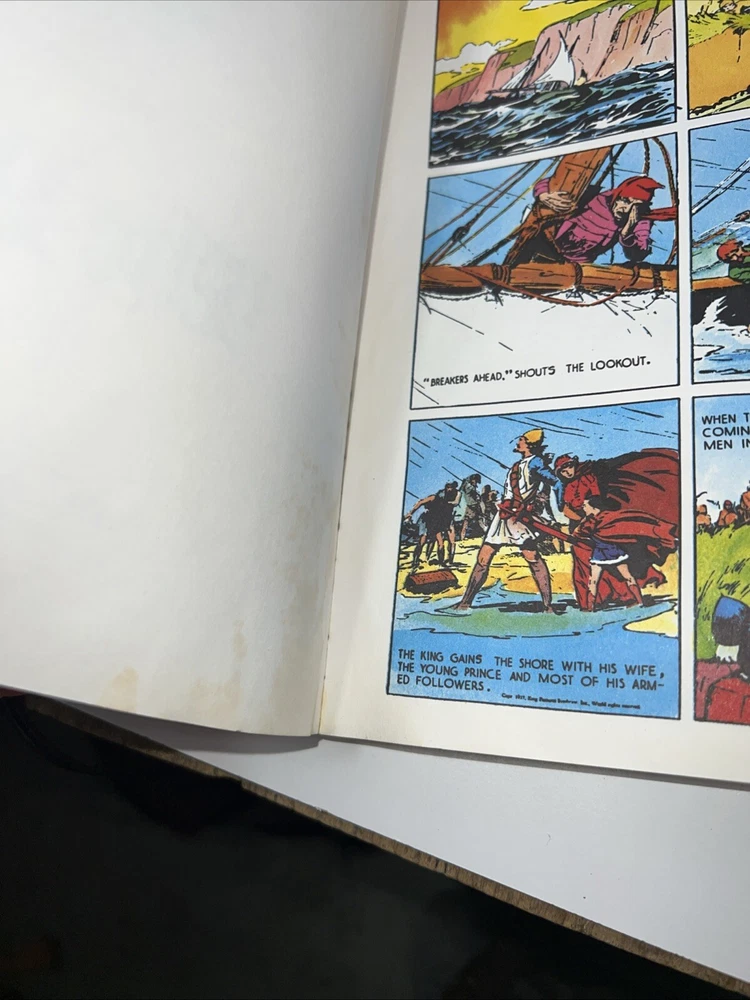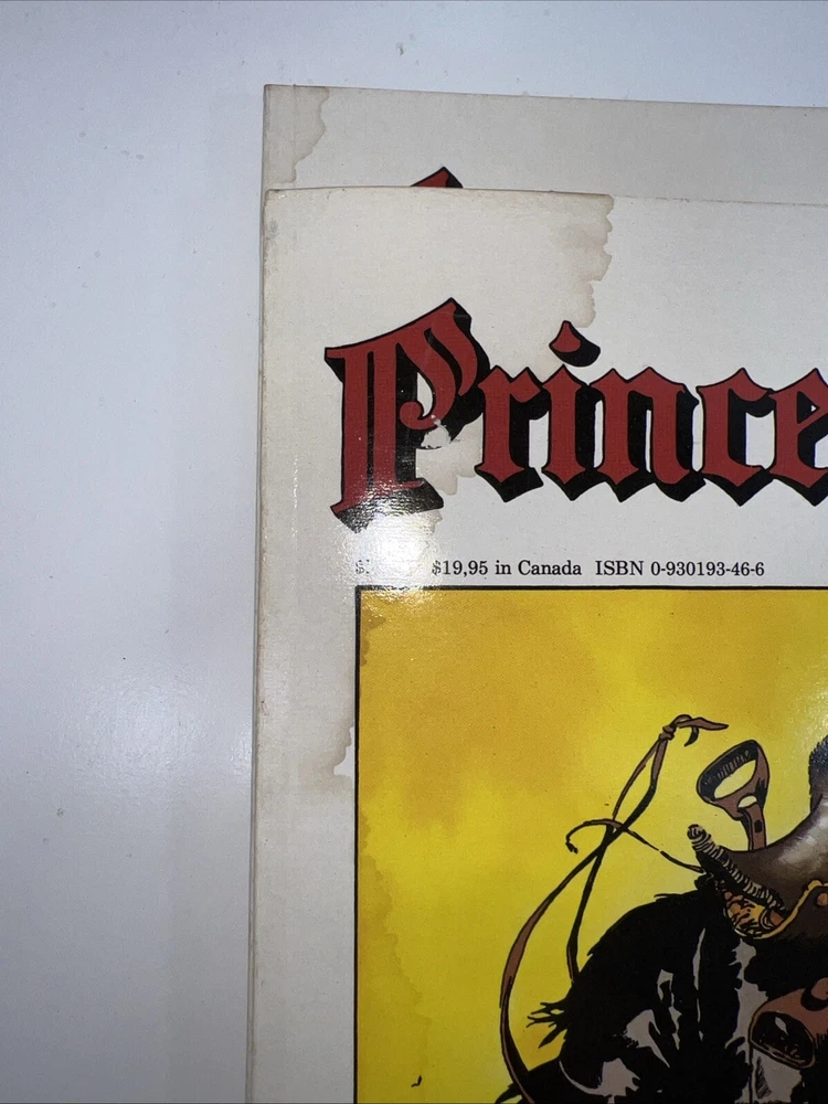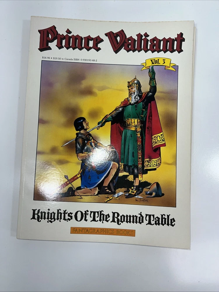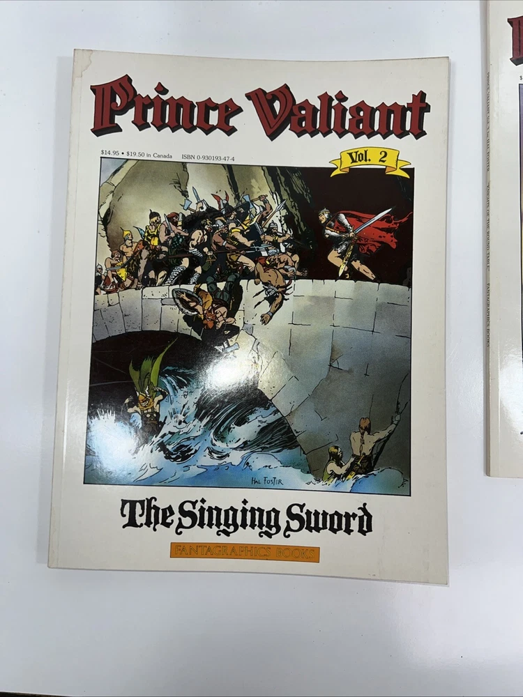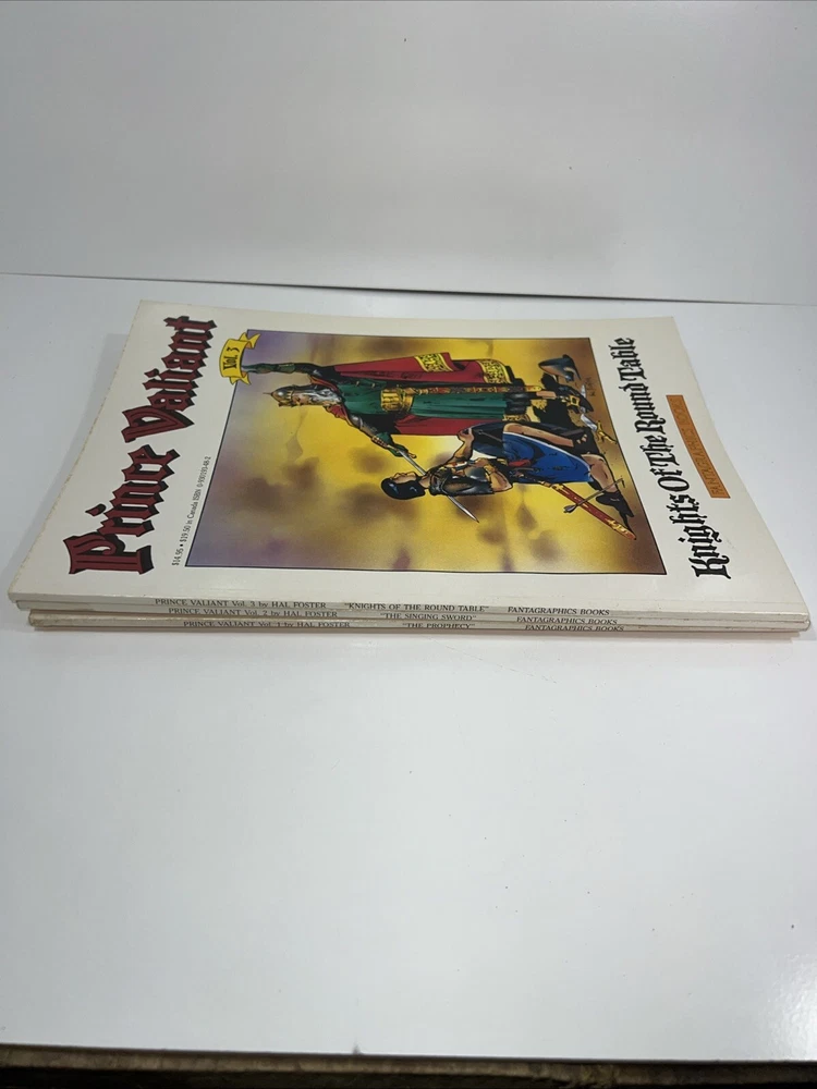 The product is a set of three softcover comic books from the "Prince Valiant" series by Hal Foster, published in 1987 by Fantagraphics Books during the Copper Age of US Comics. The titles included in this set are "The Prophecy," "Singing Sword," and "Knights Of Round Table." The series follows the adventures of Prince Valiant in the world of knights and medieval tales. Additionally, the product also features the superhero team S.W.O.R.D., adding an extra layer of excitement to the storyline. Vol #1 has some water damage on the first 2 pages.