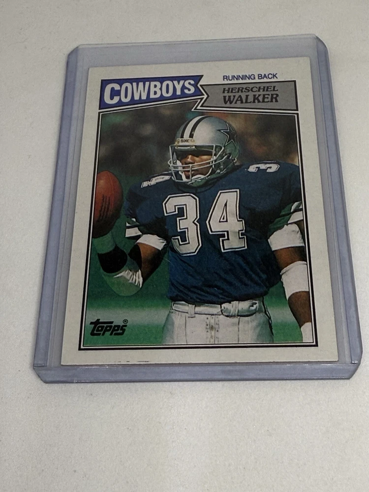 This 1987 Topps sports trading card features Herschel Walker, a former Dallas Cowboys running back. The card is part of the base set and is a rookie card, making it a must-have for any collector. The card number is 264 and it is from the 1987 season. The card is in excellent shape and is near mint or better, despite being ungraded. It is a great addition to any sports trading card collection and would make a fantastic gift for any football fan. This card is a part of the National Football League (NFL) and is a must-have for any fan of the sport.