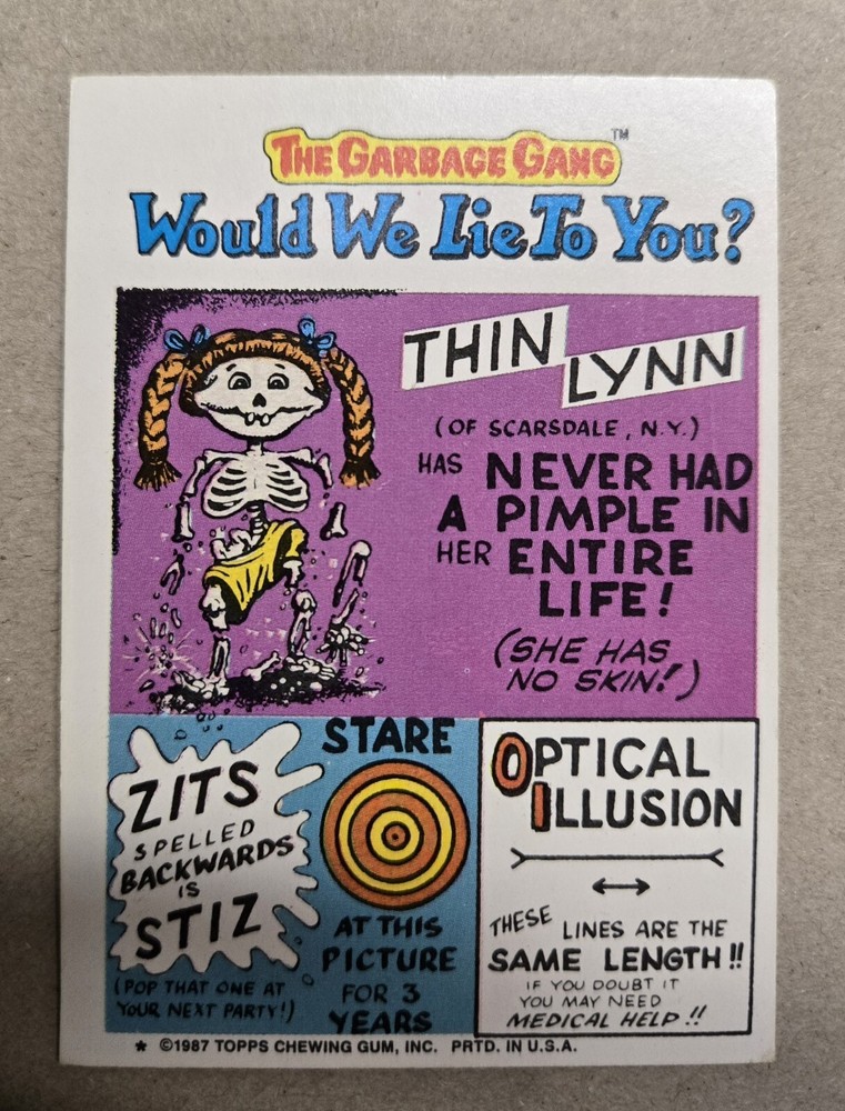 Carte à échanger de la série 9 des Garbage Pail Kids de 1987, numéro 343b : Al Catraz. Cette carte en carton épais présente le personnage Al dans un style parodique et comique. Elle est un élément original de collection, avec des caractéristiques de sticker et des dimensions standard. Parfaite pour les amateurs de Garbage Pail Kids et de cartes à collectionner non sport.
