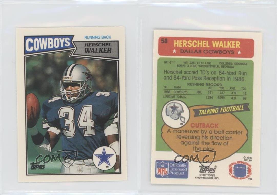 1987 Topps United Kingdom American Football - [Base] #58 Herschel Walker - Rookie - Football Card - Featuring the Dallas Cowboys - Featuring Herschel Walker Search for more: 1987 Topps United Kingdom American Football Search for more: 1987 Topps United Kingdom American Football - [Base] View all of our Listings Auctions Buy It Now About Us Located in the beautiful Pacific Northwest, COMC (Check Out My Cards) is the world's largest consignment service for trading card singles. More than 10,000 people have used our consignment service to list over 50 million trading cards. We currently house 20 million cards, each listed for sale with front and back images of the actual card. Find out how we can help you consign your items on eBay by contacting us through eBay messaging. COMC -- "The Safe & Easy Way to Buy & Sell" Representative Image - Select Specific Item above to see image of actual item Representative Image - Select Specific Item above to see image of actual item Raw Condition for Modern Cards Unless otherwise noted, raw modern cards are listed in Near Mint-Mint condition or better. A NM-MT card appears to be Mint at first glance, but upon closer inspection, may exhibit some of the following: minor print defects (e.g. roller marks, print line, dimple), minor scratches, slight edge wear, and slight corner wear. Centering is clearly visible in the images provided and does not factor into our condition assessment. Raw Condition for Vintage Cards Unless otherwise noted, raw vintage cards are listed in Excellent condition or better. An EX card may exhibit some of the following: minor rounding of corners, surface wear, print defects, light scratches, and slight edge wear/chipping. Centering is clearly visible in the images provided and does not factor into our condition assessment. Domestic Shipping Combined shipping for multiple items is available. To receive combined shipping, please ensure all desired items are in your eBay shopping cart before proceeding to checkout. eBay limits orders to 40 items per order. We automatically combine multiple orders placed on the same day. If you place multiple orders on the same day, please contact us to request a refund of applicable shipping costs. Signature confirmation may be required on invoices over $400. Raw cards are shipped in toploaders. International Shipping COMC offers eBay's International Shipping (EIS) for international orders under $2,500* (see country exceptions below). All duties and import fees are paid at checkout; in the rare event that there are additional import fees upon delivery, these are borne by the buyer. EIS packages route through a shipping hub in Erlanger, KY before shipping to their final destination. Please note that EIS does not allow for combined shipments. The shipping rates are determined by eBay and cannot be adjusted. *Maximum sale price exceptions: Colombia, Kuwait ($2,000); Taiwan ($1,539); Chile, Costa Rica, Guatemala, Honduras, Trinidad and Tobago ($1,000); Antigua and Barbuda, Aruba, Belize, Dominica, Grenada, Philippines, Saint Kitts and Nevis, Saint Lucia, Montserrat, Turks and Caicos Islands ($500); Dominican Republic, El Salvador ($200). Please request a shipping quote through eBay messaging for orders that exceed the maximum sale price supported by eBay's International Shipping. You will be responsible for all duties and import fees for international orders shipped outside the EIS. Raw cards are shipped in toploaders. Payment COMC does not accept offers on our cards through our eBay storefront. COMC utilizes eBay’s managed payments system. If you are experiencing difficulties making a payment, please contact eBay for assistance. Return Policy Returns are only accepted on the rare occasion the item is not as described. If you are making a return, please initiate the return process through eBay so a mailing label can be provided for you. Prior to listing, our expert team carefully assessed this item to represent it accurately. Please review the description and high-definition images prior to purchasing to ensure this item meets your satisfaction. We welcome you to contact us if you have further questions about this item. Trust and Integrity COMC carefully assesses each item consigned to us to prevent fraudulent items from entering the marketplace. If you believe an item offered on COMC may be fraudulent, please contact us with details so we can investigate the issue. Items we determine are outside our supported items policy may be removed. Last Modified: 11/25/2024 4:41:43 AM PDT
