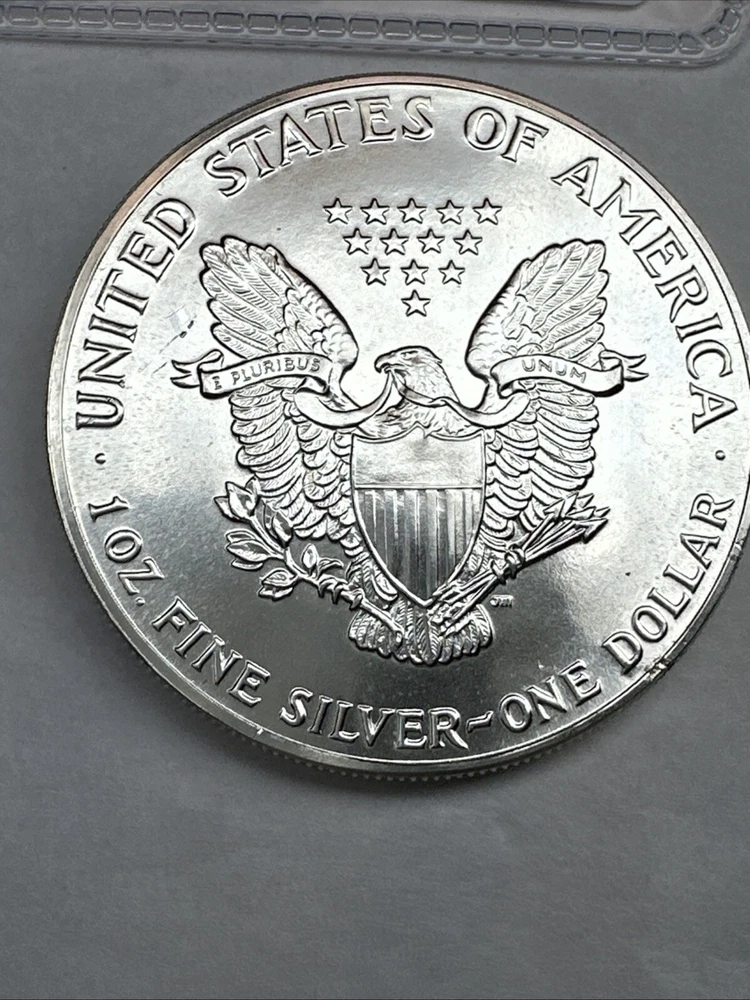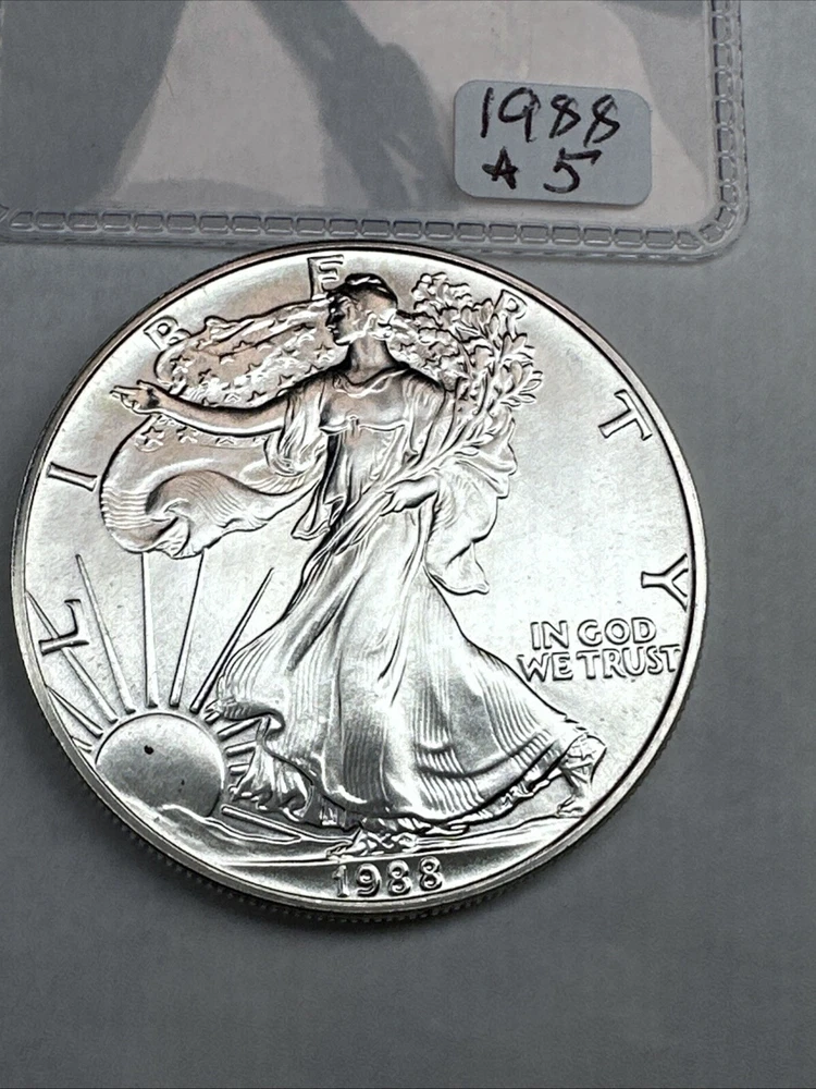 The product is a 1988 American Silver Eagle coin, minted by the U.S. Mint. It contains 1 oz of .999 fine silver, marked with a business strike type. The coin features the iconic Silver Eagle design and is certified as Brilliant Uncirculated.