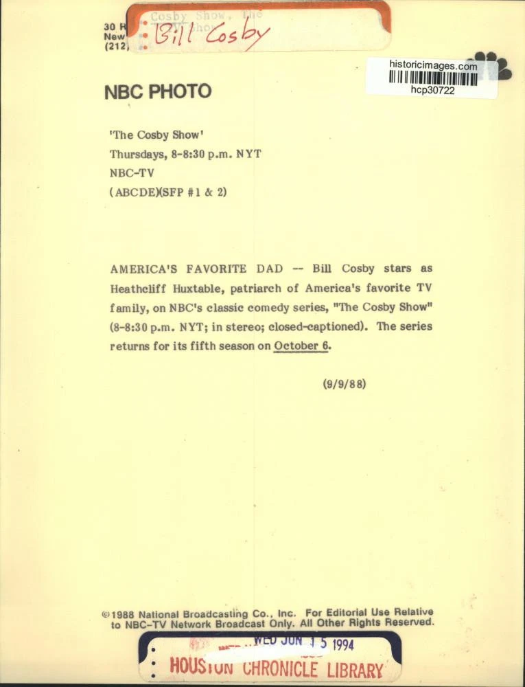 ebay template Note: Please study the images carefully to determine the condition of this vintage photograph, as it may not be in perfect condition. It may contain wrinkles, cracks, and possibly even tears due to its age and how it was handled before it got to us. A scanner may interpret colors and contrast differently than human eyes will, so it is possible that the actual photograph may be slightly darker or lighter in person. This vintage photograph is offered for sale as a collectible item and conveys no transfer of copyright. 1988 Press Photo Bill Cosby stars in "The Cosby Show" - hcp30722 This is an original press photo. Bill Cosby stars as Heathcliff Huxtable, patriarch of America's favorite TV family, on NBC's classic comedy series, "The Cosby Show." The series returns for its fifth season on October 6. Photo measures 7 x 9inches. Photo is dated 9-9-1988. PHOTO FRONT PHOTO BACK Historic Images Part Number: hcp30722 Sell Smarter with Kyozou. Inventory and Ecommerce Management
