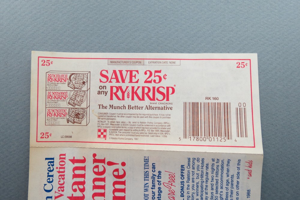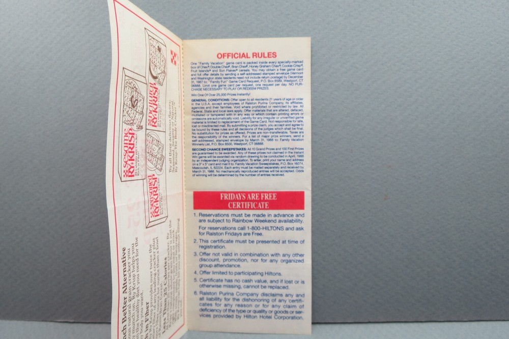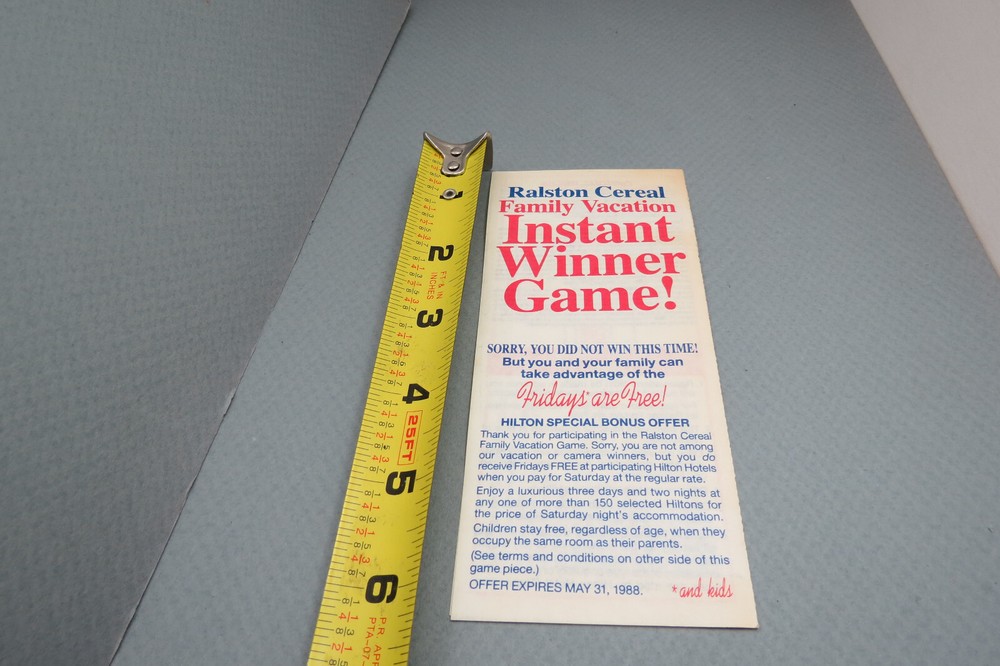 This is a rare and unique piece of collectible advertising from Ralston Cereal. The 1988 Box Insert Family Vacation Game Piece & Ry-Krisp Coupon is a must-have for any cereal or advertising enthusiast. The piece features a white color scheme and was manufactured in the United States. It is an original and authentic collectible item that will make a great addition to any collection. The game piece is perfect for display or play, and the Ry-Krisp Coupon adds to the overall value of the item. This piece is a great representation of the cereal's brand and type of advertising, making it a valuable addition to any collection. The game piece tells you whether you were an instant winner of the family vacation, and in that notice gives you a coupon for Hilton as well as the coupon for the Ry-Krisp