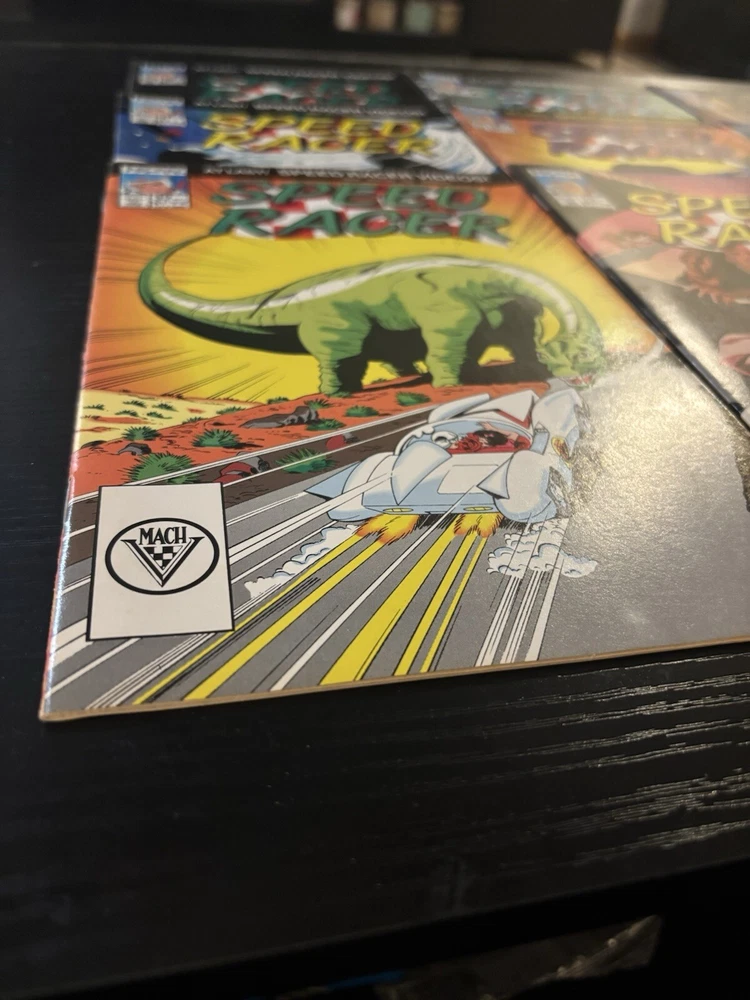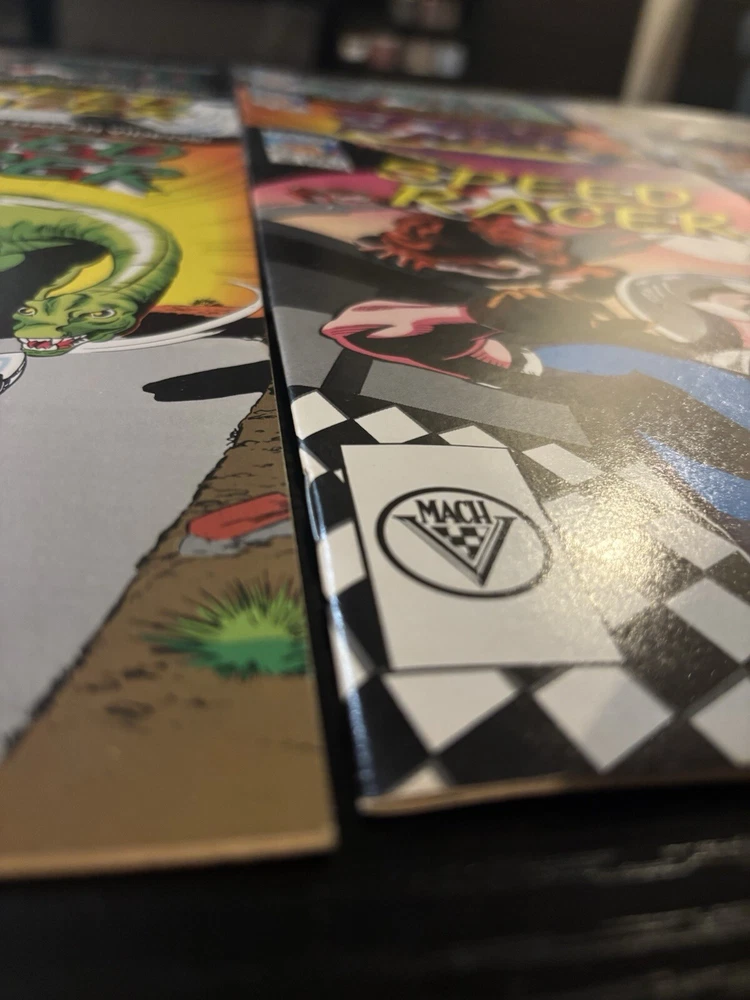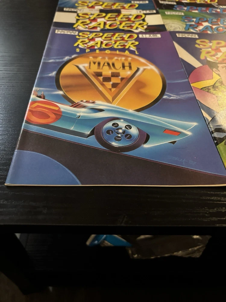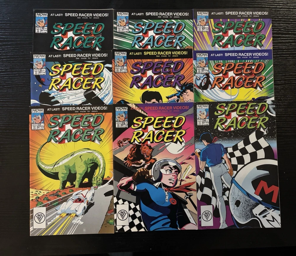 Dive into the high-speed world of Speed Racer with this complete set of 1988 Mach 5 Special Comic Lot, featuring issues 1-16,28,30-36. Published by NOW Comics, this series captures the essence of the classic animated series, bringing the thrill of racing and adventure to life through vibrant color illustrations and action-packed storytelling. A must-have for fans and collectors alike, each comic book in this lot is a first printing, showcasing the work of artists and writers who defined the Copper Age of comics. Enjoy the adventures of Speed Racer and his faithful Mach 5 in a storyline that's as engaging today as it was at the dawn of its publication in 1987.