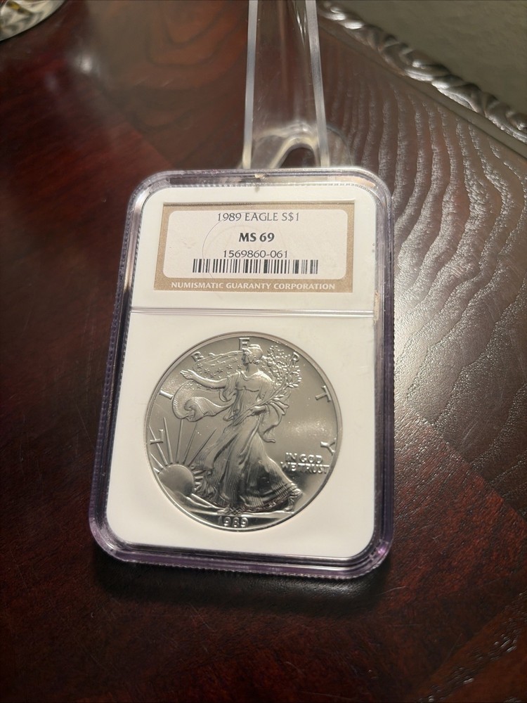 The product is a 1989 American Silver Eagle 1oz MS69 NGC Brown Label coin. This coin is composed of 0.999 fineness silver and has a precious metal content of 1 ounce. It is a business strike and has been certified by NGC. This coin is minted by the U.S. Mint and is a popular choice for collectors and investors looking for high-quality silver coins. The coin features the iconic American Eagle design and is a valuable addition to any collection. Free shipping adds convenience for buyers.