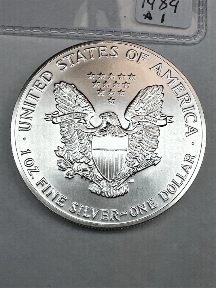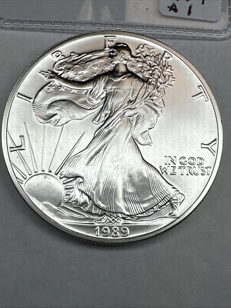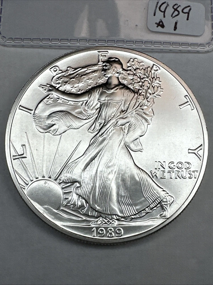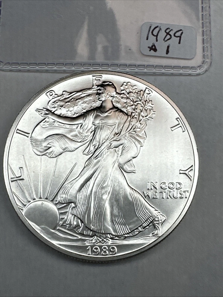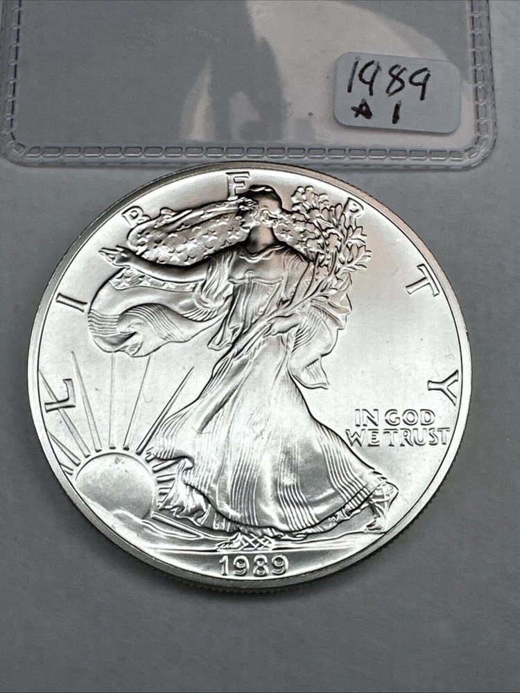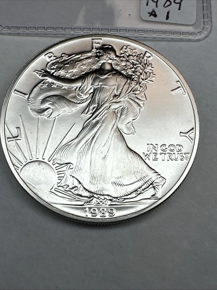 Fineness: 0.999 Country/Region of Manufacture: United States Grade: Ungraded Brand/Mint: U.S. Mint Composition: Silver Coin: American Eagle Precious Metal Content per Unit: 1 oz Brand: Silver Eagle Strike Type: Business Certification: Uncertified Total Precious Metal Content: 1oz Year: 1989