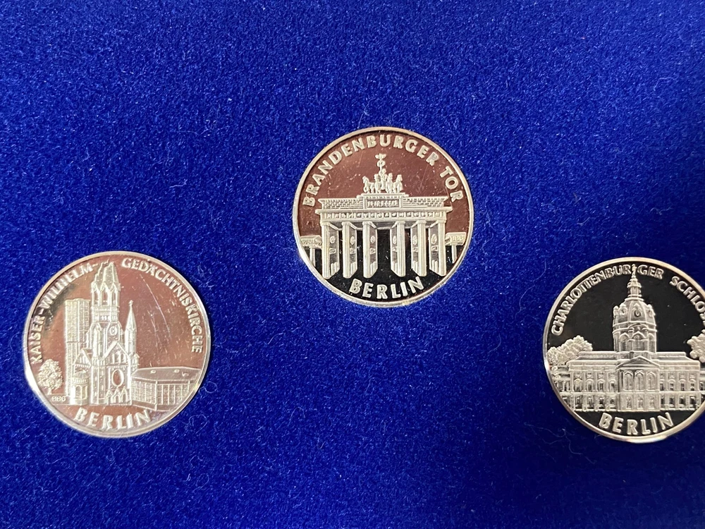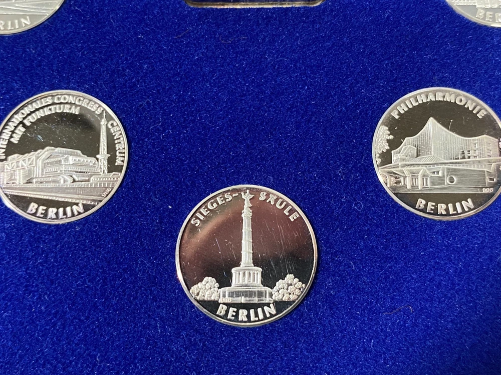 THIS IS A GREAT COMMEORATIVE COIN AND BAR SET OF THE FALL OF THE BERLIN WALL. .999 PURE SILVER DEPICTING LANDMARKS ( frame is 7.25" x 5.5" ) 10 COINS / 1 BAR EXCELLENT CONDITION OTHER THAN A FEW MINOR SCUFFS /SCRATCHES PLEASE EXAMINE PICTURES CAREFULLY FOR CONDITIONN AND SPECIFICS THANKS.,