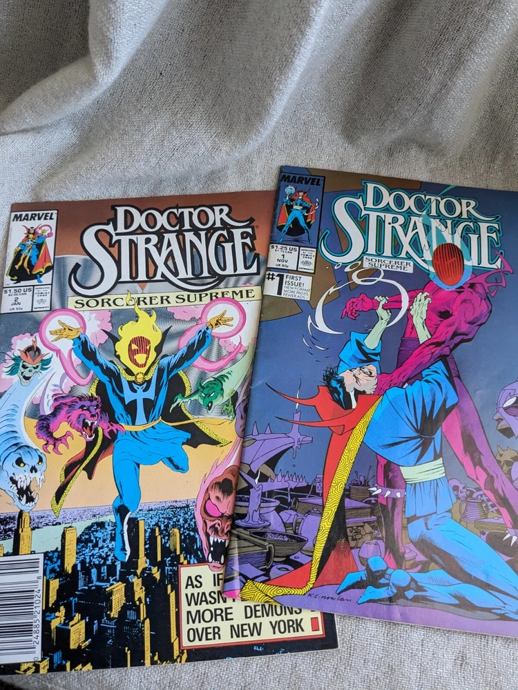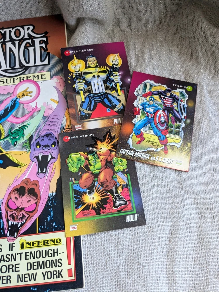 Two comics : Dr Strange Sorcerer Supreme #1 1988 and Dr Strange Sorcerer Supreme 1989 vol 12. And Three vintage Marvel trading cards: Hulk, The Punisher and Captain America. If you want something separate, let me know, I can make a new different listing, if not, these all come in a bundle together.