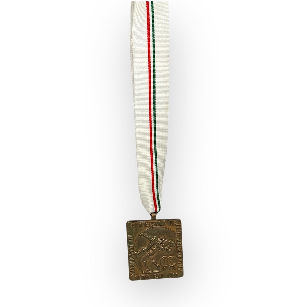Gold Medal 🥇 at the FILA Junior World Championships in Greco-Roman wrestling. Event: Championnat du Monde Espoir de Lutte Gréco-Romaine (World Junior Greco-Roman Wrestling Championship) Fighter: Néstor Almanza Baró, won the world junior title in Budapest in Greco-Roman wrestling (lightweight category) Year: 1989 Location: Budapest, Hungary Organization: FILA (Fédération Internationale des Luttes Associées, now United World Wrestling) Shape: Rectangular with relief design Design (obverse) Central relief of two wrestlers in Greco-Roman combat French inscription: “CHAMPIONNAT DU MONDE ESPOIR DE LUTTE GRECO-ROMAINE – BUDAPEST 1989” FILA logo with Olympic rings Ribbon: White ribbon with red and green stripes (colors of Hungary) Condition: Vintage collectible medal, preserved with natural patina and minor signs of age Medalla de Oro 🥇 del Campeonato Mundial Juvenil (Junior World Championship) de la FILA en lucha grecorromana. Evento: Championnat du Monde Espoir de Lutte Gréco-Romaine (Campeonato Mundial Juvenil de Lucha Grecorromana) Luchador: Néstor Almanza Baró, ganó el título mundial juvenil de lucha grecorromana en Budapest (Hungría), en la categoría ligera (74 kg). Año: 1989 Lugar: Budapest, Hungría Organización: FILA (Fédération Internationale des Luttes Associées, hoy United World Wrestling) Forma: Rectangular con relieve Diseño (anverso) Relieve central de dos luchadores en combate grecorromano Inscripción en francés: “CHAMPIONNAT DU MONDE ESPOIR DE LUTTE GRECO-ROMAINE – BUDAPEST 1989” Logotipo de FILA con los anillos olímpicos Cinta: Cinta blanca con franjas rojas y verdes (colores de Hungría) Condición: Medalla vintage de colección, con pátina natural y leves marcas de antigüedad