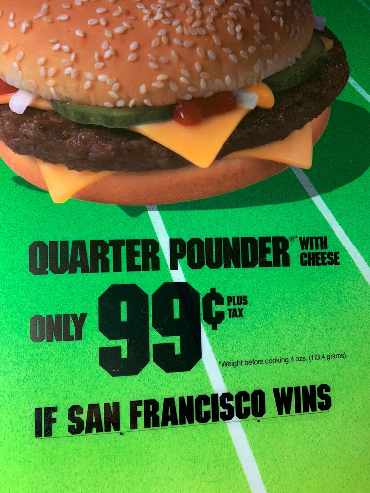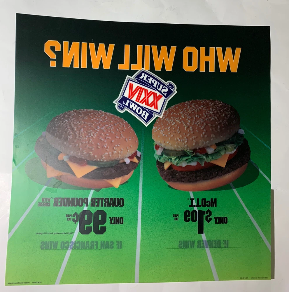 1989 McDonald's Who Will Win Super Bowl XXIV Translite Store Display Sign 21 3/4” x 21 3/4” Has scratches and dents(refer to pictures) Has a large dent on one side(pictured) Will be shipped rolled up in a poster tube Please feel free to ask any questions m.