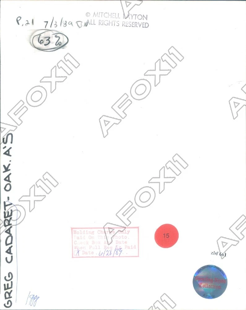 1989 Oakland Athletic Baseball Player Pitcher Greg Cadaret You are bidding on an original press photo of Oakland Athletic Baseball Player Pitcher Greg Cadaret. It shows the pitcher in a press shot for the team. Photo measures 8 x 10 inches and is dated 6/28/1989. Did you know we have two stores on eBay? You may be interested in our other photos in cootsimagery-deluxe or in our cootsimagery store. About our Photographs and Listings We have acquired one of the largest collections of Original AP, UPI and various other news service photos from several news media outlets. Most of our photographs are in great condition considering they are 20 - 90 years old. Subjects are practically unlimited so if you are interested in something particular please let me know and I will try to get an appropriate listing going for you. We handle our photographs with care once they get to us, but due to their age, the photographs may have some cracks, tears, and wrinkles that they received before they arrived in our care. Please look carefully at the pictures as they will give you the best indication of the condition of the photograph. We sell only original vintage photographs acquired from news outlets across the country. You can be assured that what you are purchasing is an original item from a news archive and has not been reproduced by us. Most items will have a date stamp on the back to indicate exactly when they were first used in the newspaper. When the photographs are scanned, the online pictures are given a "cootsimagery" digital watermark. It is only on the picture online and is not on the photograph itself. Our listing titles are based solely on information from press sources provided on the backs of the photos and occasionally some basic research which is not always 100% accurate, but this is all of the information that we have to go on, since we are not professional historians. We apologize for any inaccuracies or mistakes. As a general rule, auction items that receive no bids are relisted as Fixed-Price items at a higher price than the starting auction bid price. We add new inventory every week, so check back often! Shipping and Handling When a photograph is purchased from us, each order is packed with care between two cross-corrugated sheets of cardboard and wrapped in a plastic sleeve to ensure the packages are as difficult to bend as possible and offer some moisture protection. Shipping is charged per order and may not be combined with other seller IDs, per eBay's policy. We encourage customers interested in multiple auctions to bid and check out after all of your auctions have ended so that all items will be in the same order and subject to only one shipping charge. eBay should automatically combine shipping when you choose the Add to Cart option. Whether you buy one or 100 photos from this seller ID, the shipping charge will be the same, one flat fee for domestic or international shipments. Check the Shipping and payments tab for current rates. We ship orders Monday through Friday. We do not ship on weekends or holidays. Our standard processing time is one business day from time of cleared payment. Customs charges, import taxes, duties, etc. are the sole responsibility of the buyer. You may contact your local customs office to help you determine what these fees may be. We will not mark our shipments as anything other than merchandise. Payment Information We accept Paypal and all major credit cards through eBay's payment system. Please check the Shipping and payments tab for a complete list. Please make sure to close your tab with us within 30 days of the end date of your earliest purchased item, to ensure a smooth transaction. We leave positive feedback after receiving cleared payment, and we always welcome your positive feedback. Powered by SixBit's eCommerce Solution