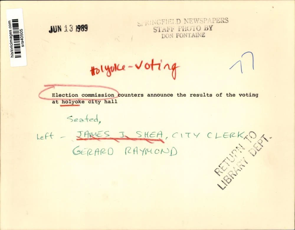 ebay template Note: Please study the images carefully to determine the condition of this vintage photograph, as it may not be in perfect condition. It may contain wrinkles, cracks, and possibly even tears due to its age and how it was handled before it got to us. A scanner may interpret colors and contrast differently than human eyes will, so it is possible that the actual photograph may be slightly darker or lighter in person. This vintage photograph is offered for sale as a collectible item and conveys no transfer of copyright. 1989 Press Photo Election commission announces results at Holyoke City Hall. This is an original press photo. Holyoke Voting - Election commission counters announce the results of the voting at Holyoke City Hall. Seated: James J. Shea (left), City Clerk; Gerard Raymond.Photo measures 9 x 7inches. Photo is dated 6-13-1989. PHOTO FRONT PHOTO BACK Historic Images Part Number: sra40505 FAQs Q: Can I just download a digital version instead? A: No, we sell only vintage originals and do not make or distribute any copies, including digital ones. Q: Do you combine shipping and invoices? A: Multiple photos won on the same seller ID combine automatically through the eBay checkout process. If you encounter problems with this, send us a message via eBay messaging and we will send you an invoice. Due to eBay limitations, we cannot combine items won on our different seller IDs for a single shipping charge. Q: How quickly do you ship the items once paid? A: We ship within one business day after your payment clears. If you do not receive an "order shipped" email from us by the close of the second business day from submitting payment, please e-mail us via eBay messaging. Q: How do you make sure my photograph arrives safely? A: We package each order between two cross-corrugated pieces of cardboard to ensure that the package is as difficult to bend as possible. We then wrap each order in a plastic sheet to help protect against moisture. We want you to rest assured that we take every precaution to ensure that the photograph you receive will be in the same condition in your care as it was in ours. Q: Will the "Historic Images" watermark be on my photo when I receive it? A: No. This is a digital watermark we use to protect our images. It is not printed on the photo. Q: What are your office hours? A: eBay for us is a business, and a very fun one to be in! We are open M-F 9 to 5 (CST). Therefore, we do not return e-mails and phone calls over the weekend. We observe the following holidays: New Years Day, Memorial Day, Fourth of July, Labor Day, Thanksgiving and the day after Thanksgiving, Christmas Eve and Christmas Day. Q: Where did all these vintage photos come from? A: These original vintage photographs are from various news service and newspaper photo archives from locations around the country including: Boston, Detroit, Tampa, Chicago, Denver, Seattle, New Orleans, Milwaukee, Portland, Spokane, and more. We do not copy or reproduce any photographs -- every item is a unique vintage piece that was housed in a news archive. Q: Can I use this photograph in my book/blog/website? A: The short answer is no. There is no transfer of copyright for republication or reproduction with these photographs when you purchase them, and only photographs taken before 1923 are currently automatically in the public domain. Permission from the copyright holder, which usually can be identified from the back of each photo, must be sought to republish or reproduce the image for any purpose. Q: Do you relist items (in case I miss an auction ending)? A: Auction items that receive no bids are relisted in our store (historicimages-store on eBay) as a fixed-price item and at a higher price than the starting auction price. Q: Do you leave feedback? A: Yes, we always leave feedback for buyers. Our software monitors when our buyers leave us feedback, then notifies us that we can leave feedback for the buyer. Rest assured, if you leave feedback, we will do the same! Check out our family of eBay IDs: historicimages01 Sports Photos historicimages02 Entertainment Photos historicimages03 Americana Photos historicimages04 International & War Photos historicimages05 Transportation Photos historicimages06 Photos of All Subjects historicimages07 Entertainment Photos historicimages08 Newsworthy Photos historicimages09 Entertainment Photos historicimages10 Sports Photos historicimages-store Our largest fixed-price selection historicimages-gallery Hand-picked photos Saturday night auctions About Us Historic Images was formed in September 2009, with a handful of scanners working out of a basement to digitize newspaper photo archives. We have since moved out of the basement, and we can now archive thousands of photos per day. Our company has worked with magazines and newspapers from Detroit, Boston, Denver, Seattle, Tampa, Chicago, and New Orleans, just to name a few. We are constantly adding to our inventory, and have assembled an archive of millions of photos to date. As our company evolved, we began our eBay business, which brings thousands of fresh auctions per week to the world's largest online auction marketplace. Our custom software systems and team of great employees allow us to efficiently scan and sell large photo archives online. At the very core of our company's DNA is a strong commitment to customer satisfaction and strict integrity for our product. Our promise to you is that we will do everything in our power to provide you a great buying experience. Copyright 2009 - Present, Historic Images, Inc. Sell Smarter with Kyozou. Inventory and Ecommerce Management