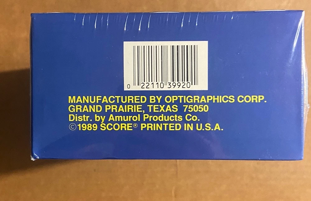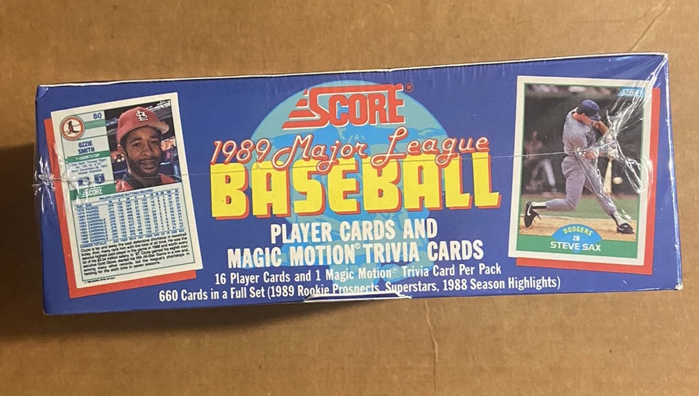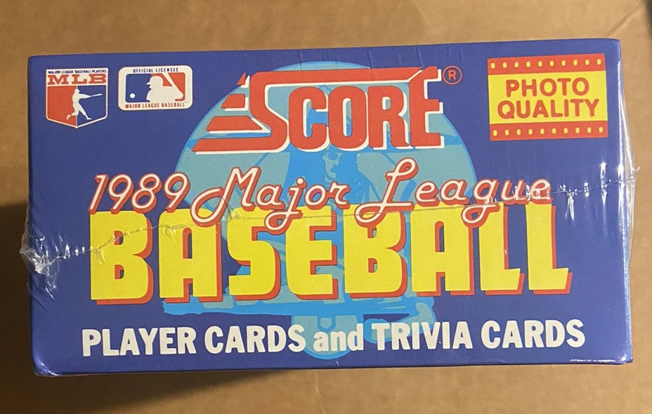 The product is a 1989 Score unopened wax box of baseball cards. It contains 36 packs of standard-sized sports trading cards from the Major League (MLB) season of 1989. The cards are part of the base set and were manufactured by SCORE. The box is a box configuration and was manufactured in 1989. This 660-card standard-size set was distributed by Major League Marketing. Cards feature six distinctive inner border (inside a white outer border) colors on the front. Subsets include Highlights (652-660) and Rookie Prospects (621-651). Rookie Cards in this set include Brady Anderson, Craig Biggio, Randy Johnson, Gary Sheffield, and John Smoltz 36 packs per box 16 cards per pack Look For Randy Johnson Rookies Look For John Smoltz Rookies Look For Gary Sheffield Rookies