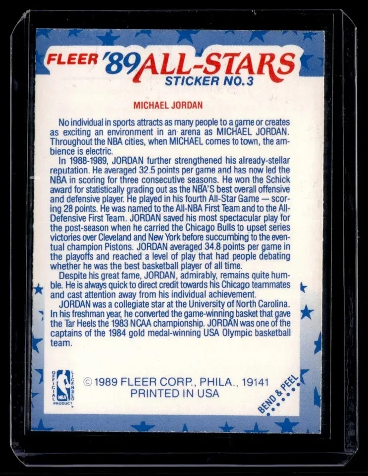 This 1989-90 Fleer All-Stars Stickers sports trading card features the legendary Michael Jordan, card number 3, and is an original, not a licensed reprint. The card is made of high-quality card stock material and is in standard size. It is a single-insert card that is perfect for any basketball fan's collection. The card is in its original form and has not been autographed or reprinted. The vintage card was manufactured by Fleer in the United States and is a must-have for any serious collector. The card features a sticker and is part of the 1989-90 Fleer set. Get your hands on this rare and valuable card today!
