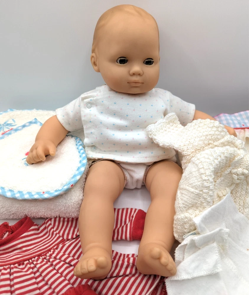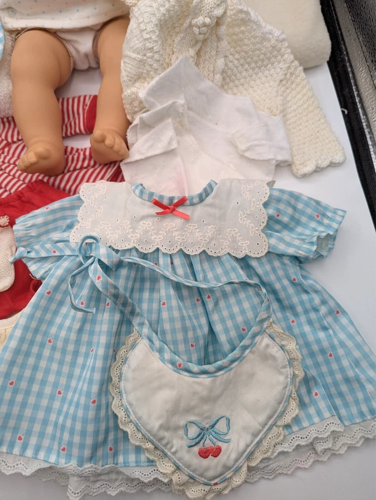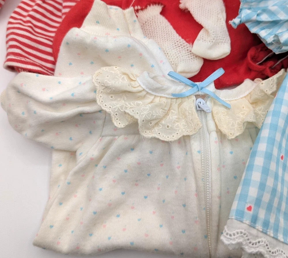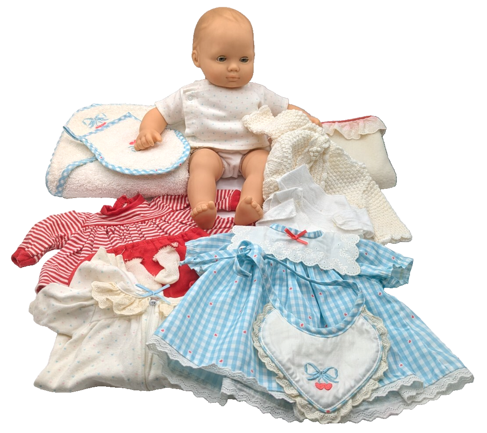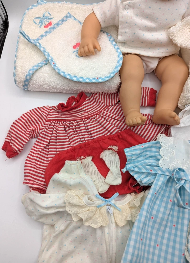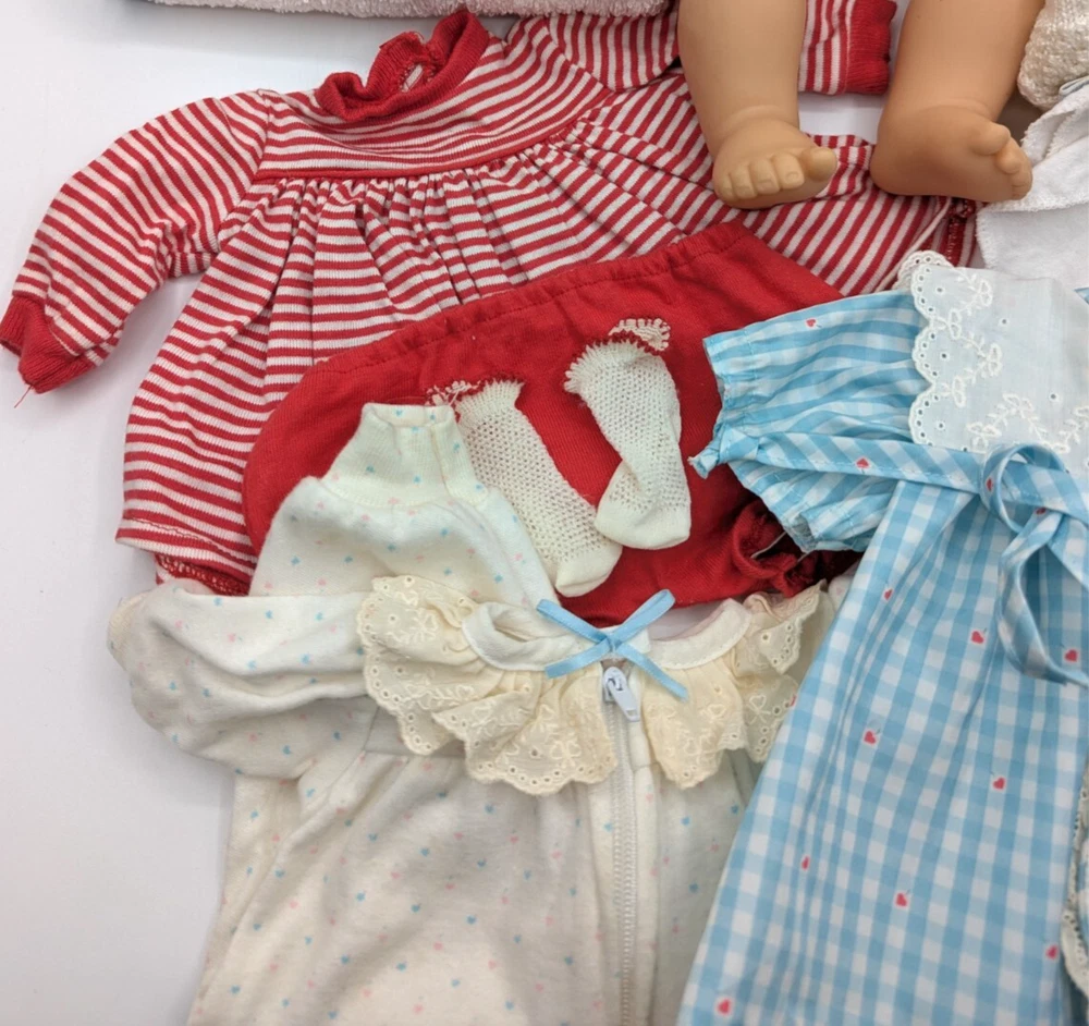 Material: Cloth Set Includes: Bag, Bib, Dress, Hat, Jumpsuit, Nightwear, Outfit, Socks/Tights, Sweater, Top Doll Type: Baby Doll Ethnicity: Caucasian Compatible Doll Size: 15" Age Level: 8-11 Years Character: Bitty Baby, Bitty Twin UPC: Does not apply Color: Multicolor Time Period Manufactured: 1990-1999 Doll Age Group: Youth Antique: No Type: Doll Clothes & Accessories Country/Region of Manufacture: Germany Year Manufactured: 1990 Handmade: No Collection: Bitty Baby Twins Clothing Style: Casual, Everyday, Loungewear, Outerwear, Sleepwear, Special Occasion, School Product Line: bitty baby Doll Size: 15 in Features: No Batteries Required Vintage: Yes Original/Licensed Reproduction: Original Clothing Type: Coat/Jacket, Dress, Jumpsuit, Nightwear, Pants, Socks/Tights, Top, Undergarment Personalized: No Doll Gender: Girl Doll Theme: Babies Occasion: All Occasions gtin13: Does not apply Brand: American Girl Franchise: American Girl