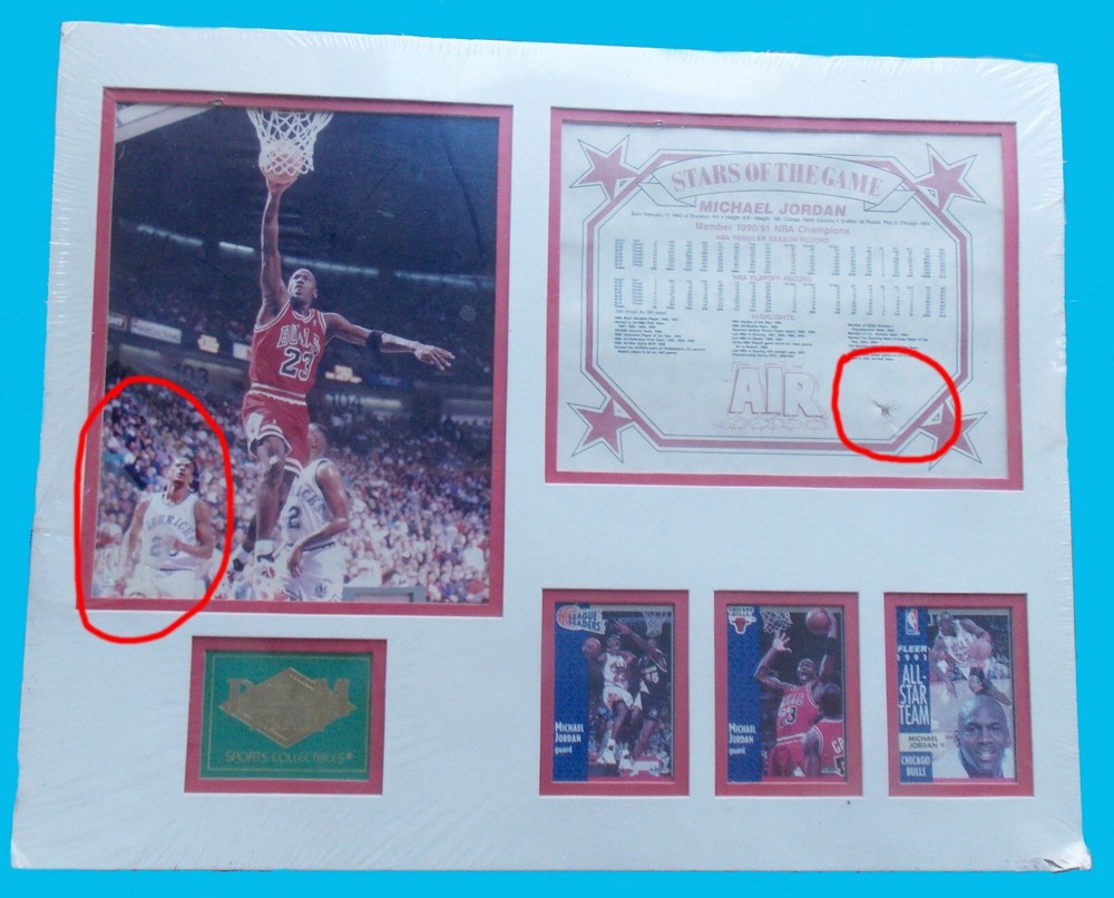 Welcome to TRADERBYNATURE Visit our TraderbyNature Store!!! We have over 100 celebrity dolls & action figures from the 1960s-80s. We specialize in helping you find that last 1970s-80s BODY, HEAD or CLOTHING ACCESSORY to complete your doll or action figure. "1990 CHICAGO BULLS -- DREAM TEAM SPORTS COLLECTIBLES -- MICHAEL JORDAN -- "MATTED" 8" X 10" PHOTO WITH STARS OF THE GAME STATS & 3 TRADING CARDS -- WITHOUT FRAME !! " This listing is for MICHAEL JORDAN "MATTED" SPORTS COLLECTIBLE only !!. tbns66 This matted collectible is 16 inches by 20 inches with: 1) MICHAEL JORDAN dunk photo (8 inch by 10 inch ) 2) Stars of the Game 1990/91 Stat Sheet History (7 inches by 9 inches) 3) Three (3) Fleer Trading Cards (2 1/2 inches by 3 inches) o 1991 League Leaders Michael Jordan Guard (Fleer #220) o 1991 Chicago Bulls Michael Jordan Guard (Fleer #29) o 1991 All Star Team Michael Jordan Chicago Bulls (Fleer #211) 4) Dream Team Sports Collectible Logo (2 1/2 inches by 3 inches) This collectible is STILL SEALED IN PLASTIC , BUT has a TEAR IN THE PLASTIC on the left side and a PUNCTURE MARK ON THE RIGHT SIDE in the Stat Sheet . This collectible is READY TO FRAME and we consider all sales FINAL . We are not an action figure or television memorabilia expert. We are selling in "AS IS" condition, but please, feel free to "ASK US" any questions you might have on this item.