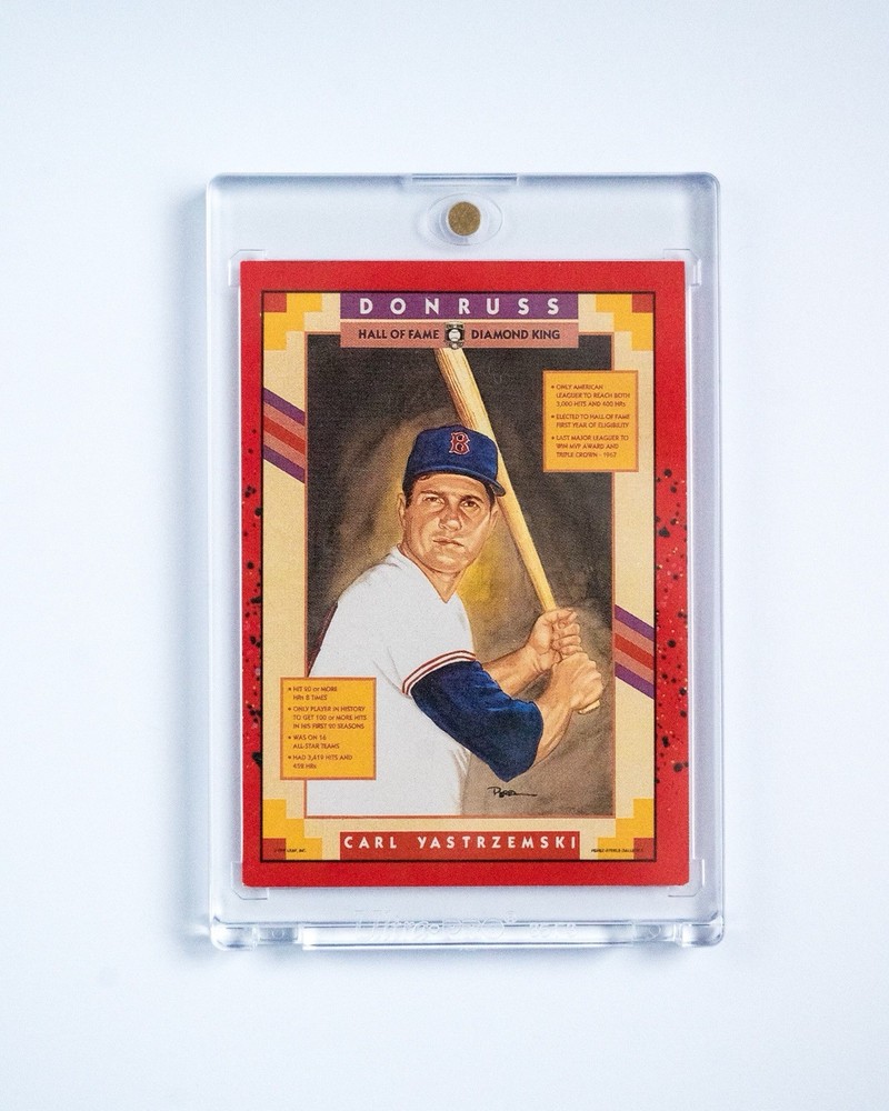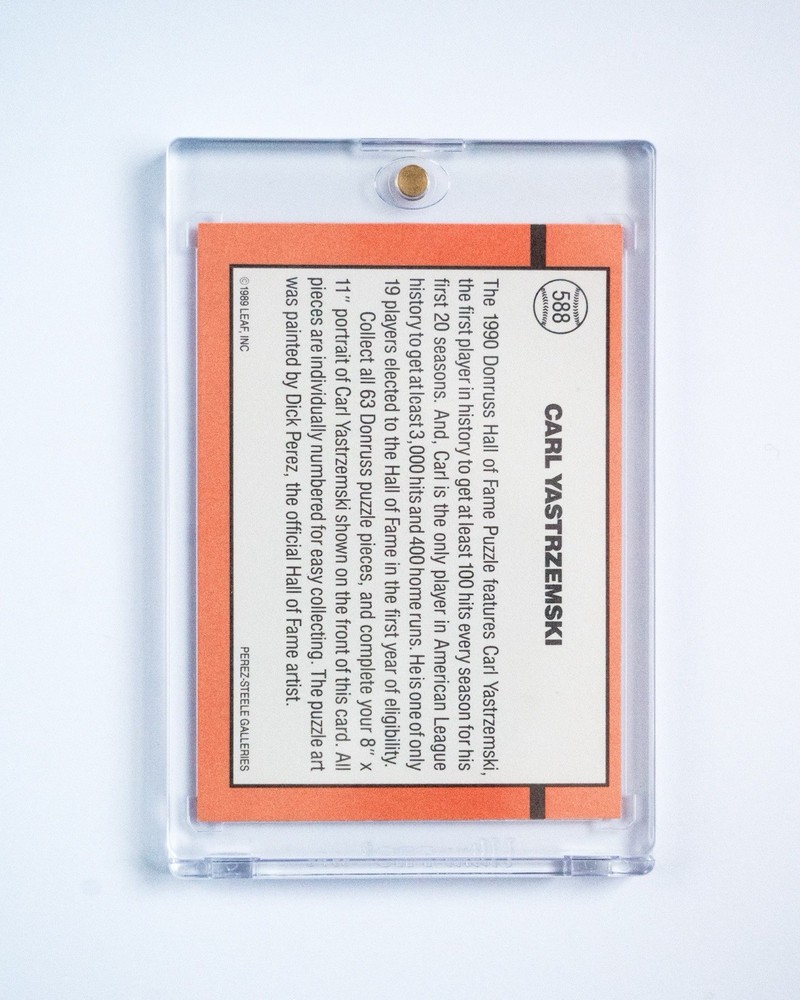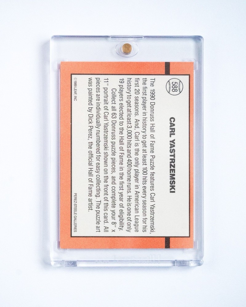 The product is a rare 1990 Donruss Carl Yastrzemski #588 baseball card with an error where there is no dot after Inc. The card features the Major League Baseball player from the Boston Red Sox, and is in near mint or better condition. This unique piece would be a valuable addition to any sports trading card collection, especially for fans of Yastrzemski or the Red Sox team. The error adds an element of exclusivity and collectibility to this particular card.