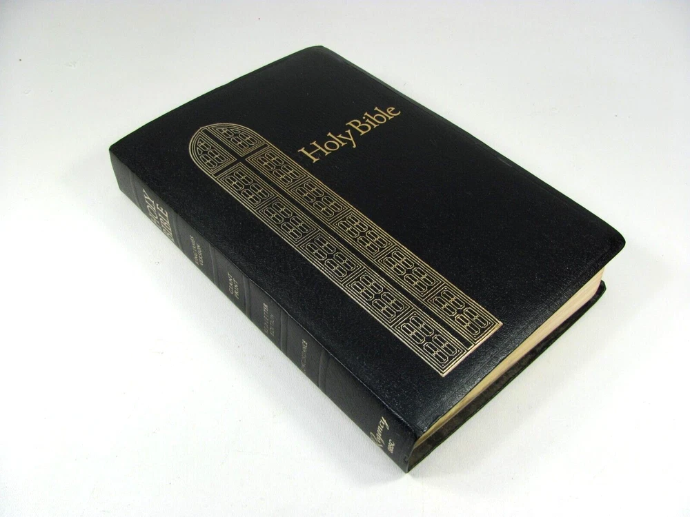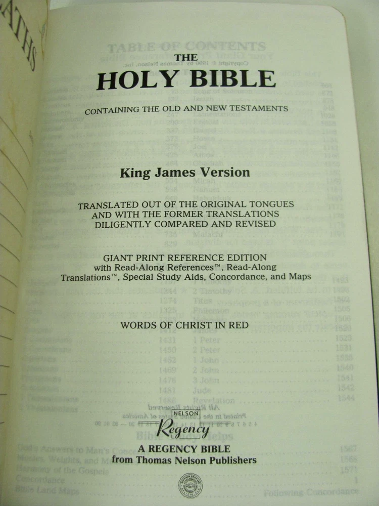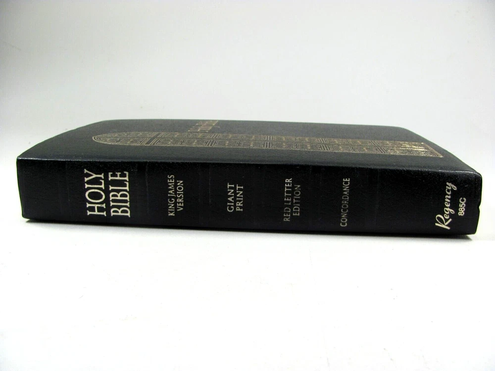 Holy Bible King James Version Regency 885C - Giant Print - Words of Christ in Red - Concordance This is a lovely bible, in very nice condition. Published in 1990 by Thomas Nelson. Black soft cover with gold lettering and gold page edges. The pages are clean and smooth with no marks. The spine is firm with no creasing. The back cover has some small, thin white scuff marks - shown in photos.