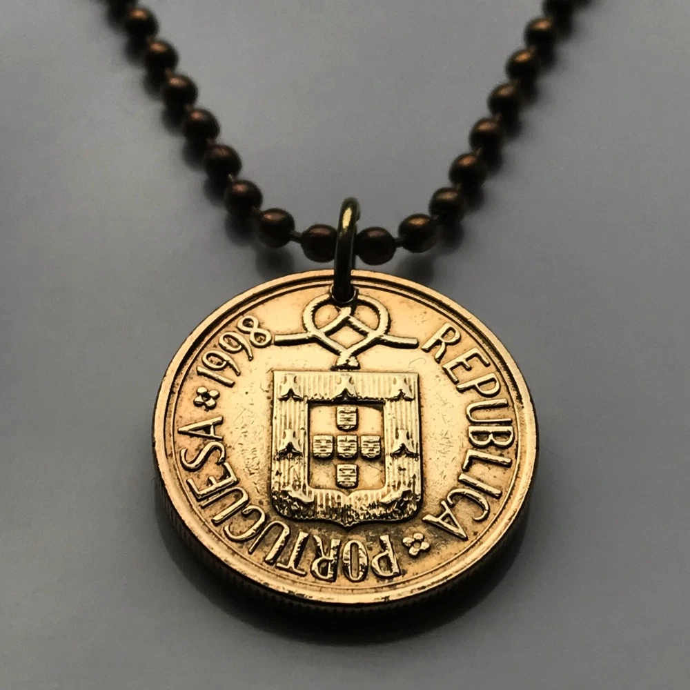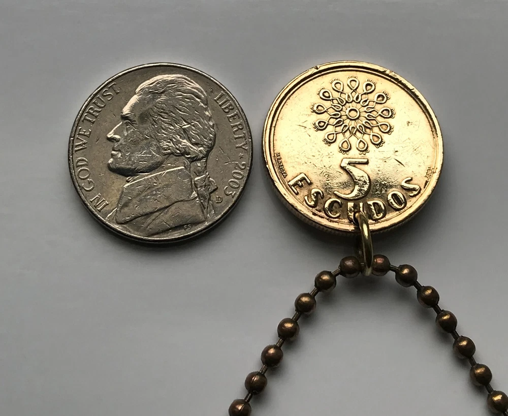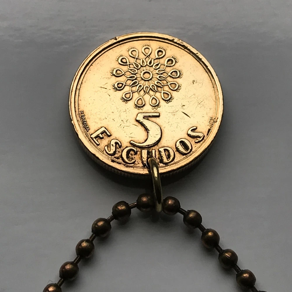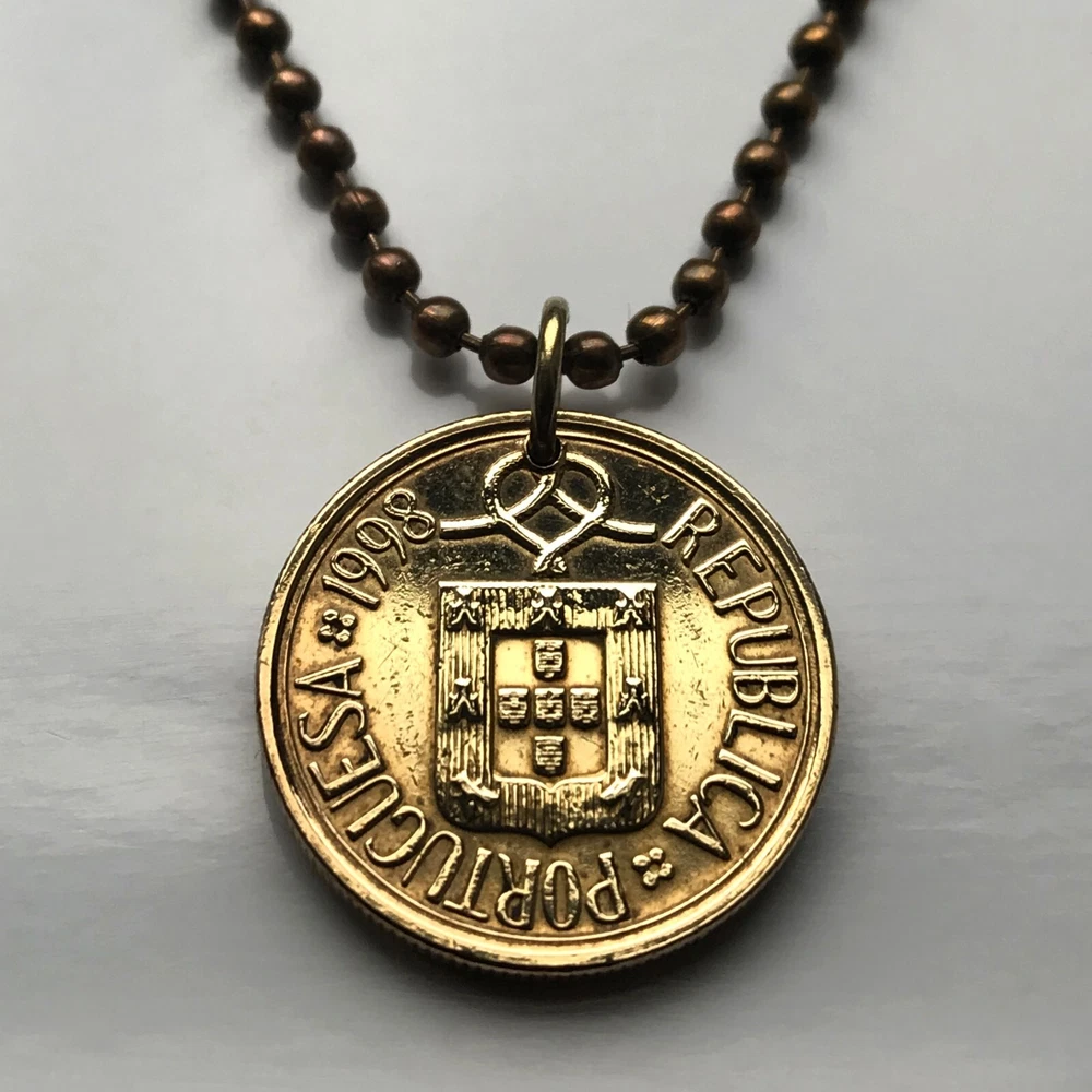 Portugal 5 Escudos {1986-2001} 5S FEATURING front: The coat of arms of Portugal {5 Quinas} and a knot Lettering: REPUBLICA PORTUGUESA After the official recognition of the Kingdom of Portugal as an independent country in 1143, 5 silver bezants were added to the blue cross of the shield, symbolising coins and the right of the monarch to issue currency. Late explanations interpret them as the five wounds of Jesus Christ, also a traditional legend explains that these escutcheons represent the five moor kings defeated by King Afonso I of Portugal in the battle of Ourique. From the fixation of the number of bezants in five, each of the escutcheons of the Portuguese shield became popularly referred as a quina (quincunx). By synecdoche, the term "Five Quinas" or simply the "Quinas" came to be used. The golden castles surrounding the quoins supposedly represent the Moorish castles conquered by the Kingdom of Portugal during the Reconquista. Their origin is probably Castilian. back: A stained glass window • quantity 1 • demonetized {no longer in circulation} polished Nickel brass coin • diameter: 21 mm • weight: 5.4 g • comes with a 24" brass ball chain Portugal coin pendant necklace Portuguese fashion jewelry 5 Quinas castles Lisboa Oporto Sintra Braga Quincunx cross Coimbra Évora Faro Santa Maria de Belém Douro River Mirandese Iberia Castilian Vila Nova de Gaia Guimarães Pena Palace castle Algarve Praia da Marinha Lisbon Porto Vasco da Gama age of discovery seas atlantic ocean ship anchor caravela carrack <