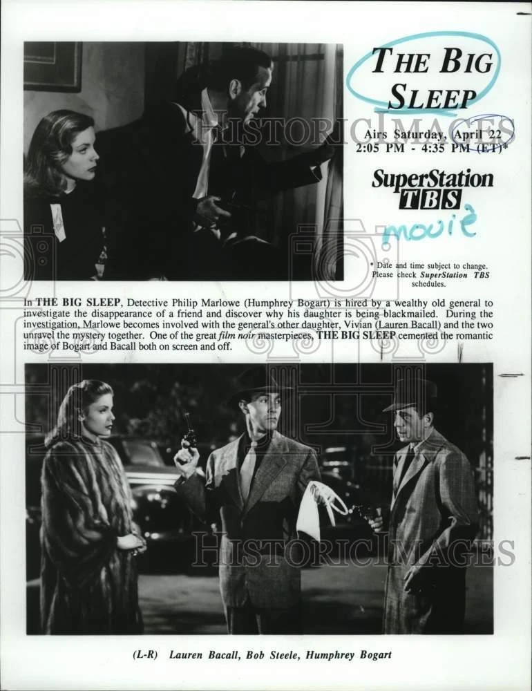 ebay template Note: Please study the images carefully to determine the condition of this vintage photograph, as it may not be in perfect condition. It may contain wrinkles, cracks, and possibly even tears due to its age and how it was handled before it got to us. A scanner may interpret colors and contrast differently than human eyes will, so it is possible that the actual photograph may be slightly darker or lighter in person. This vintage photograph is offered for sale as a collectible item and conveys no transfer of copyright. 1990 Press Photo Actor Humphrey Bogart, co-stars in "The Big Sleep" Movie This is an original press photo. In "The Big Sleep," Detective Philip Marlow (Humphrey Bogart) is hired by a wealthy old general to investigate the disappearance of a friend and discover why his daughter is being blackmailed. During the investigation, Marlow becomes involved with the general's other daughter, Vivian (Lauren Bacall) and the two unravel the mystery together. One of the great film noir masterpieces, "The Big Sleep" cemented the romantic image of Bogart and Bacall both on screen and off.Photo measures 8 x 10.25inches. Photo is dated 04-10-1990. PHOTO FRONT PHOTO BACK Historic Images Part Number: syp42254 FAQs Q: Can I just download a digital version instead? A: No, we sell only vintage originals and do not make or distribute any copies, including digital ones. Q: Do you combine shipping and invoices? A: Multiple photos won on the same seller ID combine automatically through the eBay checkout process. If you encounter problems with this, send us a message via eBay messaging and we will send you an invoice. Due to eBay limitations, we cannot combine items won on our different seller IDs for a single shipping charge. Q: How quickly do you ship the items once paid? A: We ship within one business day after your payment clears. If you do not receive an "order shipped" email from us by the close of the second business day from submitting payment, please e-mail us via eBay messaging. Q: How do you make sure my photograph arrives safely? A: We package each order between two cross-corrugated pieces of cardboard to ensure that the package is as difficult to bend as possible. We then wrap each order in a plastic sheet to help protect against moisture. We want you to rest assured that we take every precaution to ensure that the photograph you receive will be in the same condition in your care as it was in ours. Q: Will the "Historic Images" watermark be on my photo when I receive it? A: No. This is a digital watermark we use to protect our images. It is not printed on the photo. Q: What are your office hours? A: eBay for us is a business, and a very fun one to be in! We are open M-F 9 to 5 (CST). Therefore, we do not return e-mails and phone calls over the weekend. We observe the following holidays: New Years Day, Memorial Day, Fourth of July, Labor Day, Thanksgiving and the day after Thanksgiving, Christmas Eve and Christmas Day. Q: Where did all these vintage photos come from? A: These original vintage photographs are from various news service and newspaper photo archives from locations around the country including: Boston, Detroit, Tampa, Chicago, Denver, Seattle, New Orleans, Milwaukee, Portland, Spokane, and more. We do not copy or reproduce any photographs -- every item is a unique vintage piece that was housed in a news archive. Q: Can I use this photograph in my book/blog/website? A: The short answer is no. There is no transfer of copyright for republication or reproduction with these photographs when you purchase them, and only photographs taken before 1923 are currently automatically in the public domain. Permission from the copyright holder, which usually can be identified from the back of each photo, must be sought to republish or reproduce the image for any purpose. Q: Do you relist items (in case I miss an auction ending)? A: Auction items that receive no bids are relisted in our store (historicimages-store on eBay) as a fixed-price item and at a higher price than the starting auction price. Q: Do you leave feedback? A: Yes, we always leave feedback for buyers. Our software monitors when our buyers leave us feedback, then notifies us that we can leave feedback for the buyer. Rest assured, if you leave feedback, we will do the same! Check out our family of eBay IDs: historicimages01 Sports Photos historicimages02 Entertainment Photos historicimages03 Americana Photos historicimages04 International & War Photos historicimages05 Transportation Photos historicimages06 Photos of All Subjects historicimages07 Entertainment Photos historicimages08 Newsworthy Photos historicimages09 Entertainment Photos historicimages10 Sports Photos historicimages-store Our largest fixed-price selection historicimages-gallery Hand-picked photos Saturday night auctions About Us Historic Images was formed in September 2009, with a handful of scanners working out of a basement to digitize newspaper photo archives. We have since moved out of the basement, and we can now archive thousands of photos per day. Our company has worked with magazines and newspapers from Detroit, Boston, Denver, Seattle, Tampa, Chicago, and New Orleans, just to name a few. We are constantly adding to our inventory, and have assembled an archive of millions of photos to date. As our company evolved, we began our eBay business, which brings thousands of fresh auctions per week to the world's largest online auction marketplace. Our custom software systems and team of great employees allow us to efficiently scan and sell large photo archives online. At the very core of our company's DNA is a strong commitment to customer satisfaction and strict integrity for our product. Our promise to you is that we will do everything in our power to provide you a great buying experience. Copyright 2009 - Present, Historic Images, Inc. Sell Smarter with Kyozou. Inventory and Ecommerce Management